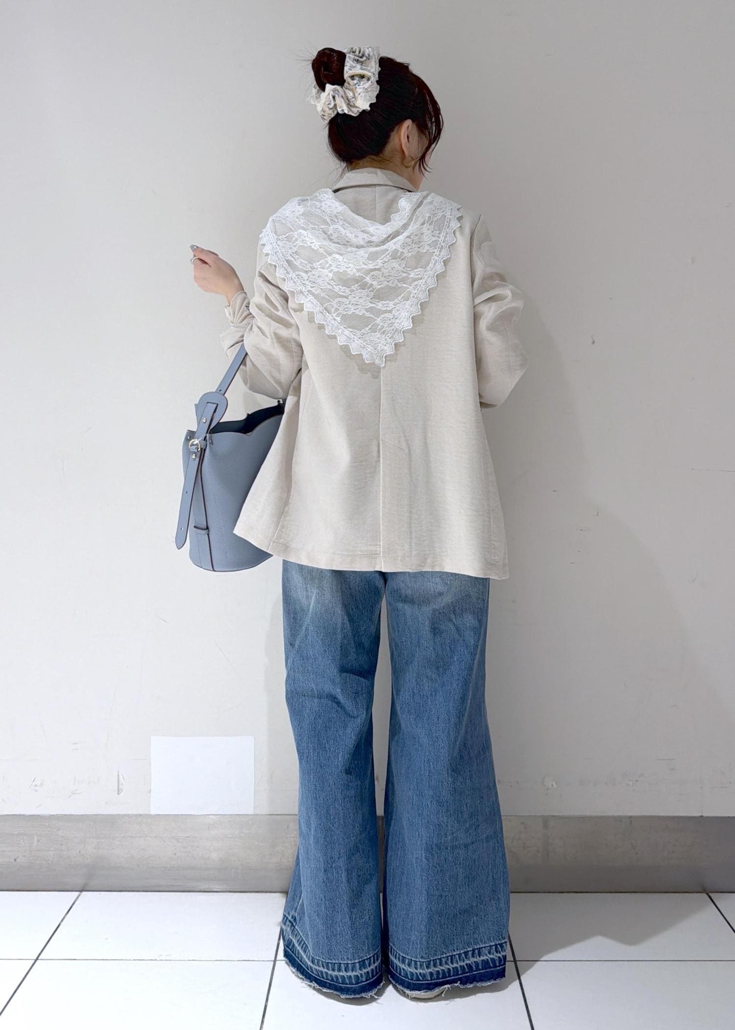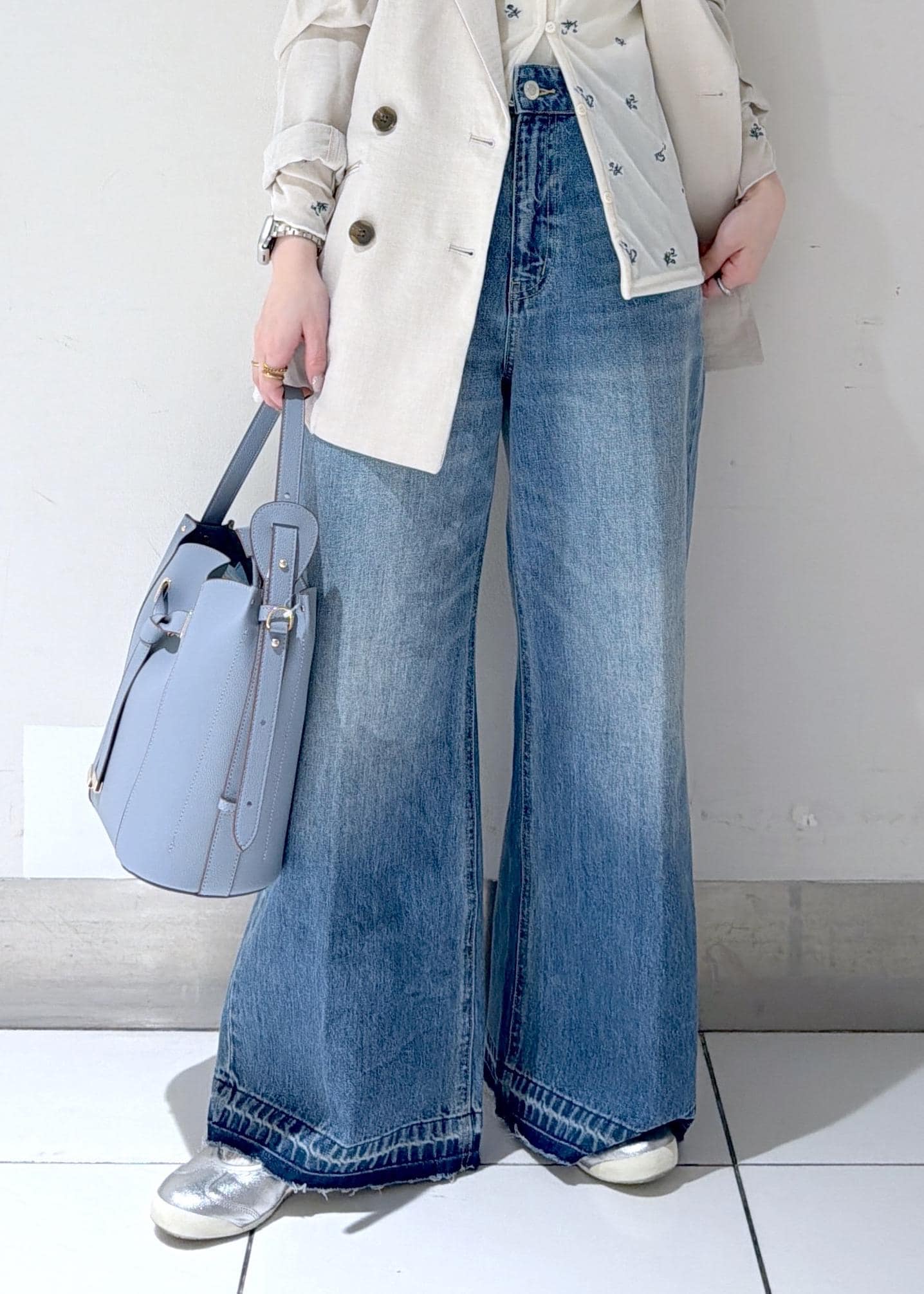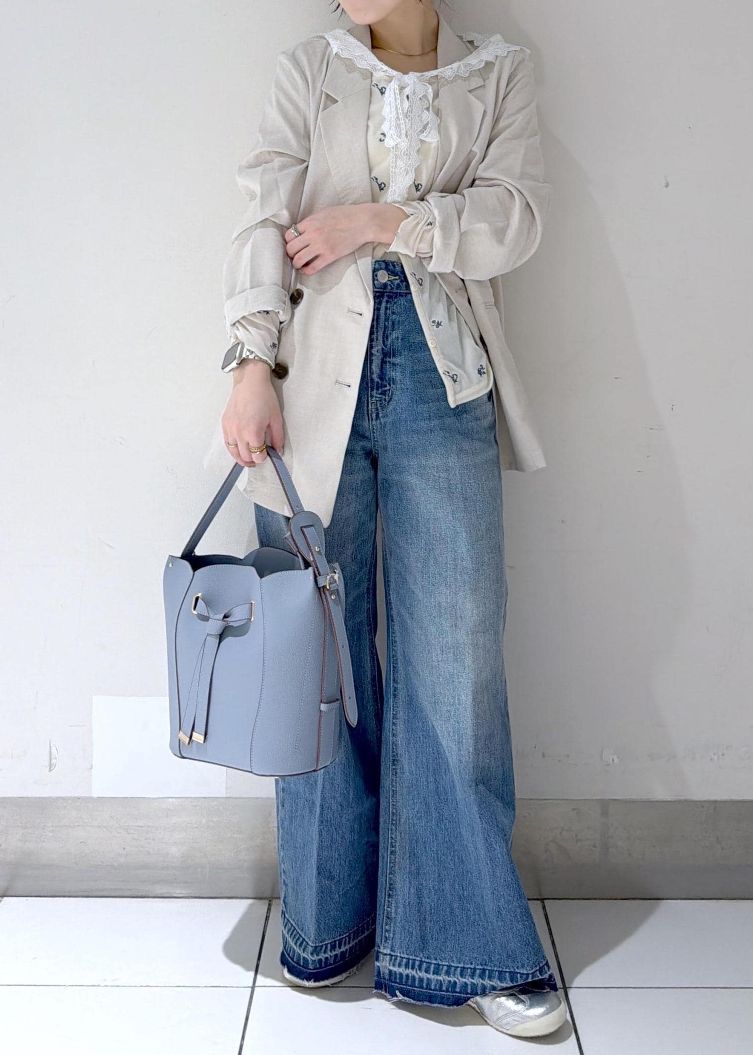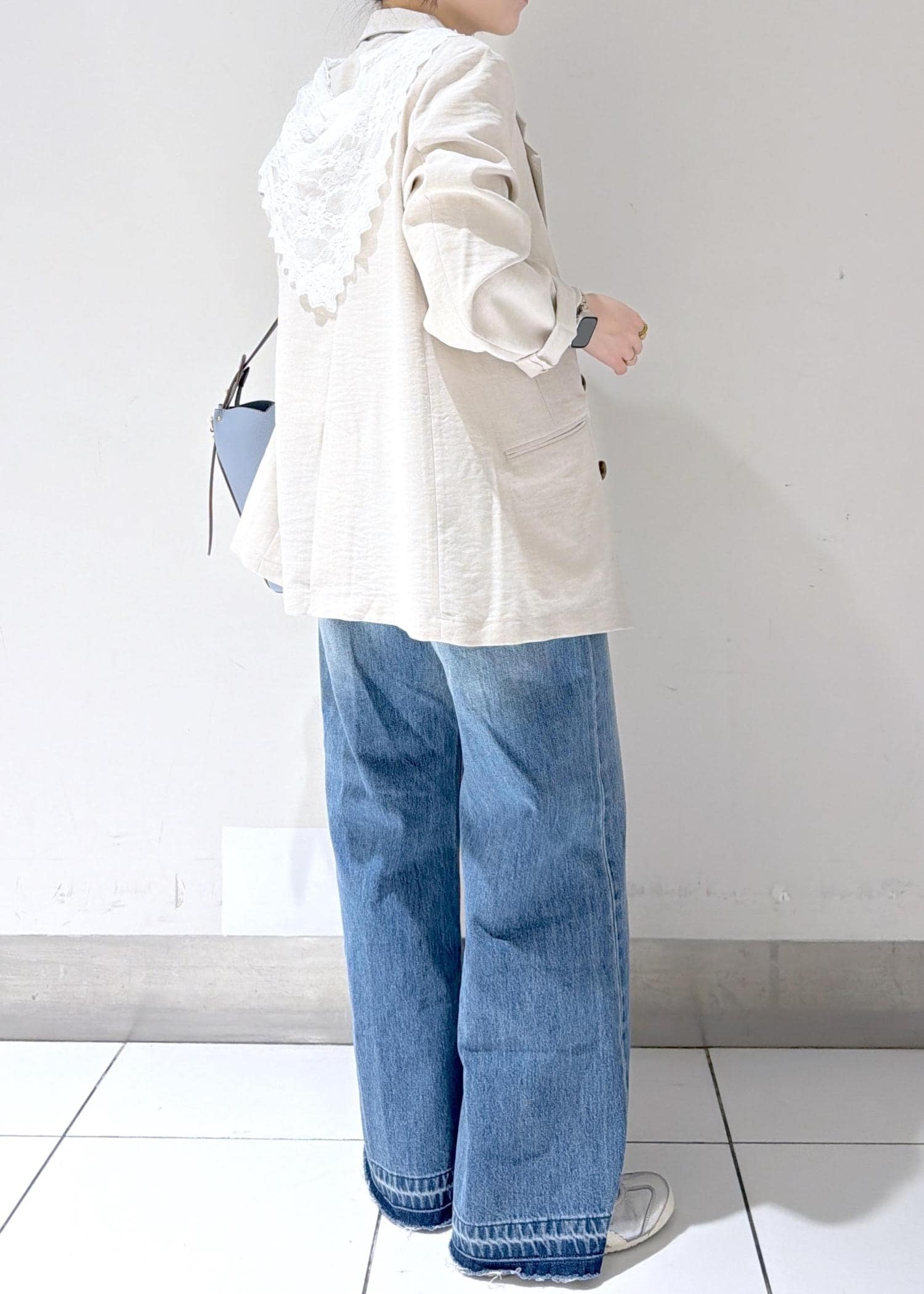 ワイドデニムで抜け感を出しつつ、レースデザインで女性らしさもプラス✨
