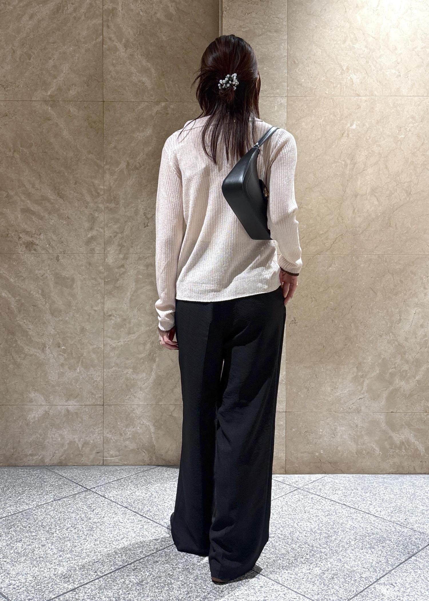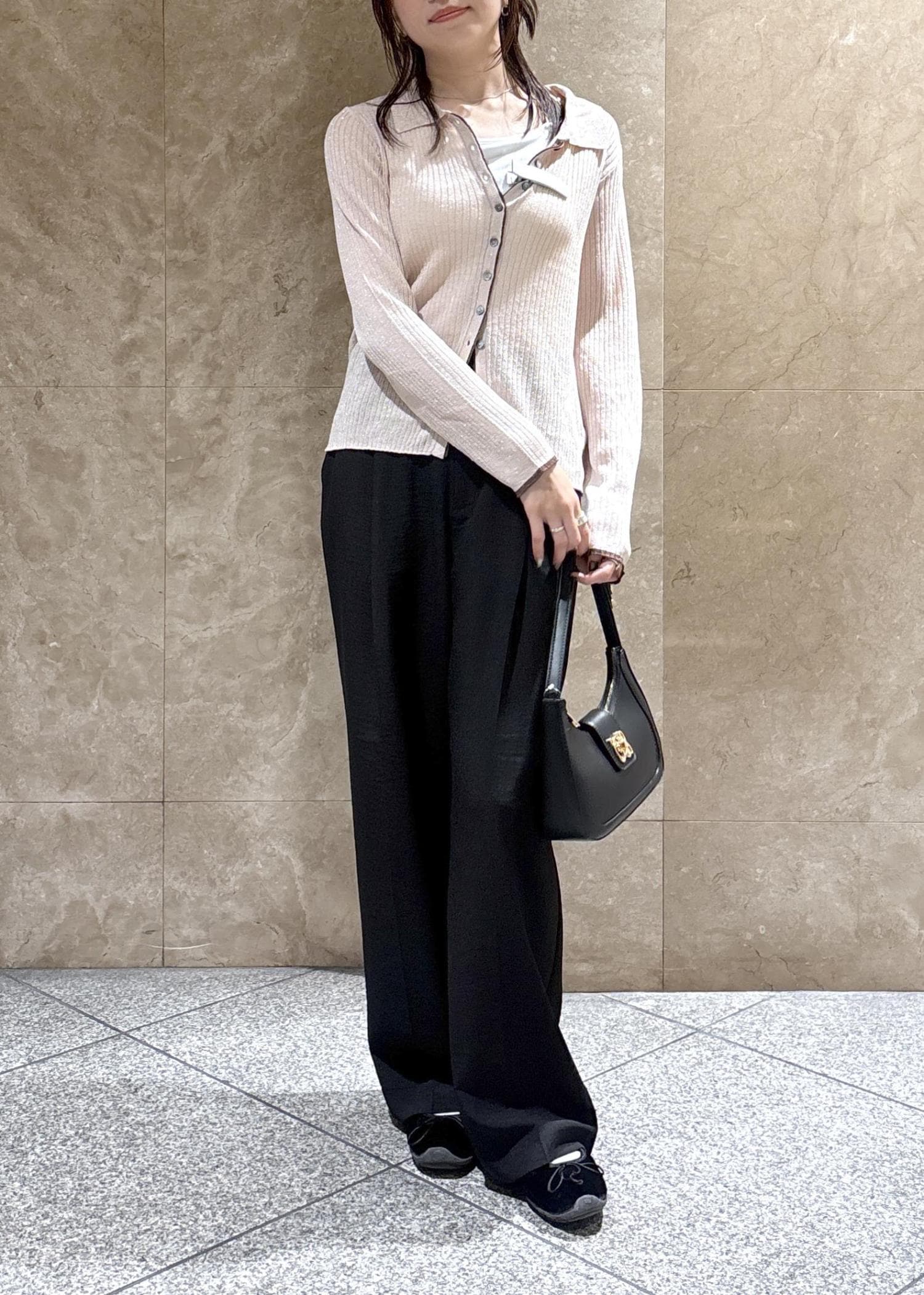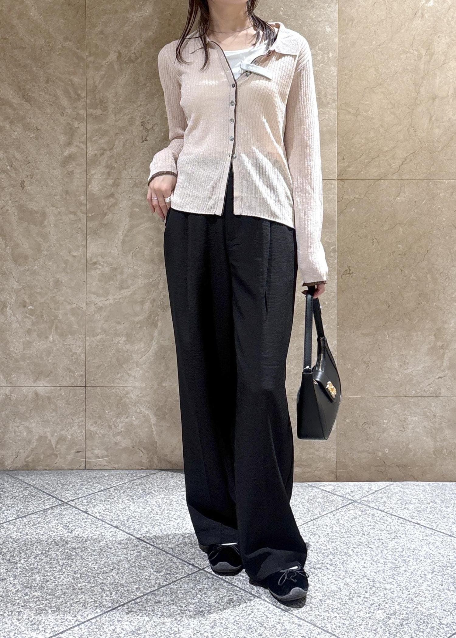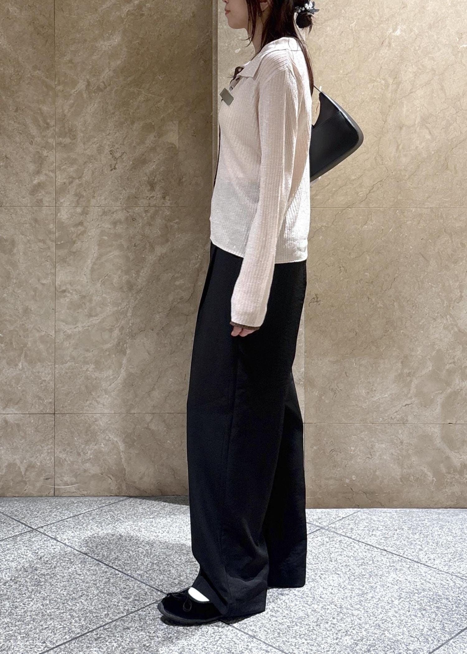 着丈はしっかりハイウエストで履くと踵が隠れる長さでフラットシューズでも下につかないくらいの長さです。 -