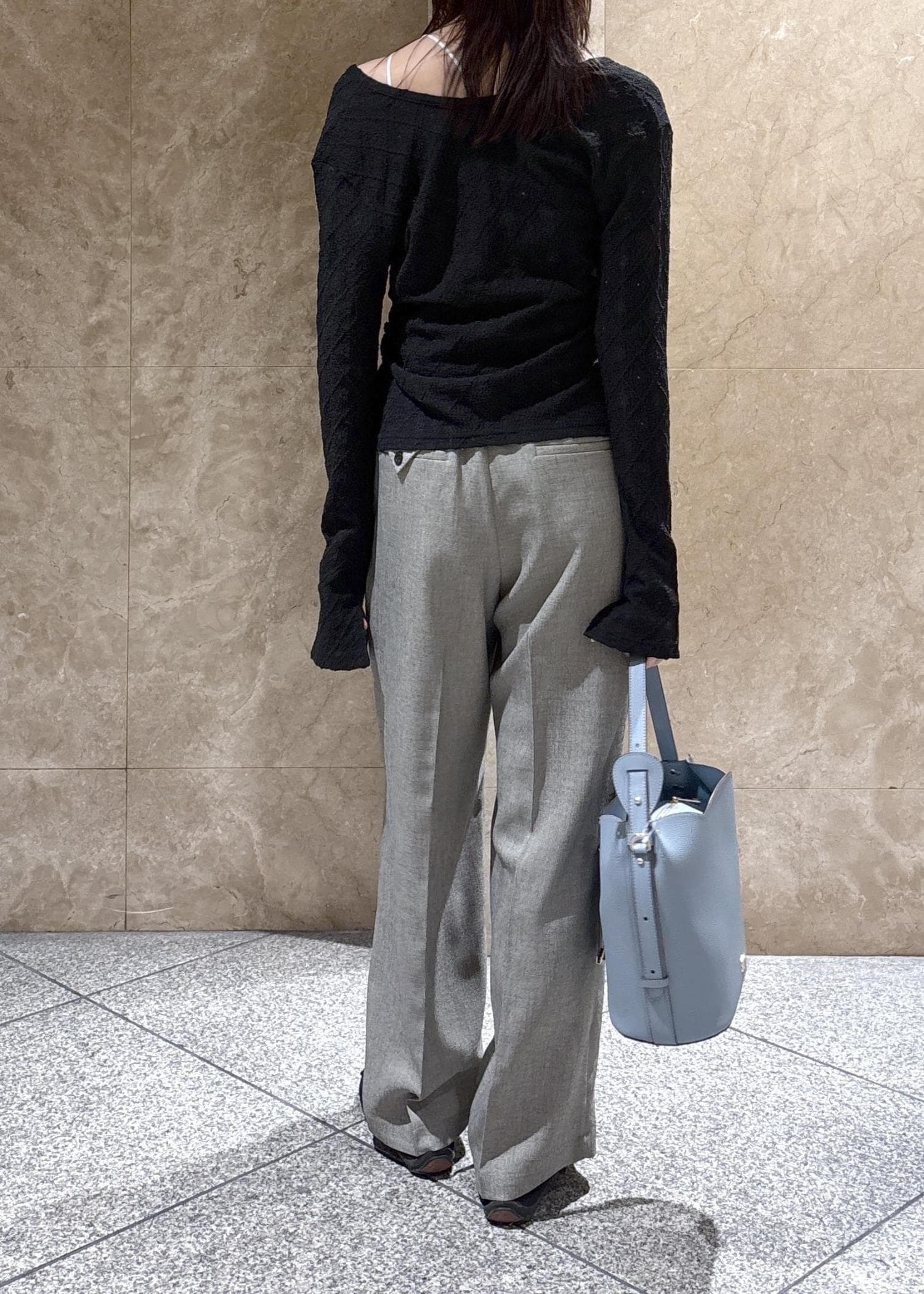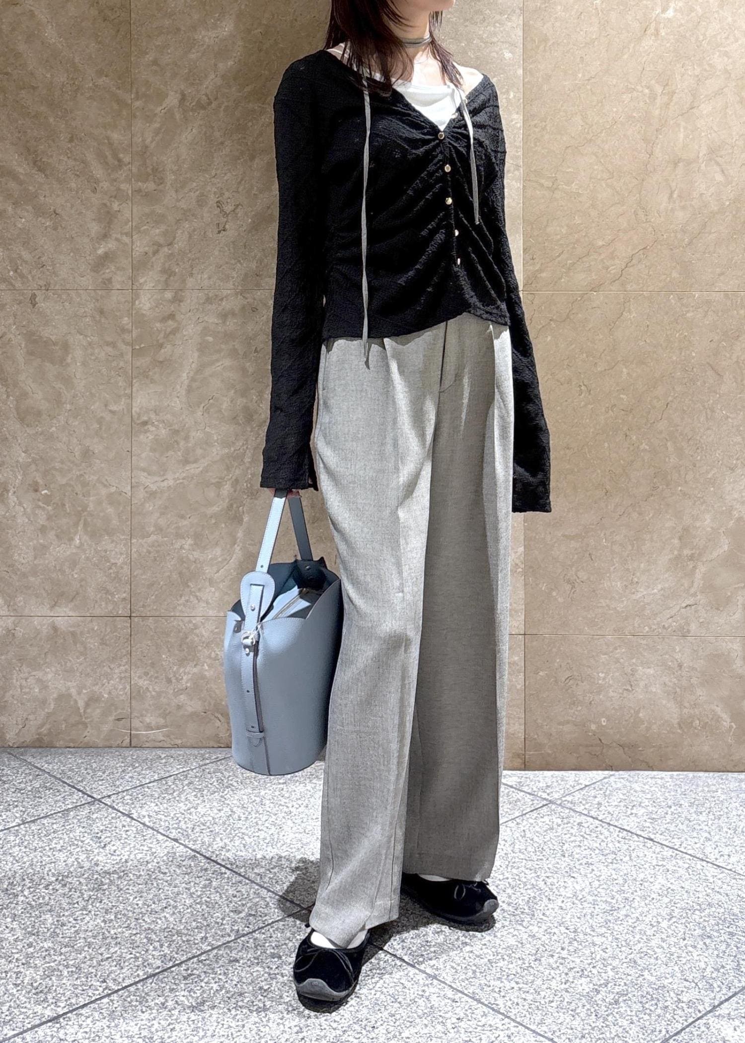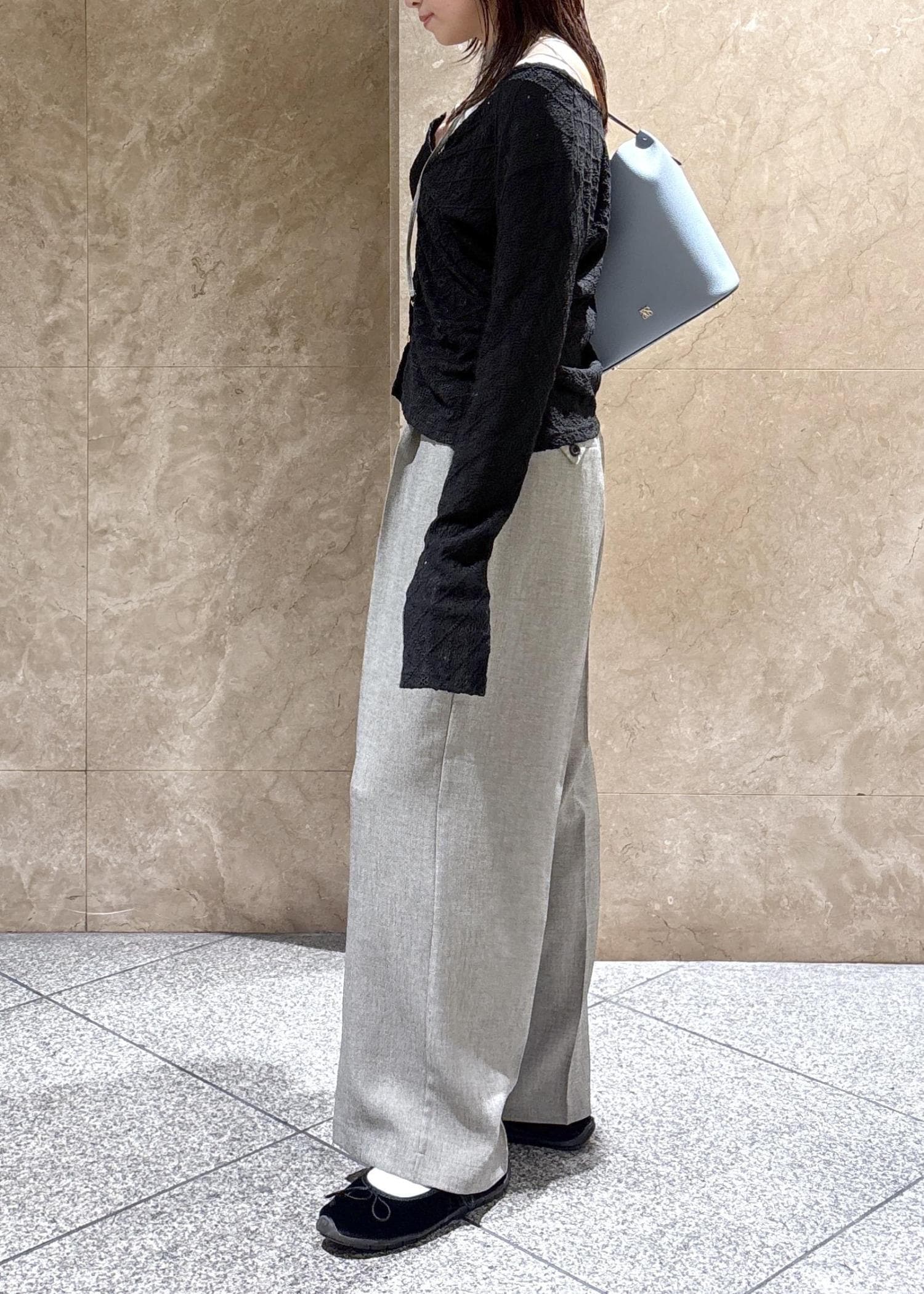 着丈はしっかりハイウエストで履くと踵が隠れる長さでフラットシューズでも下につかないくらいの長さです。 -