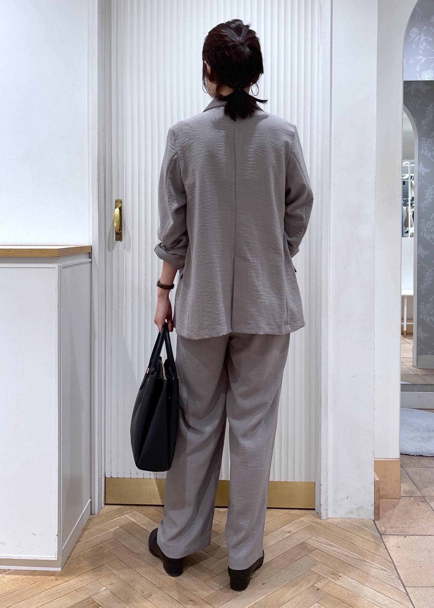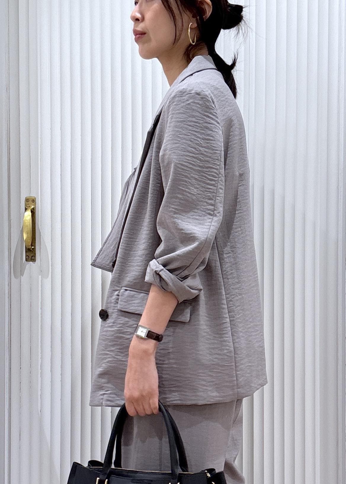柔らかい素材で、裏地なしなので肩周りも落ち感があり身体のラインをすっきりみせてくれますよ。 -