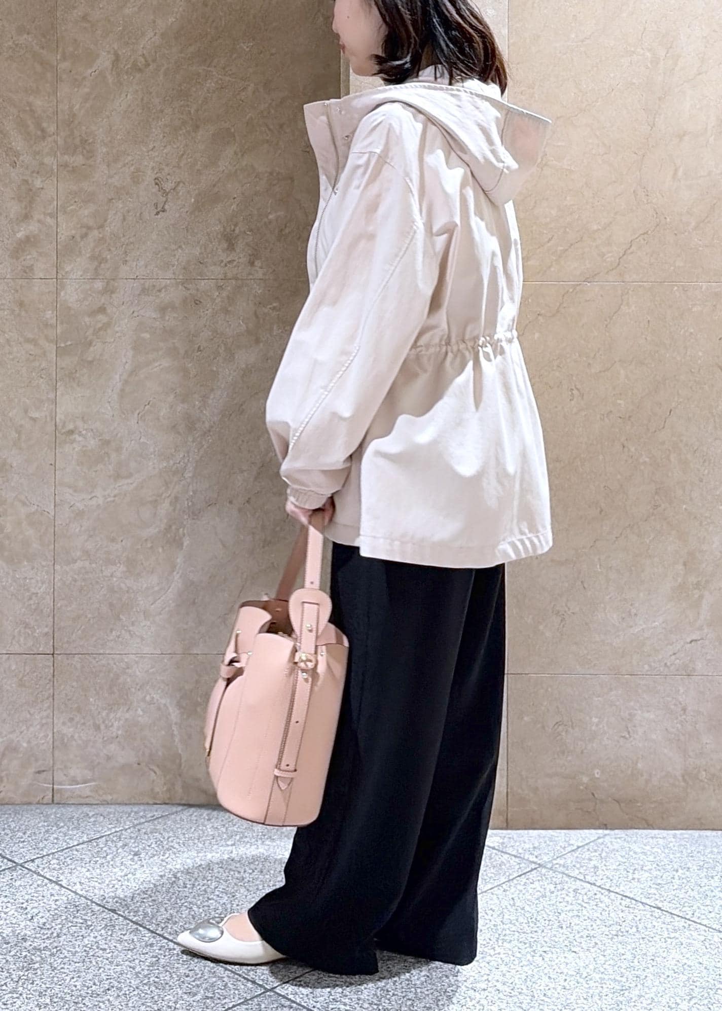 ウエスト部分をドロストで絞ったり広げたり出来るのも、お洋服に合わせて変えれるのでとても便利です!