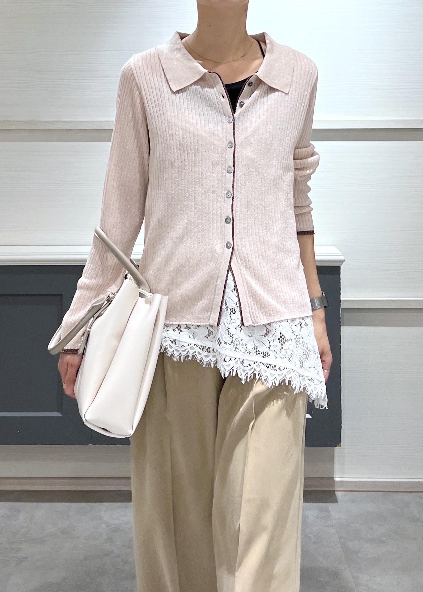 ポロ襟配色シアーリブカーディガン/イージーケア