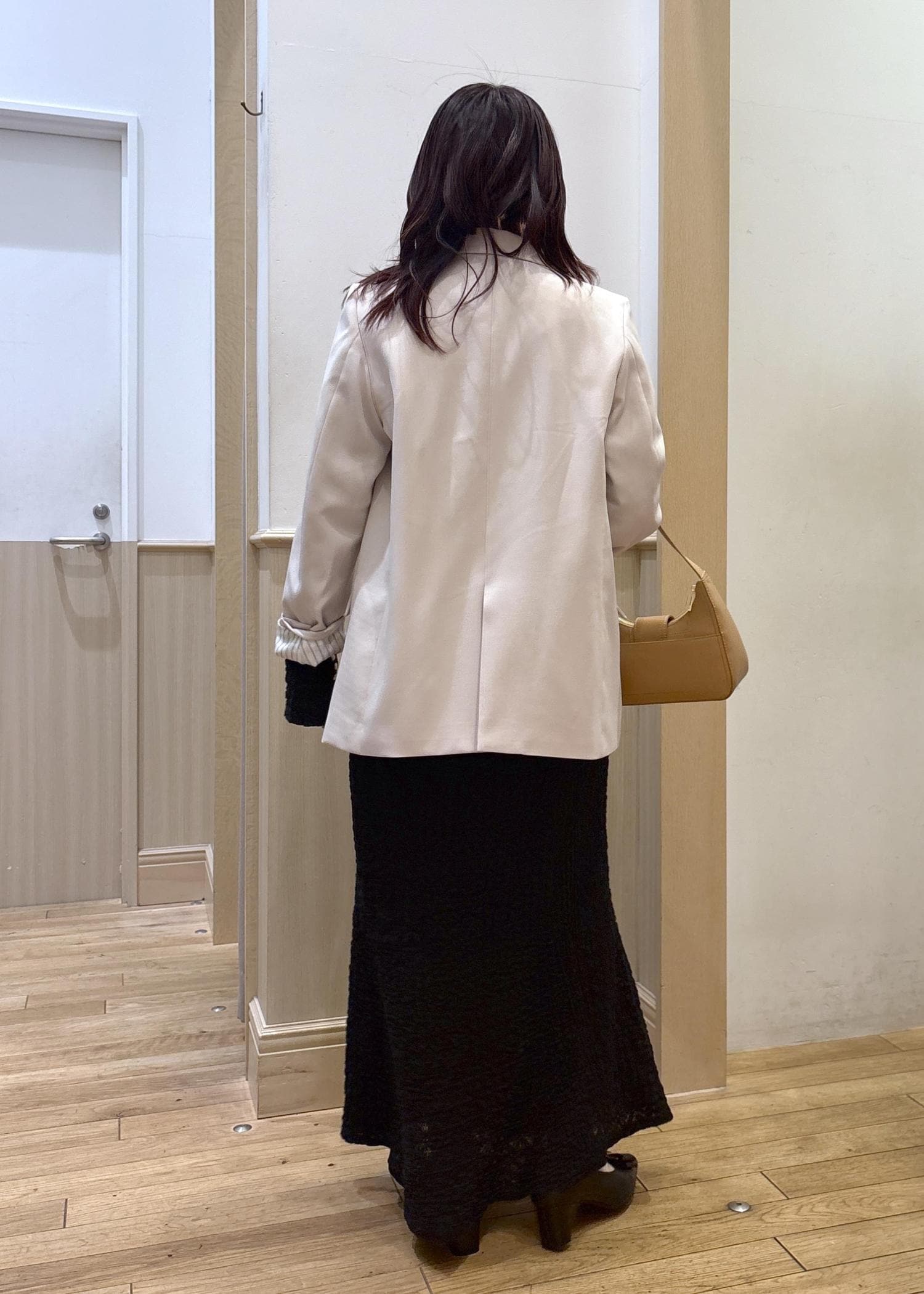 お尻にかかるくらいの長さで安心して着用いただけます。ウエスト、肩幅も大きすぎることも小さすぎることもなく、たいていのブラウスや薄手ニットはSサイズでも形を拾わず着用できました!