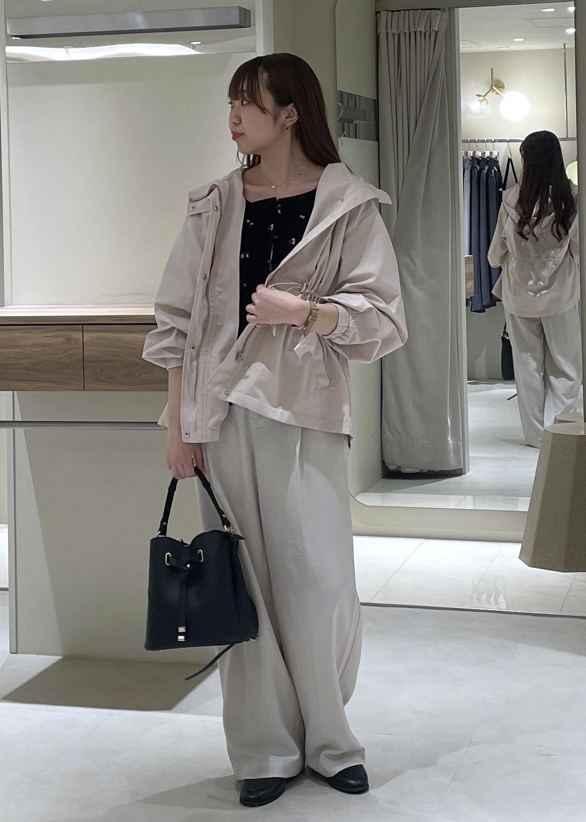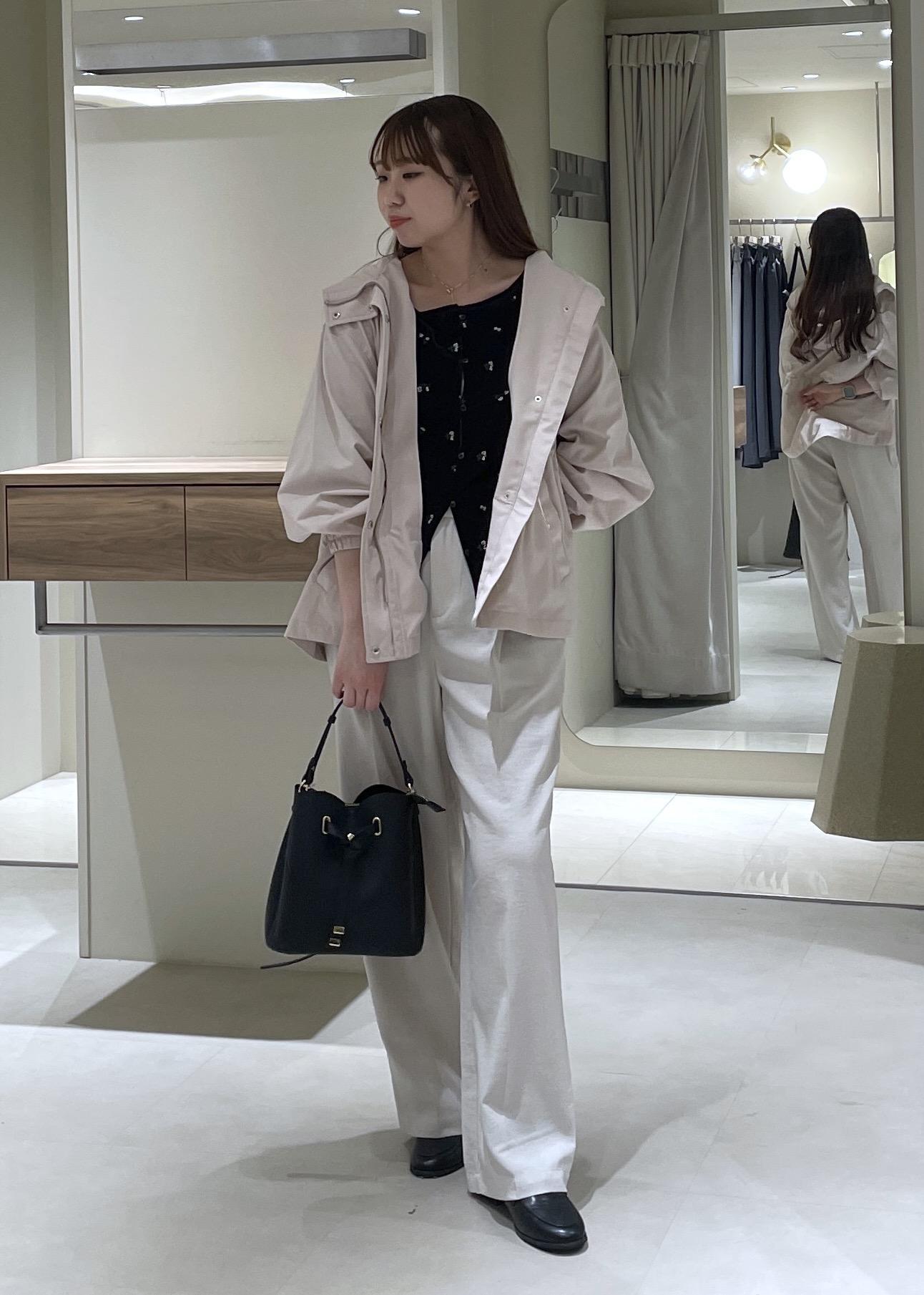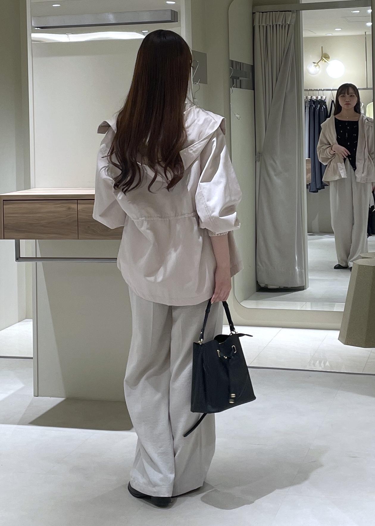 春から夏の終わりまで使っていただける麻風素材で、薄手で着た感じもとても軽いです。ボタンでウエスト調整可能な点も推しポイントです。 -