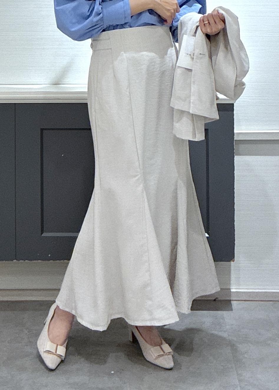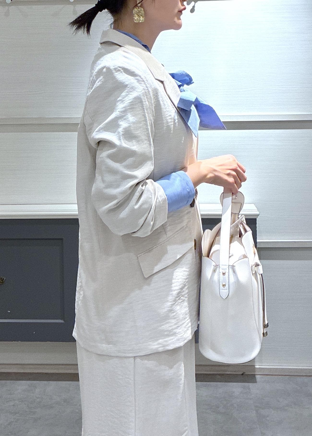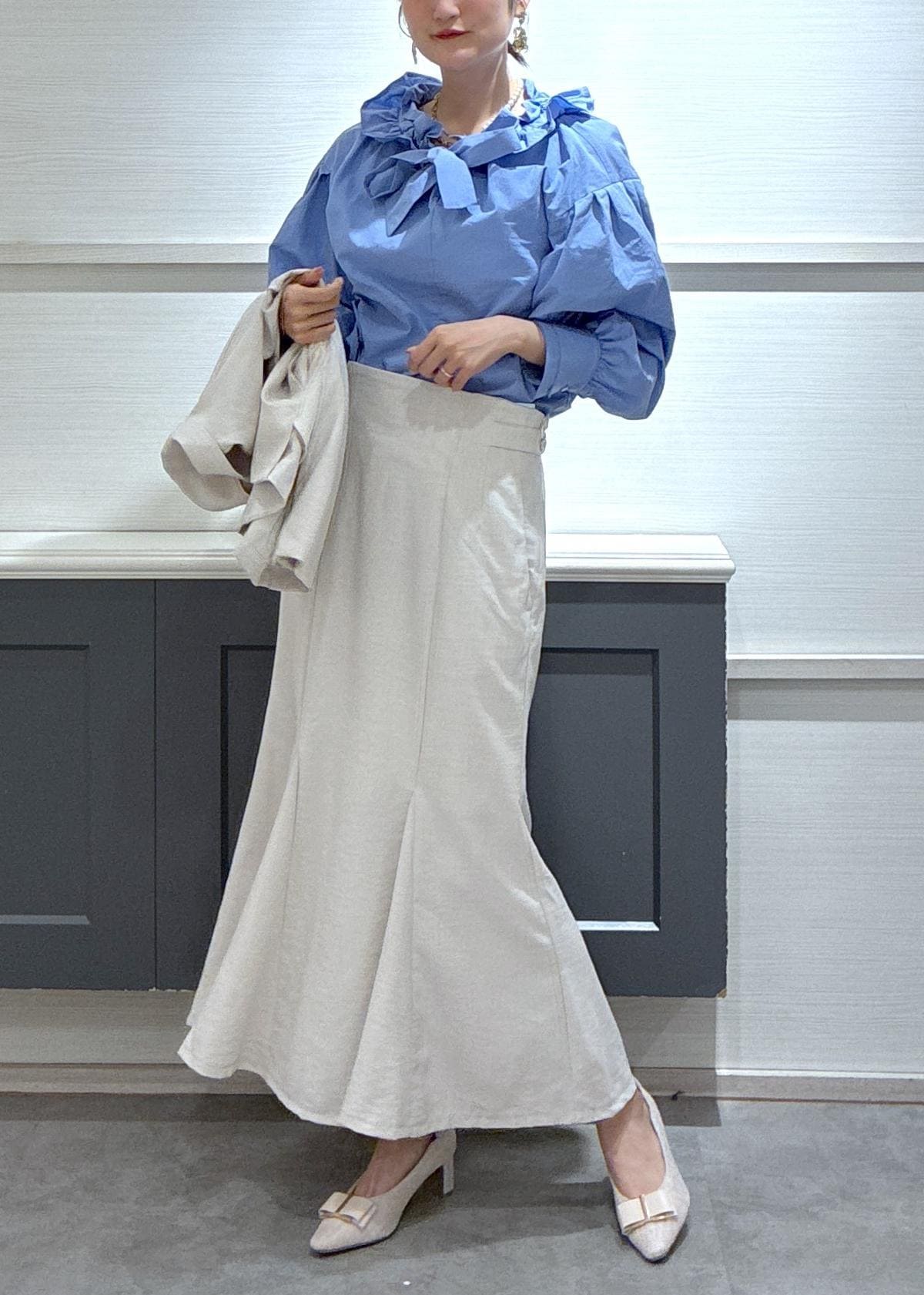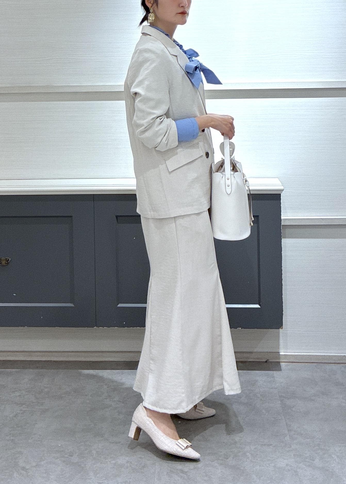 ブルーのブラウスを選ぶとセットアップの優しいホワイトカラーを引き立ててくれました♡