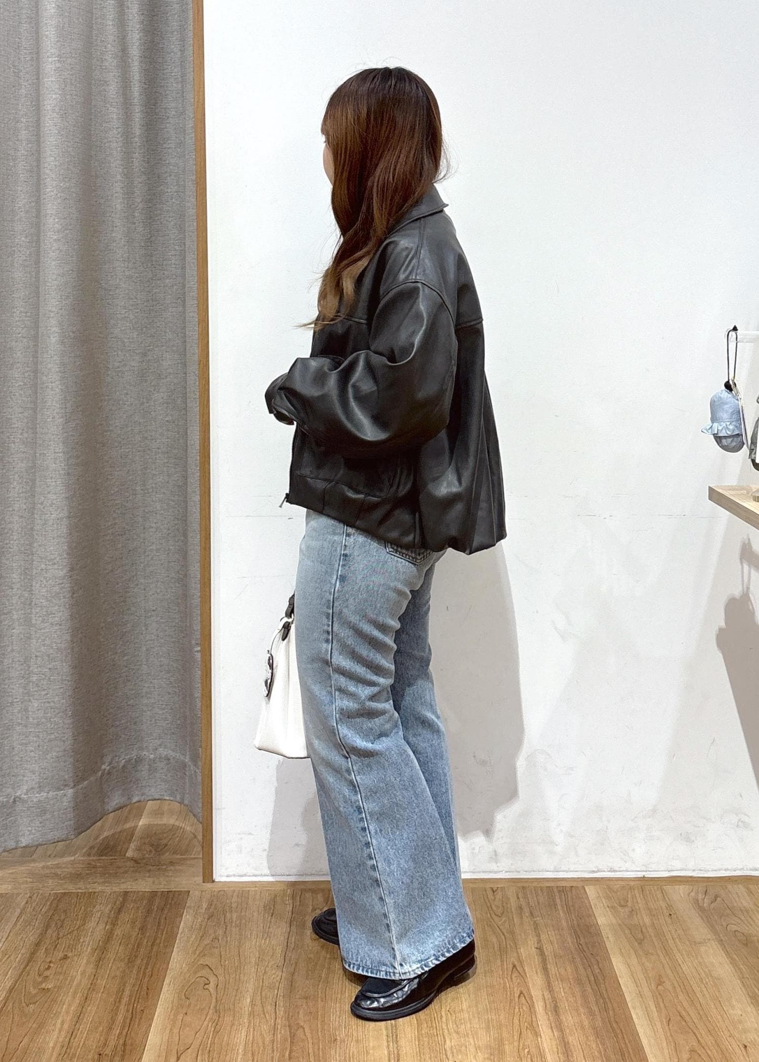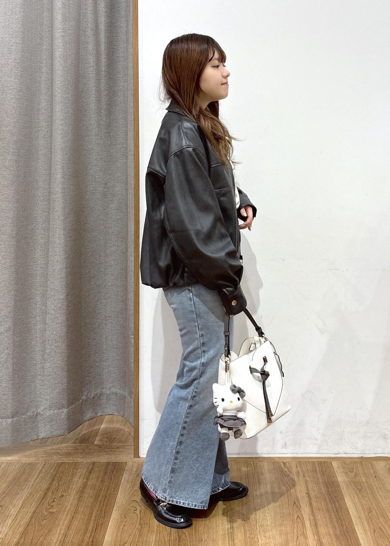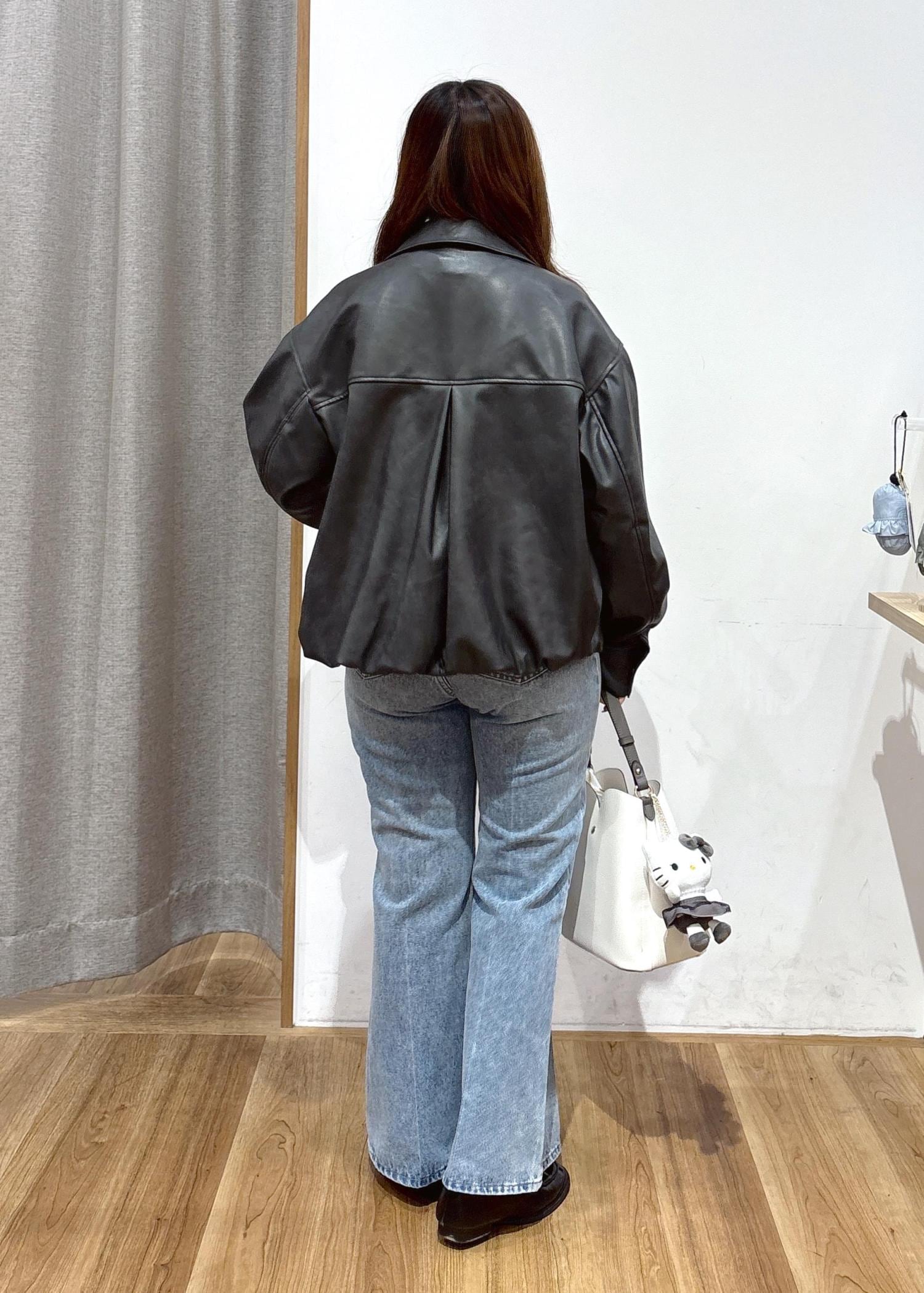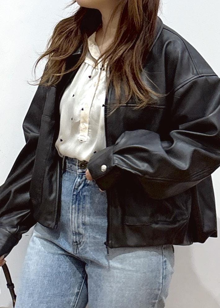 甘く柔らかな印象のデニム×ブラウスのコーディネートに、合皮ジャケットを合わせてすっきりとまとめました。