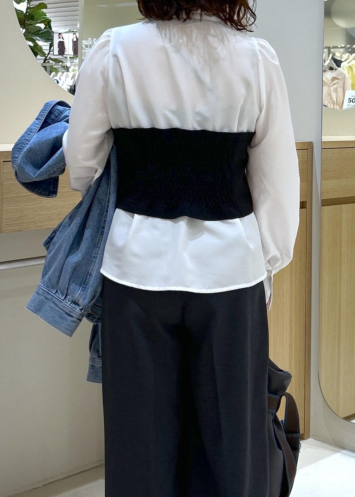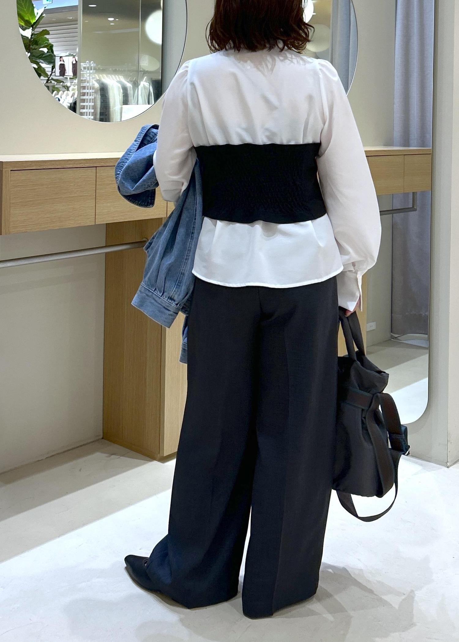 ウエスト後ろ部分にシャーリングがあり程よくシェイプされるので、バックスタイルもスッキリとした印象で細見えします。 -