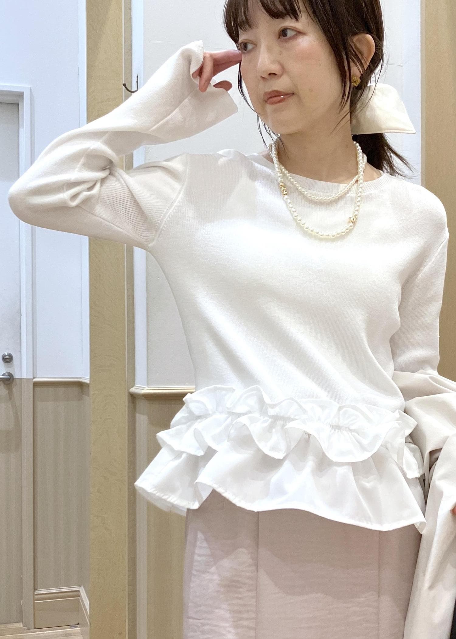 VIS裾フリルティアードドッキングニットオフホワイト / F¥5,929レビュー裾のフリルデザインがポイントになるので1枚でも着映えするトップスです。