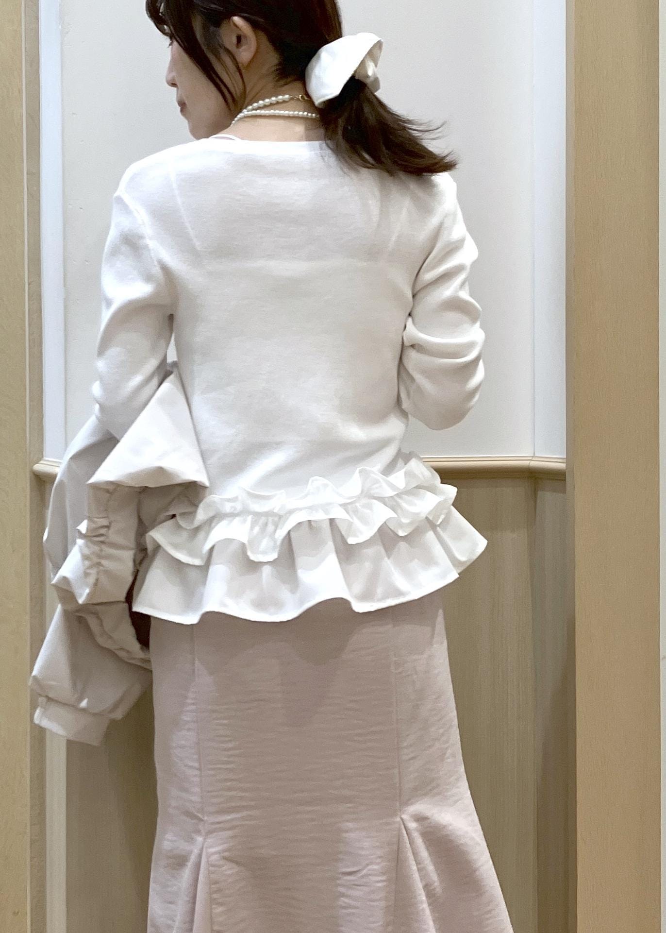 身頃部分は軽めの春ニット素材です。白は少し透け感があるのでインナーはカップ付きのキャミソールなどと合わせるのがオススメです。 -