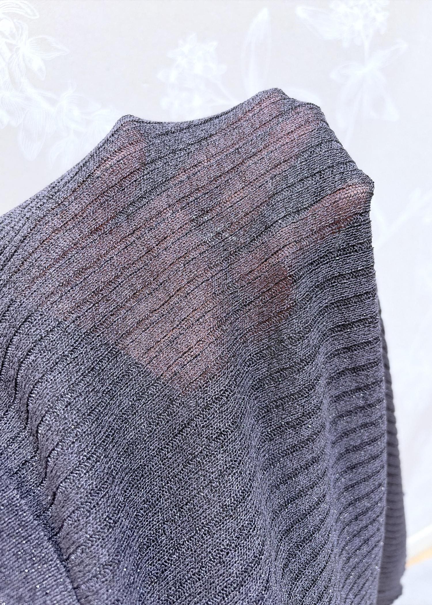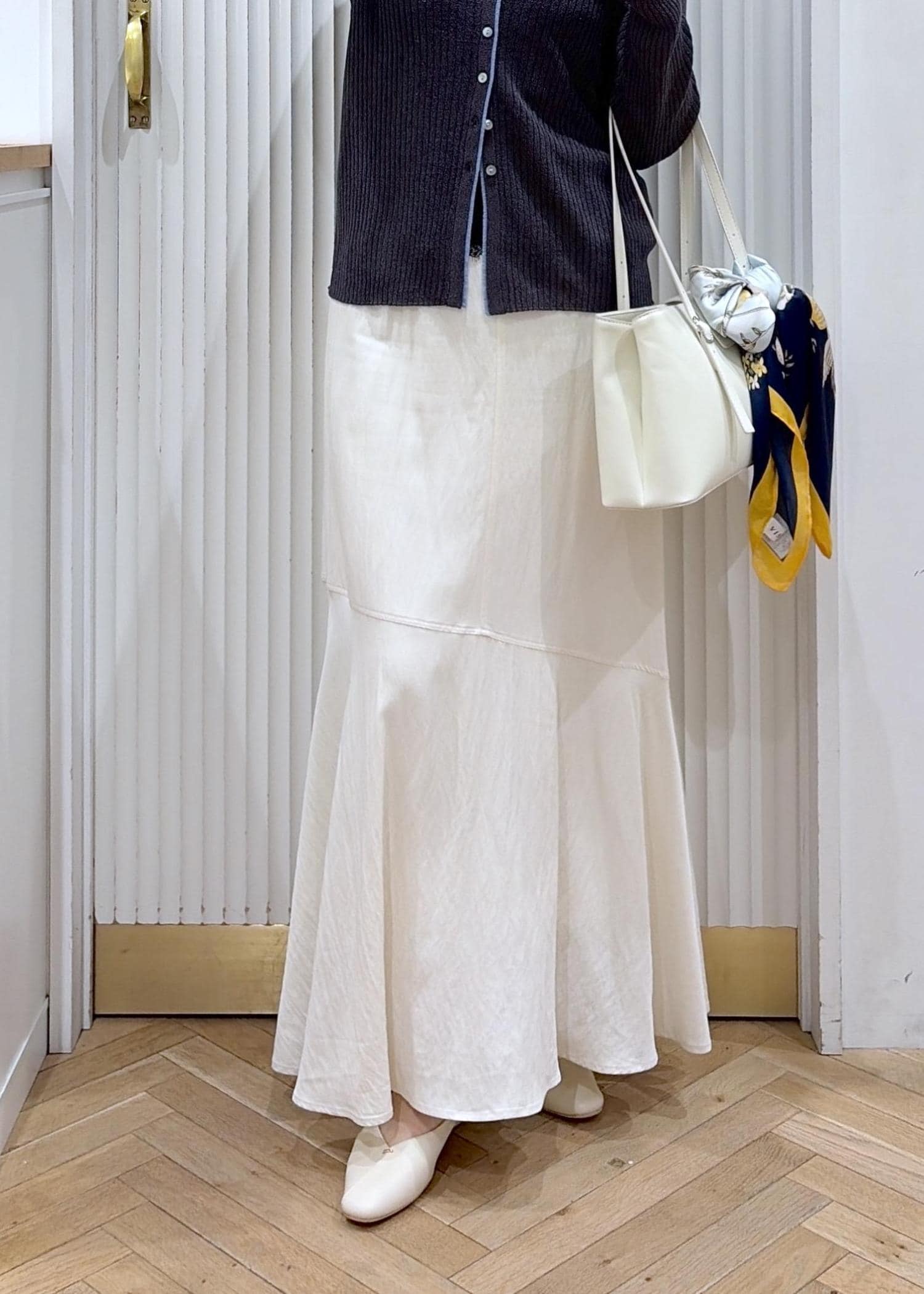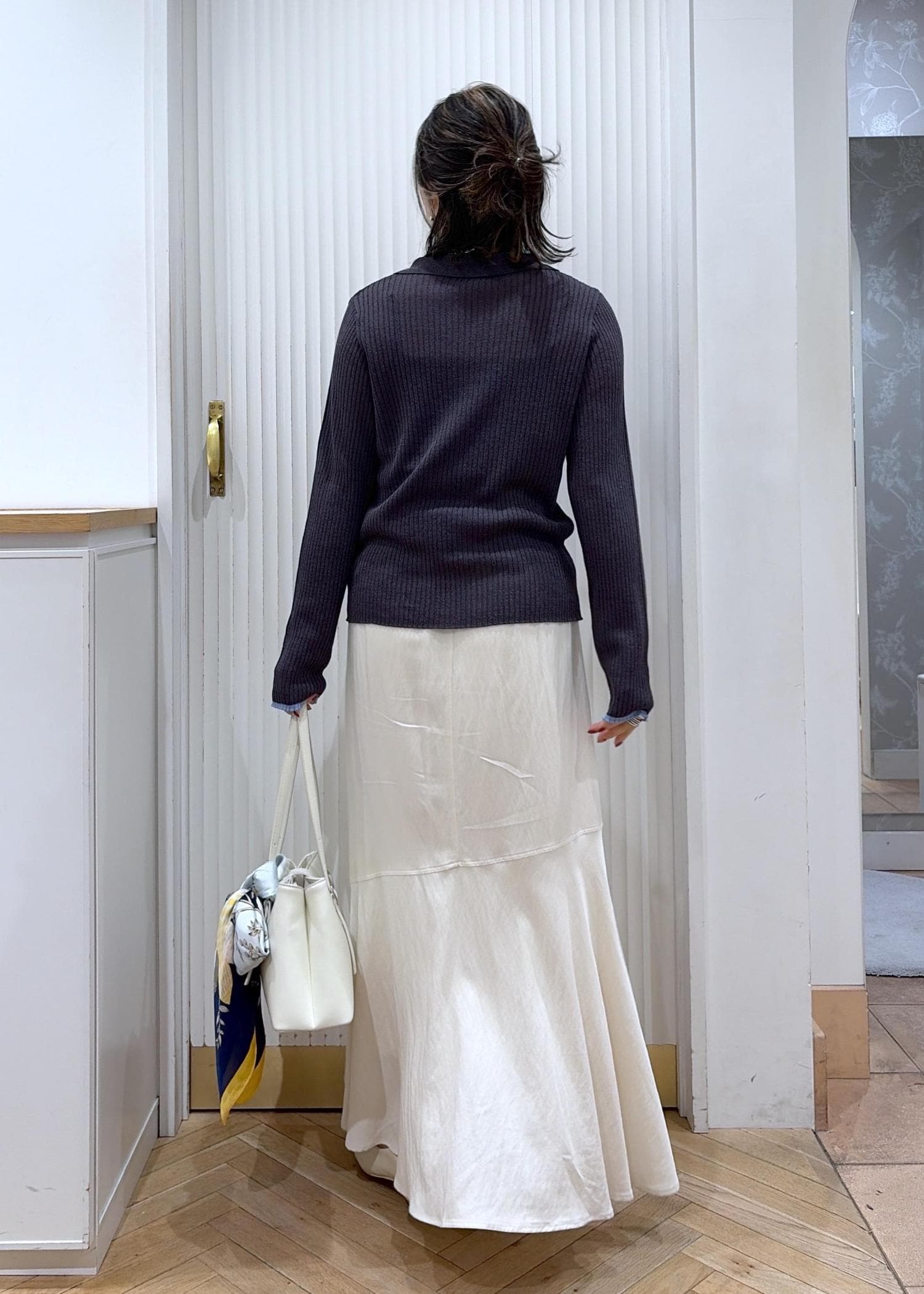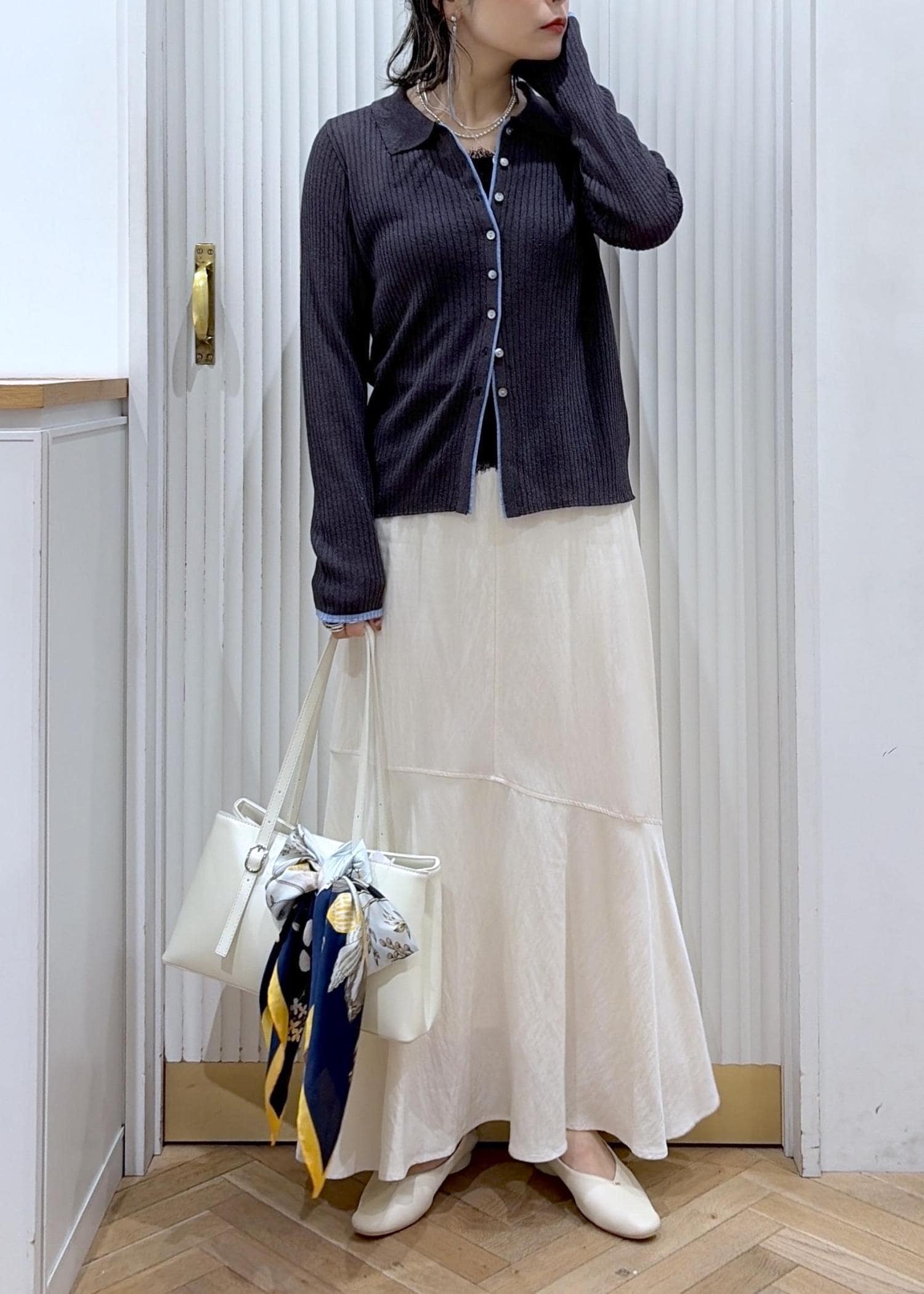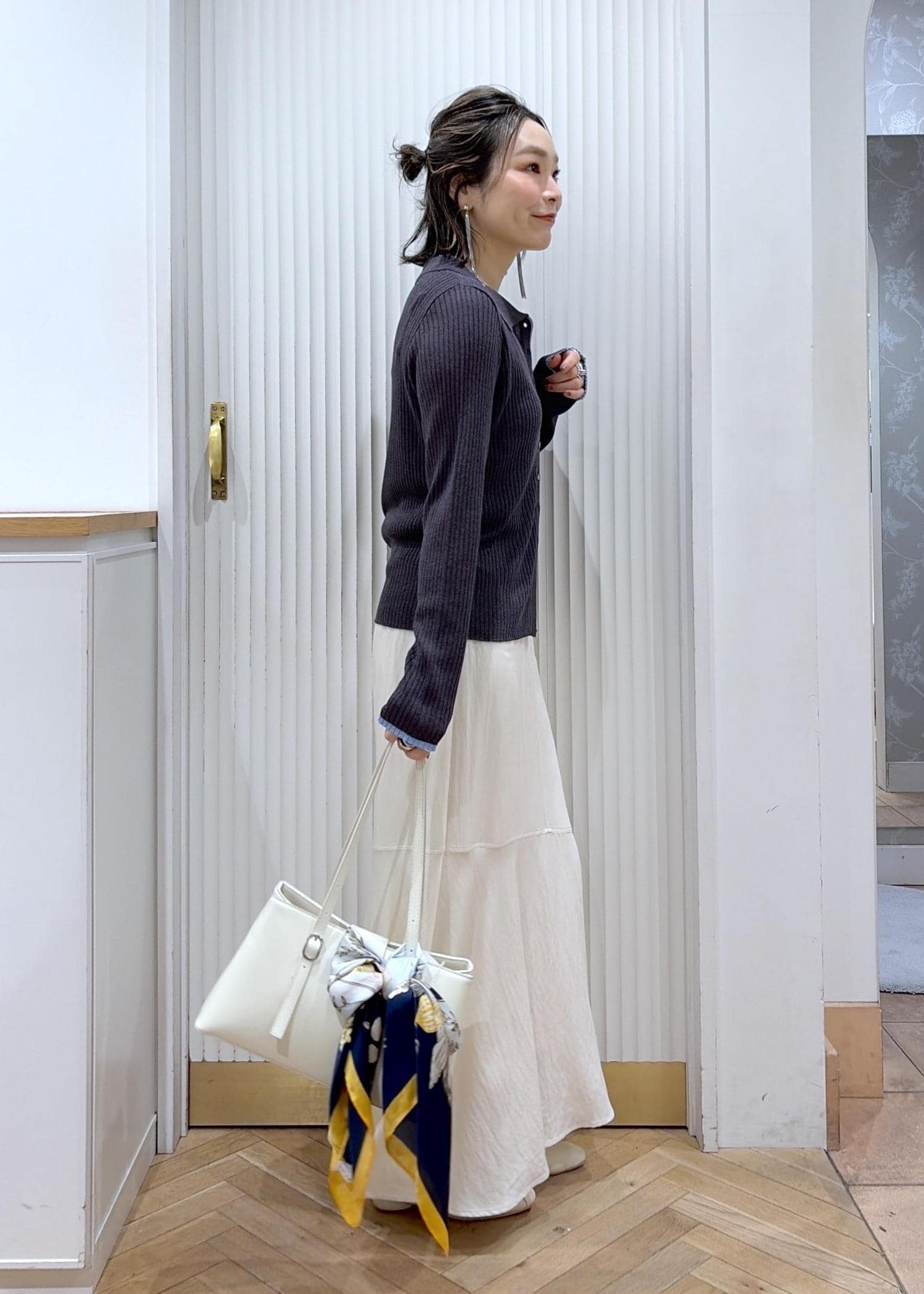 ダークトーンのラメリブカーディガンに、軽やかなアイボリースカートを合わせた大人の抜け感コーデ。スカーフ付きバッグがさりげないアクセントになり、シンプルながらも洗練された印象に仕上がります。オンにもオフにも使える万能スタイル◎