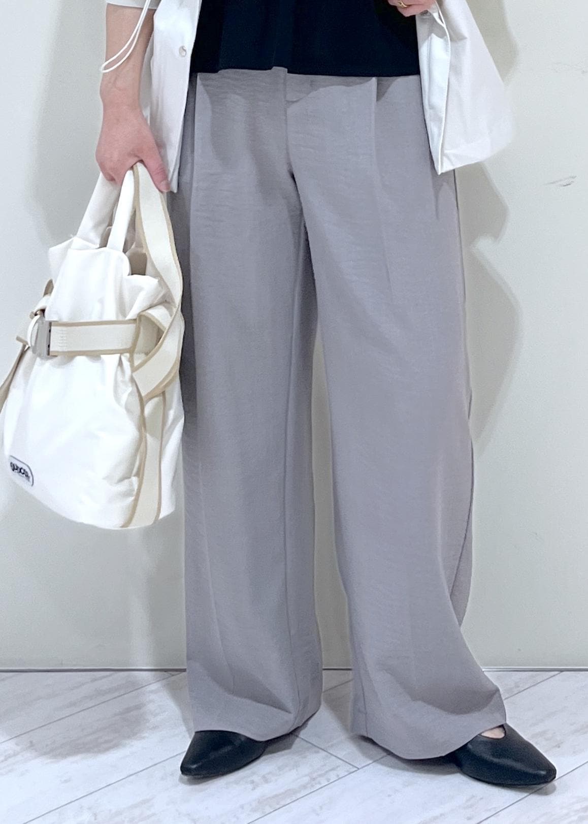タック入りのワイドパンツで腰回りのラインもカバーして綺麗に着用できます。