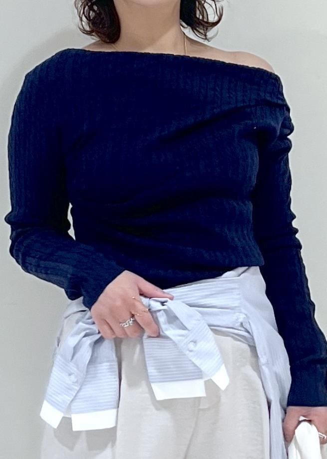 トレンドのミニケーブル編みでデコルテラインが綺麗に見えるニットです。
