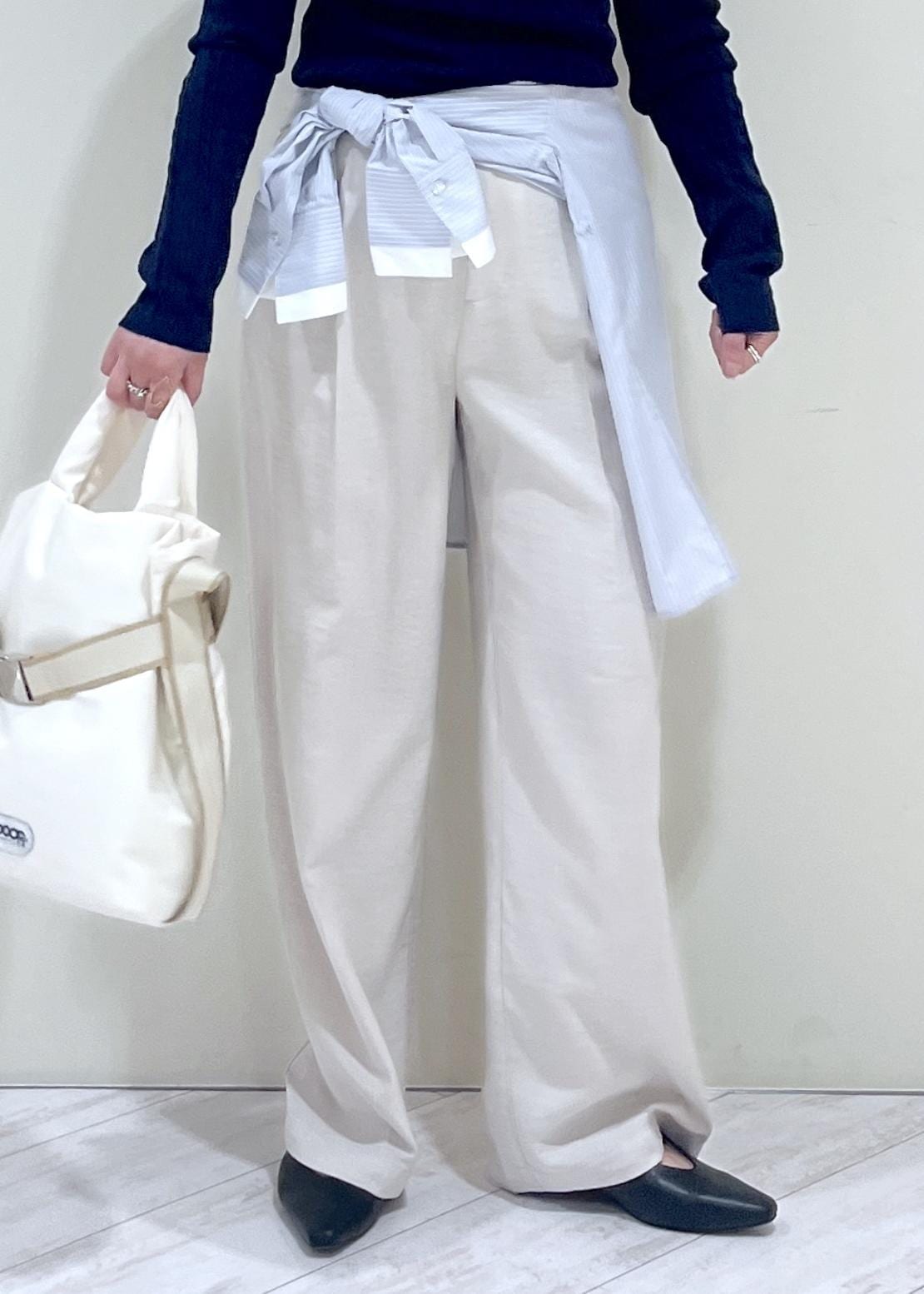 タック入りのワイドパンツで腰回りのラインもカバーして綺麗に着用できます。