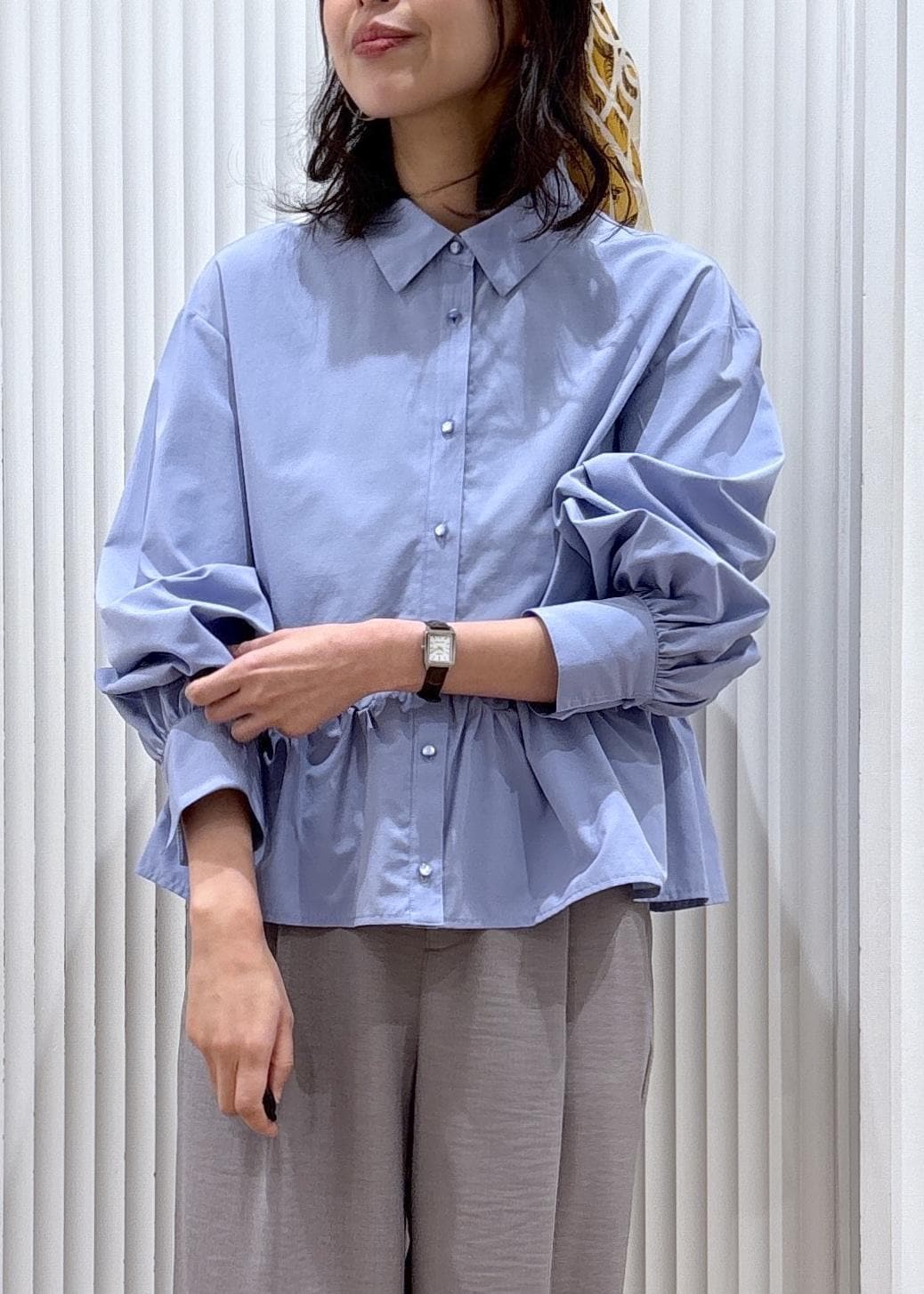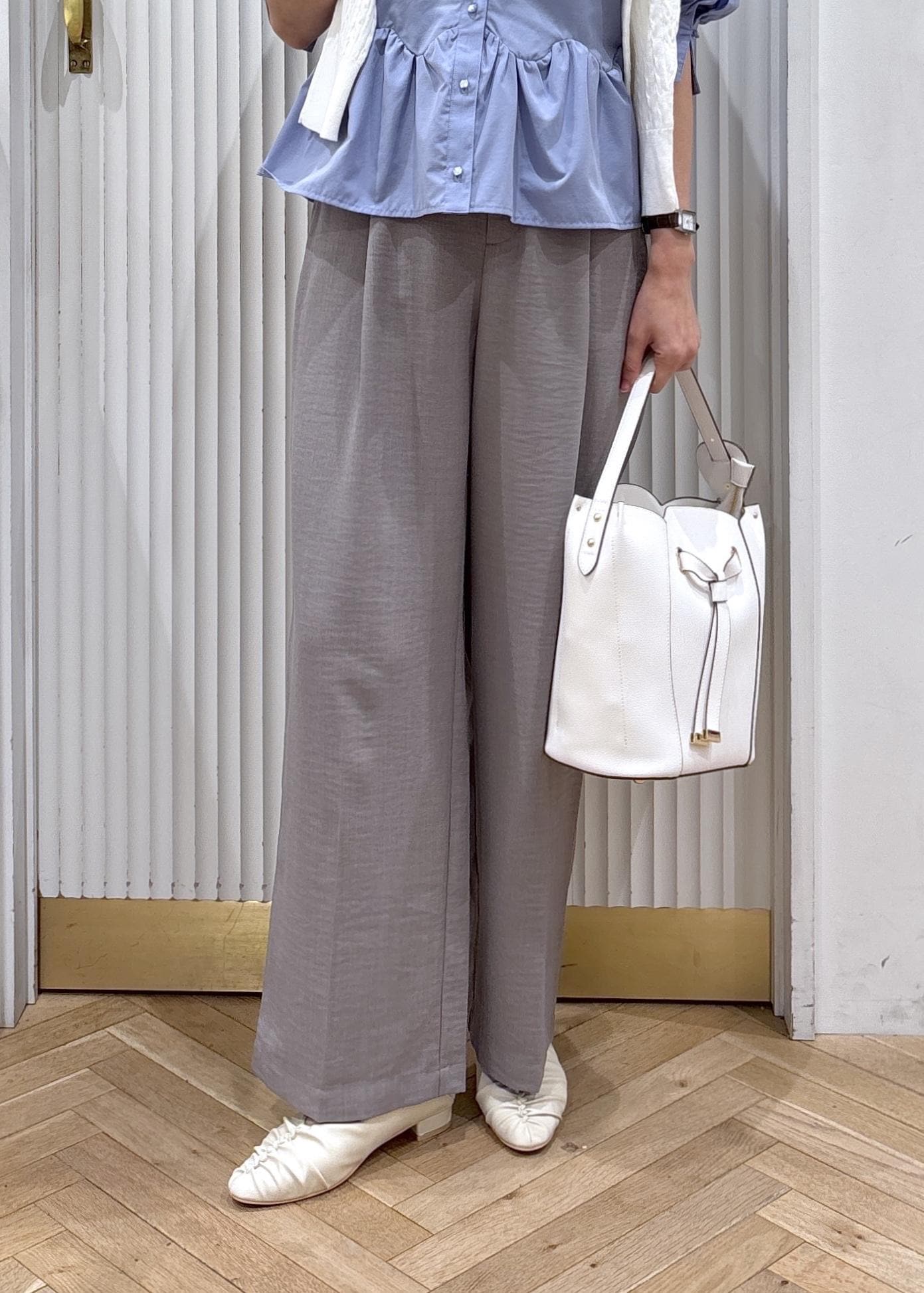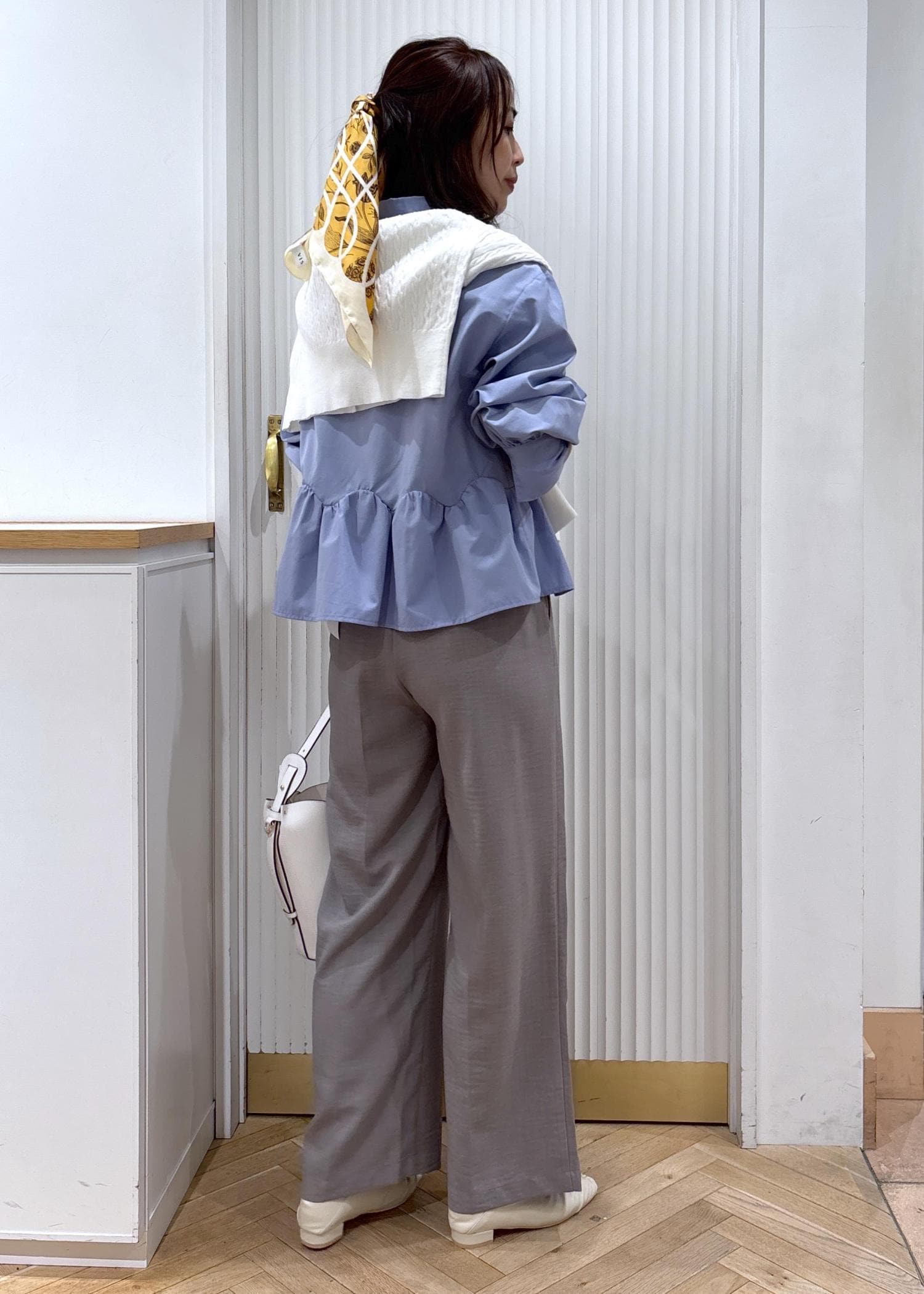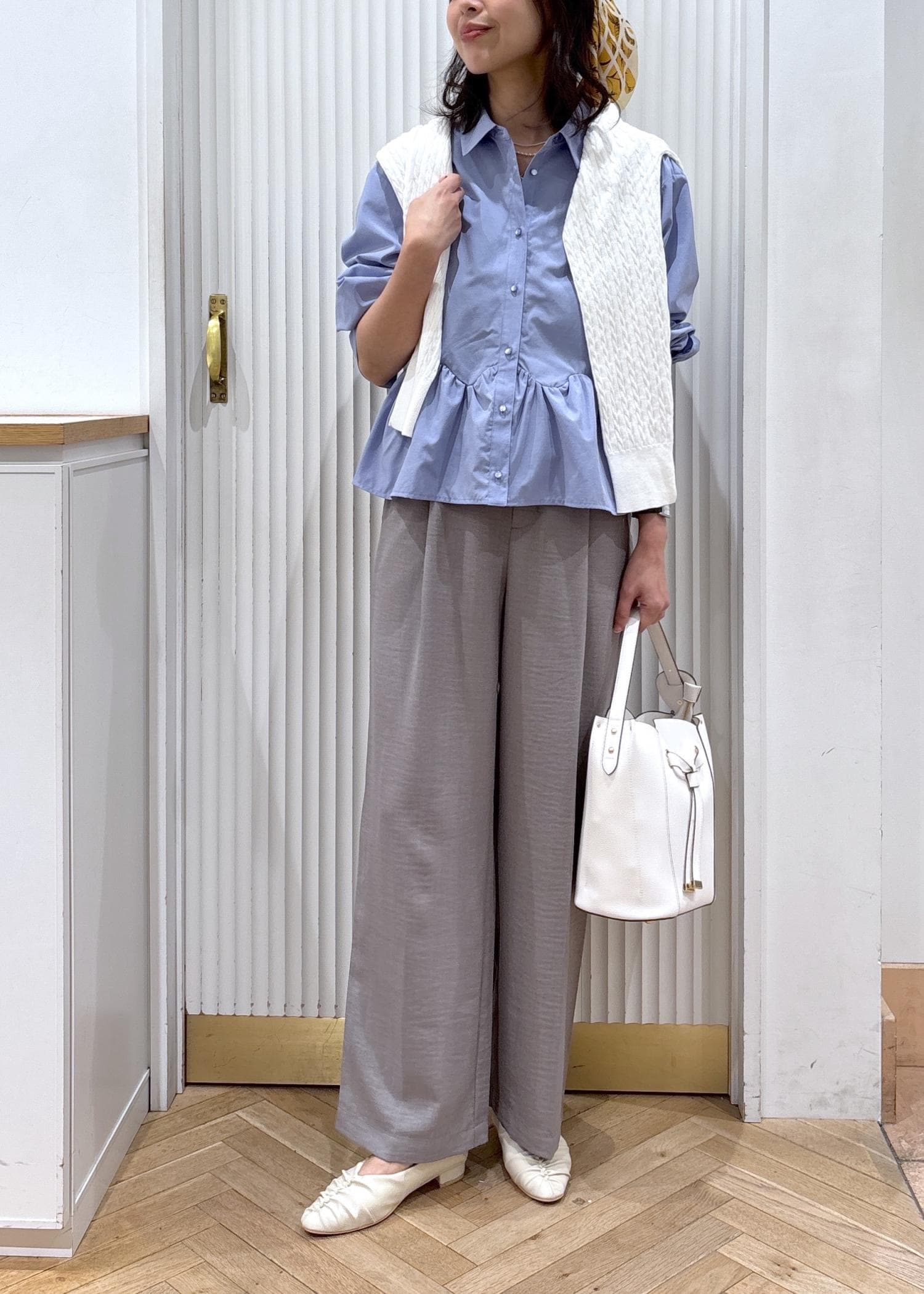 ペプラムのデザインが目を惹くブラウスにワイドパンツを合わせたスタイリングです。
