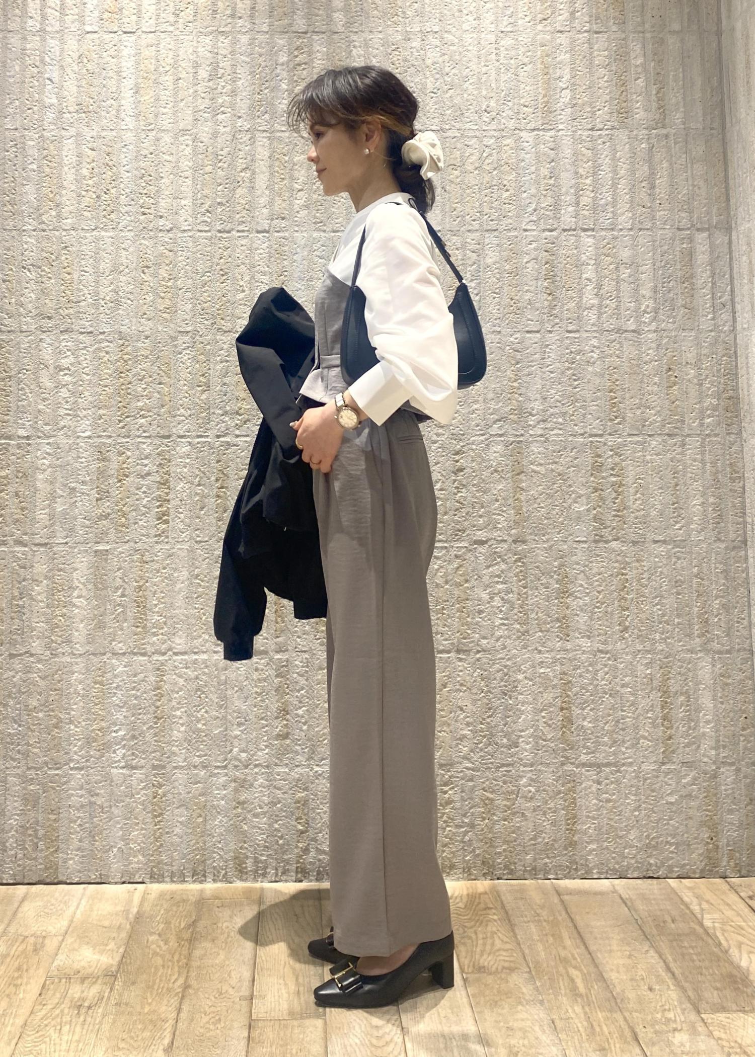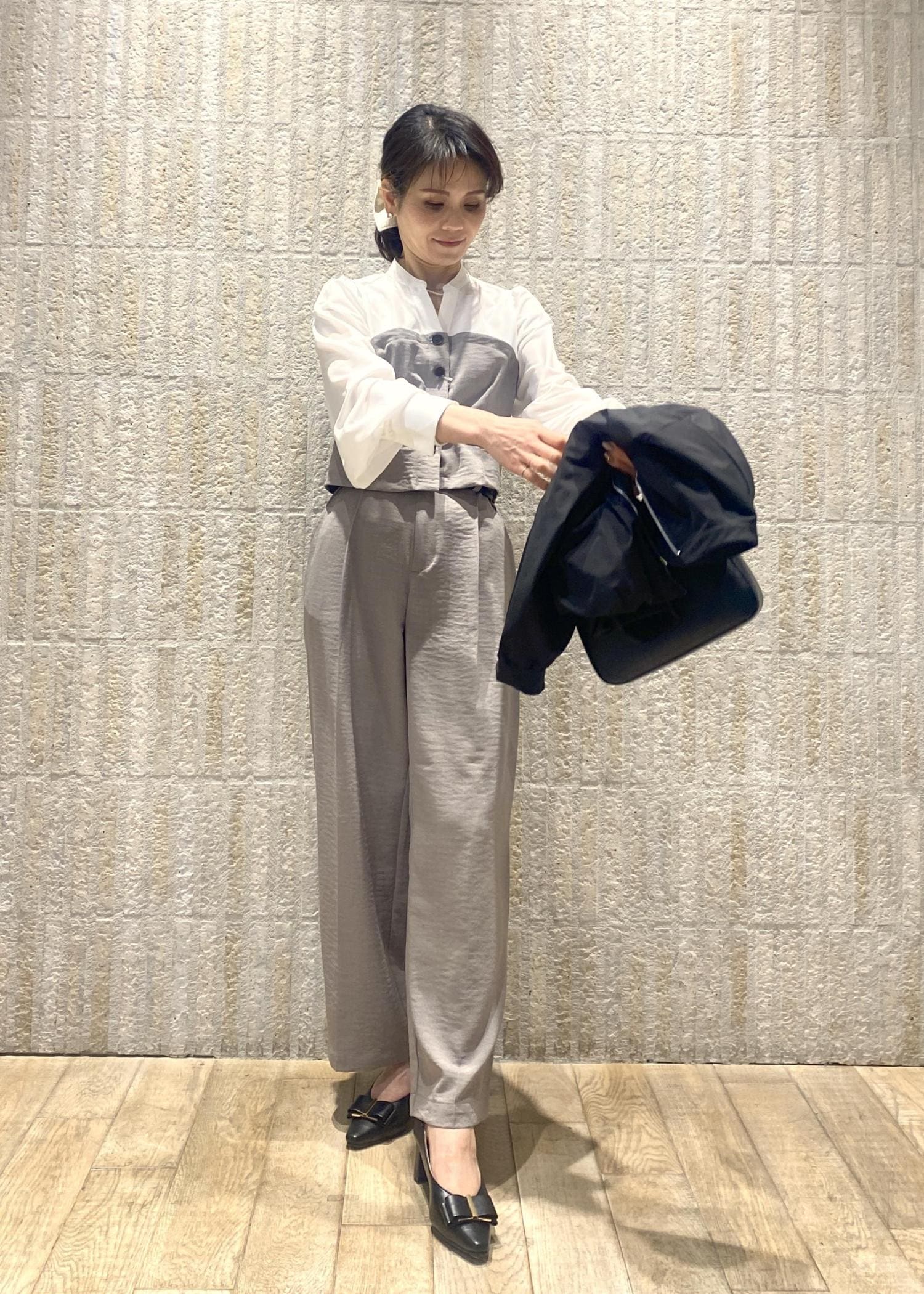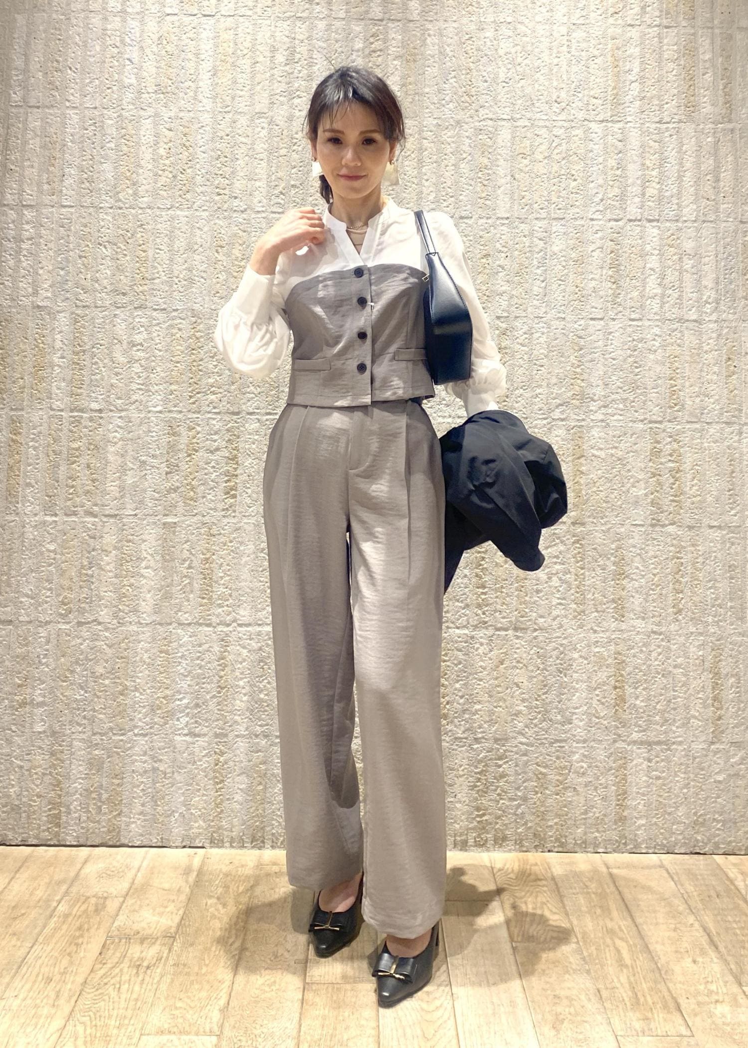 パンツのセットアップでハンサム&レースやパールの小物でフェミニンさを出して、この春はフェミニンハンサムなスタイリングがオススメです♪