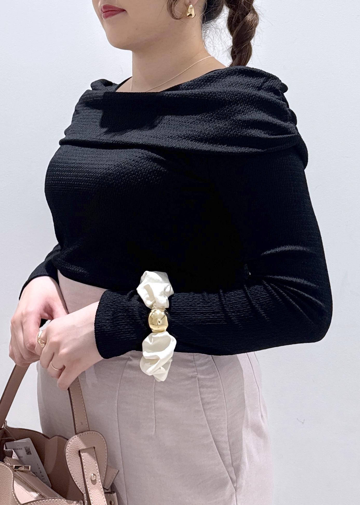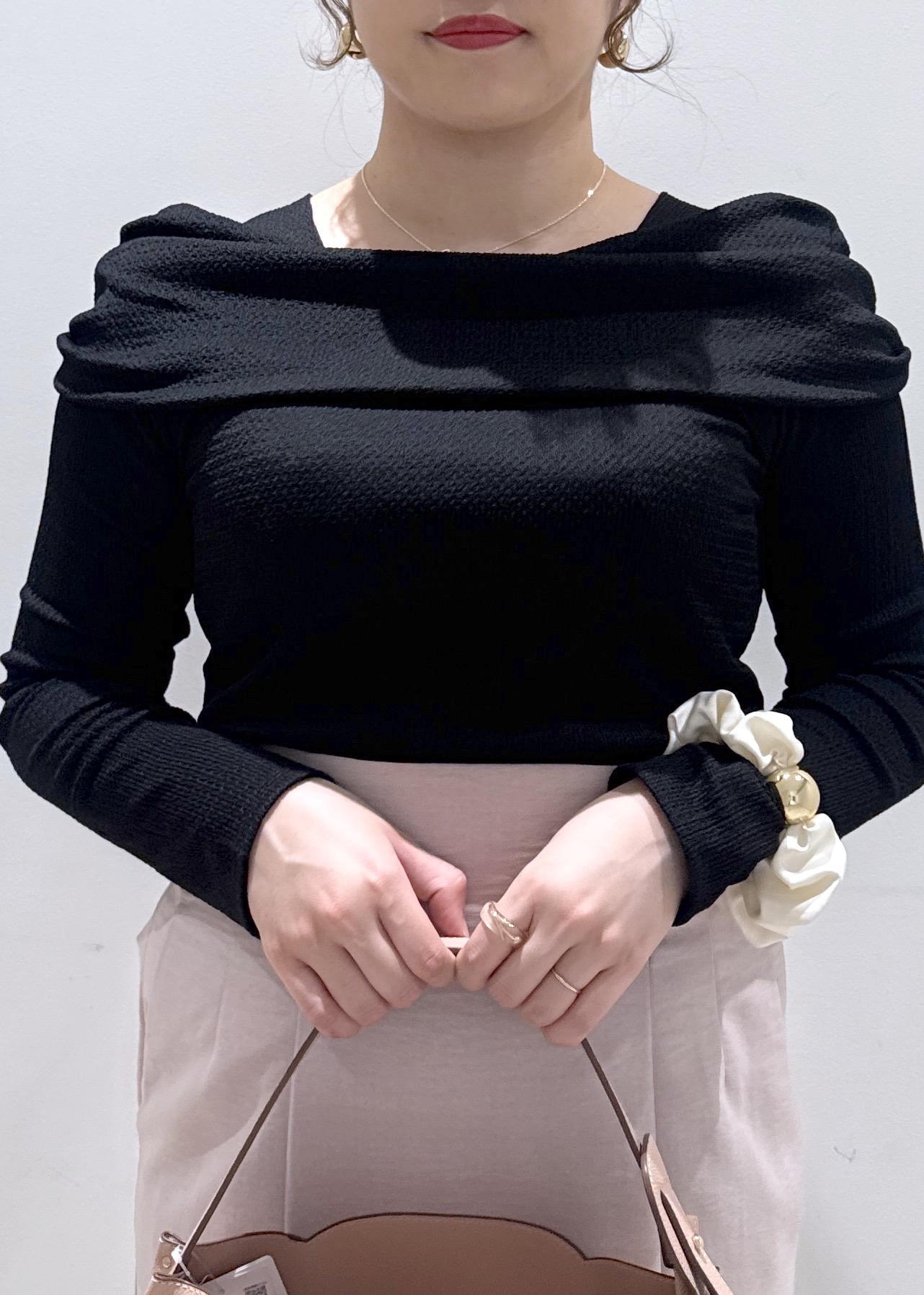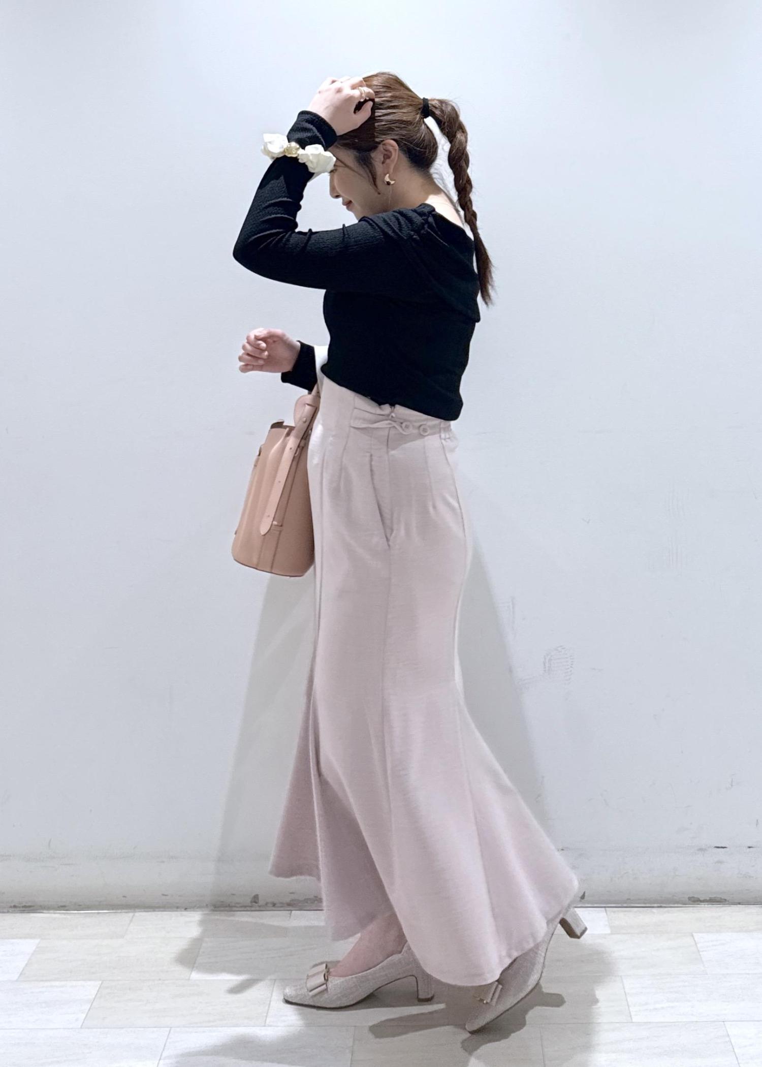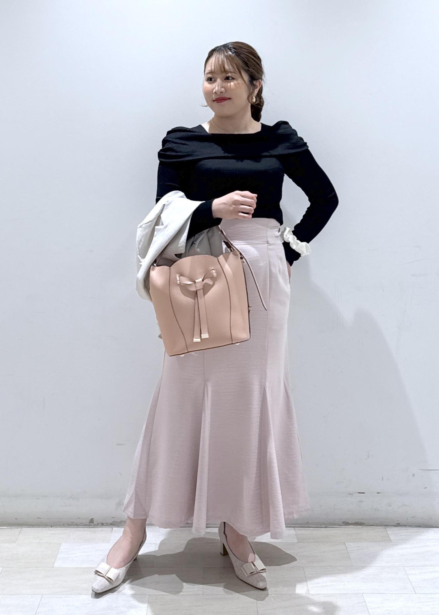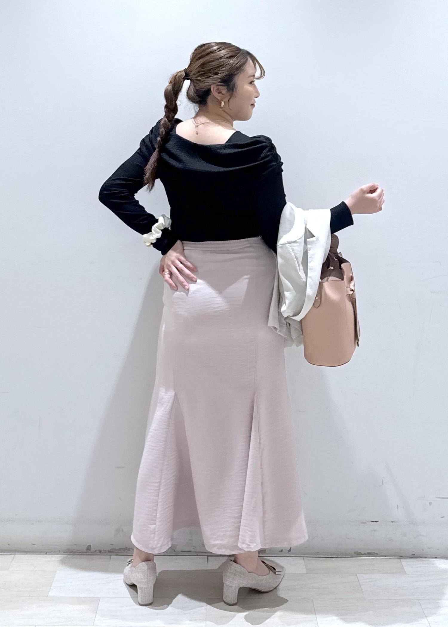 今回は新作で入荷しました、ジャガード素材のオフショル風プルオーバーに、マーメイドスカートと合わせてお仕事でも使える綺麗めなコーディネートにしてみました♪