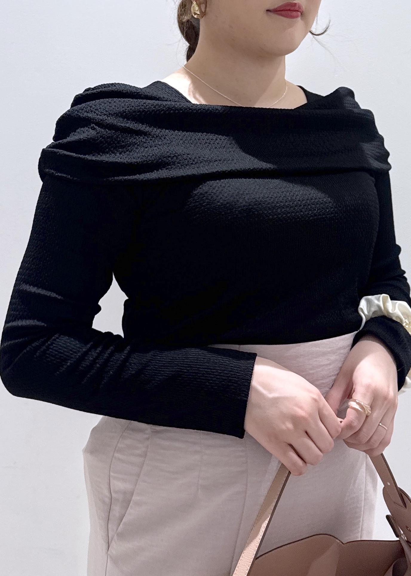VISジャガードオフショルプルオーバー/イージーケアブラック / F¥4,939レビュージャガード素材のオフショル風プルオーバー⭐︎肩にギャザーが入っており、オフショルの部分がしっかり止まっているのでズレ落ちる心配もなく安心して着ていただけます。素材は柔らかく、少し薄手のテロッした肌触りでこれからの春に大活躍しそうです。ジャケットの中のインナー使いとしてもゴワつくこともないのでお仕事用にも着れますよ*着丈は身長157cmで、腰丈辺りぐらいの長さなのでインしてもしなくてもどちらでも大丈夫そうです!