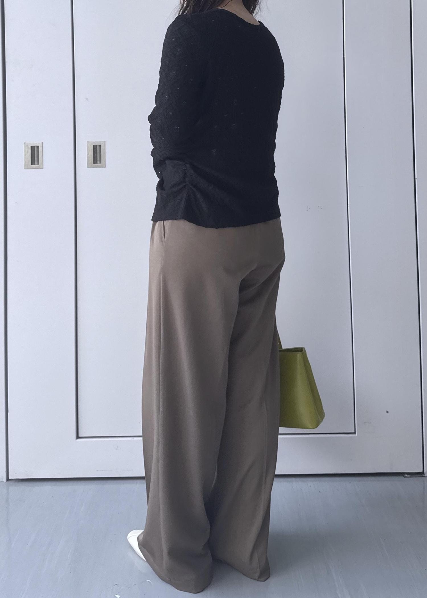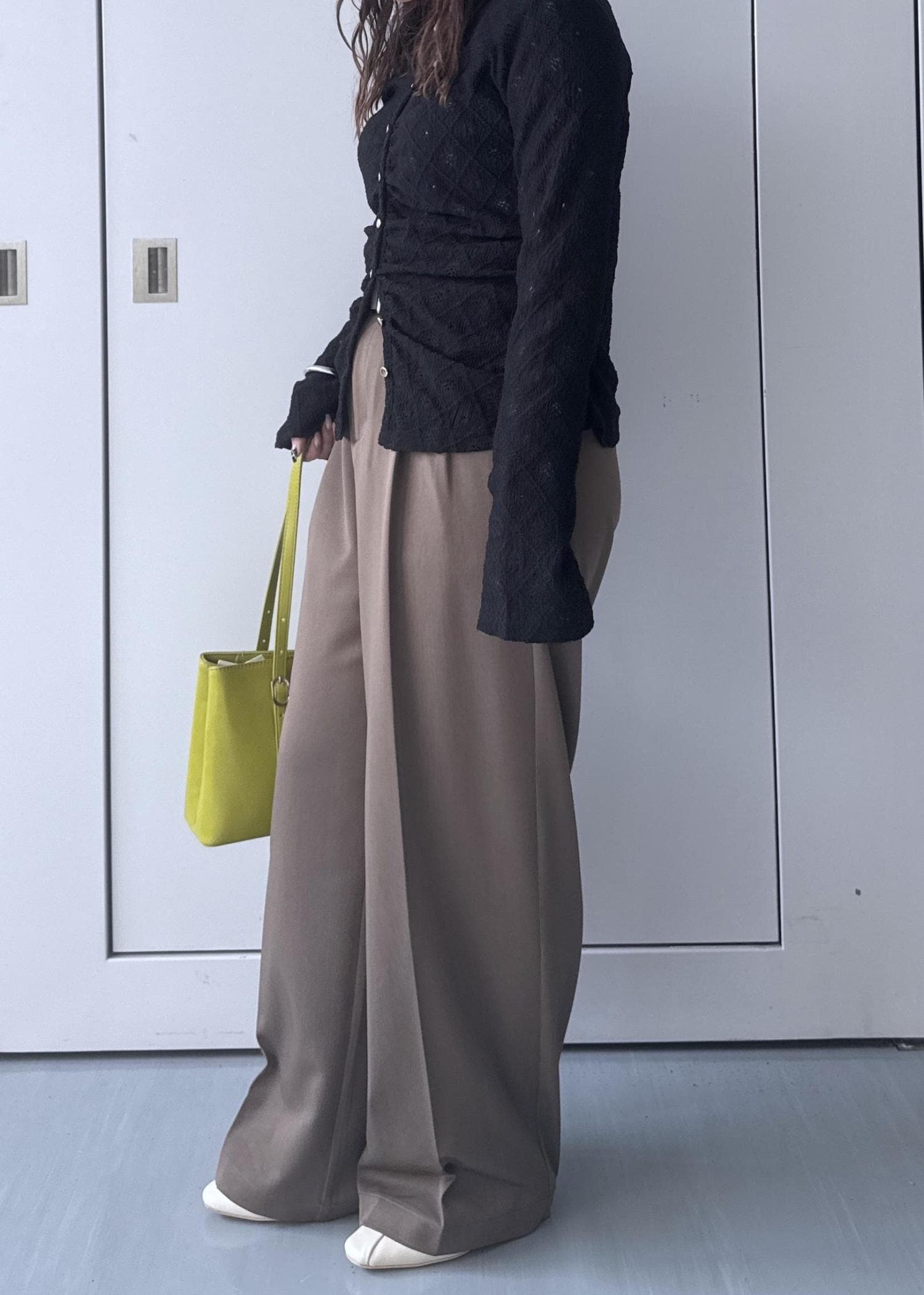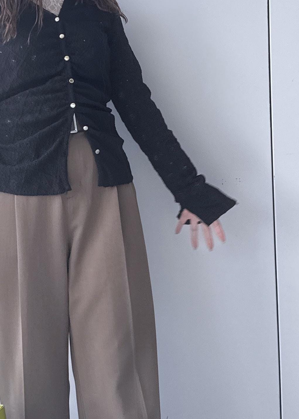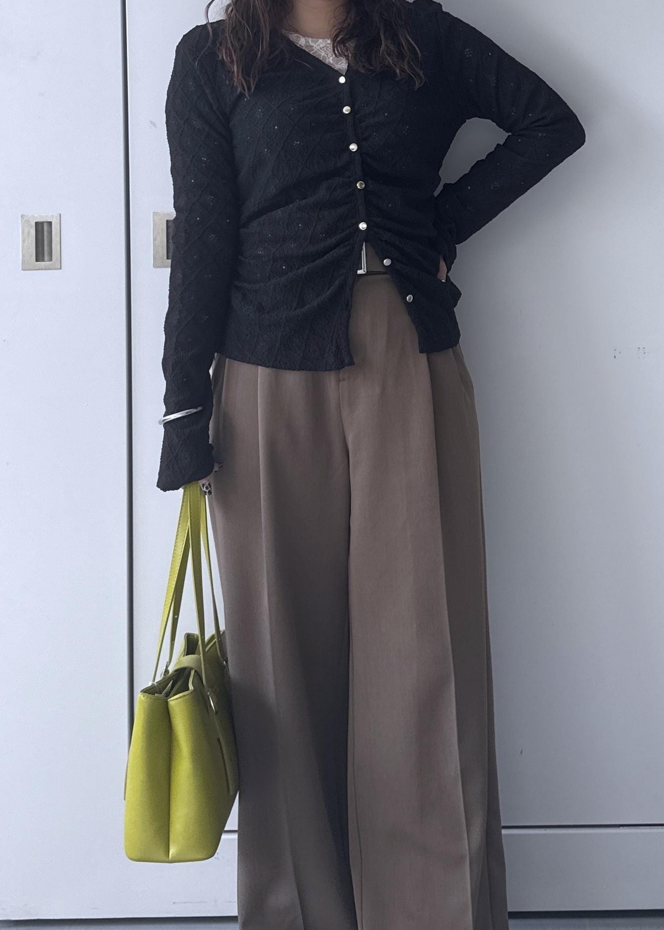 ブラックのカーディガンにワイドパンツで細見えするようなスタイリングにしました◎