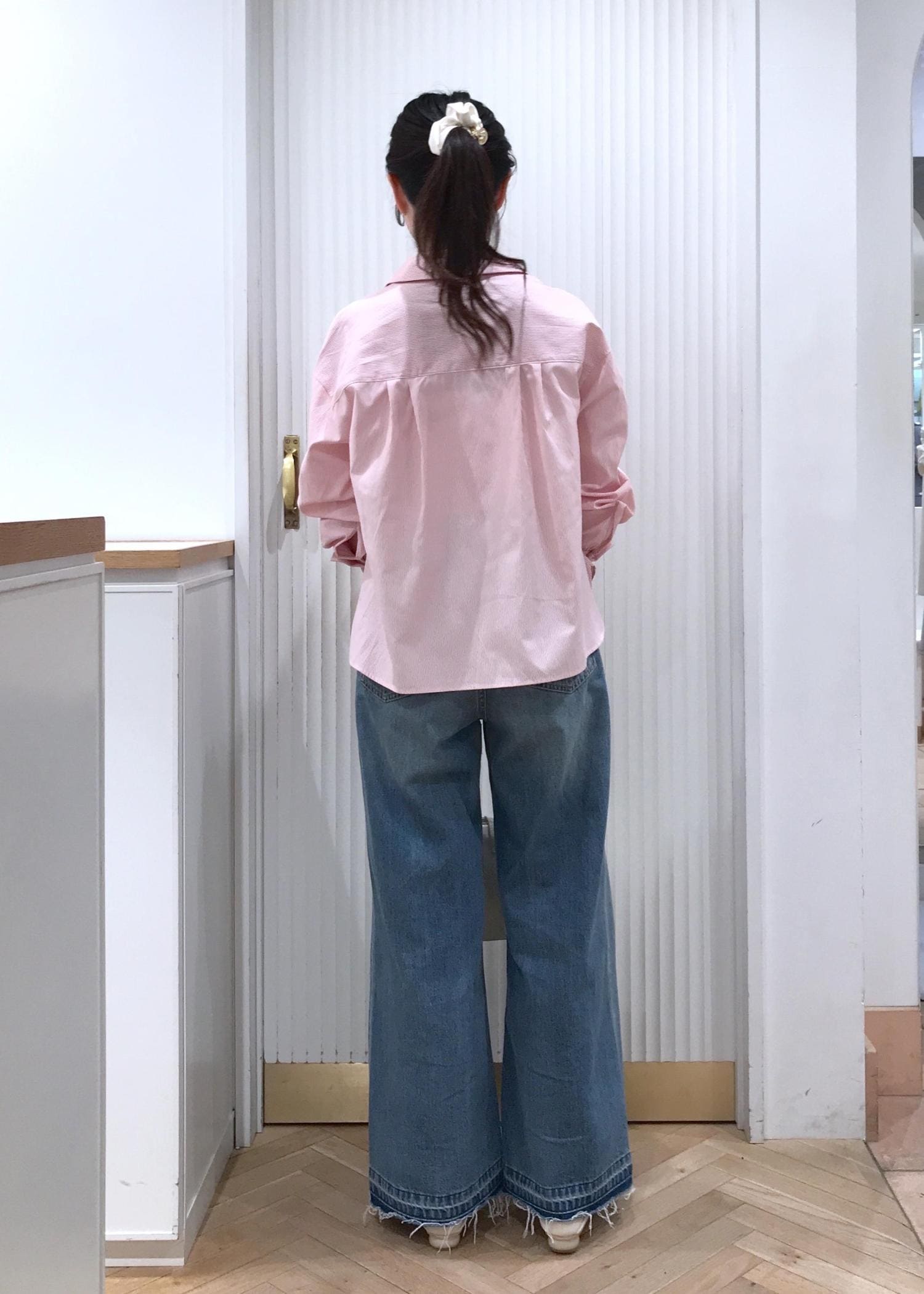 細いストライプなのでスッキリシルエットで着用出来ますよ。 -