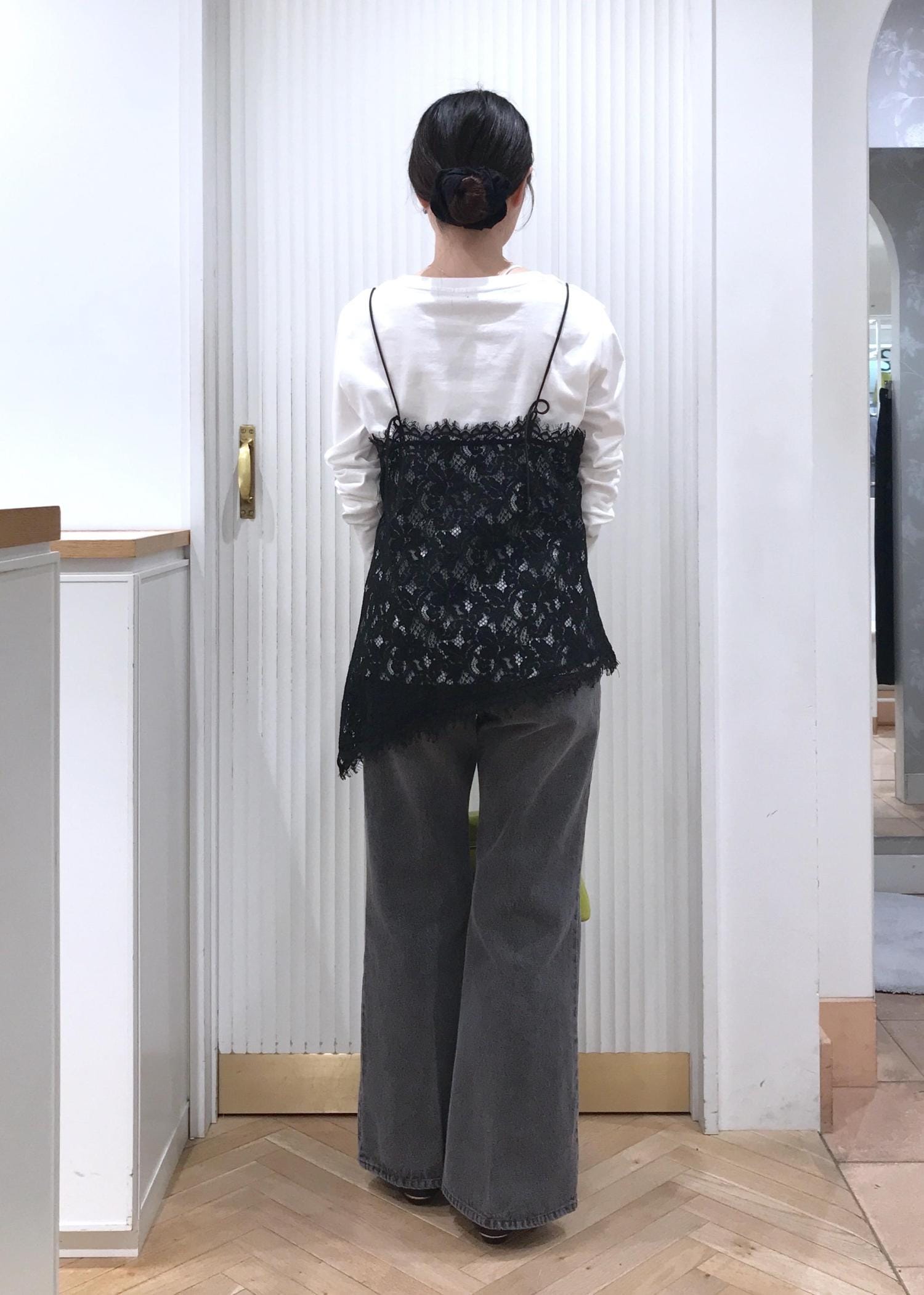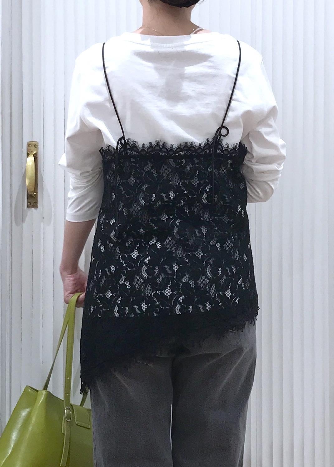 レースアシンメトリーキャミソールのカジュアルコーデ