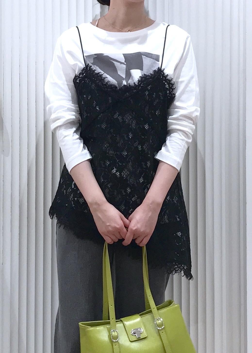 アシンメトリーが可愛いレースキャミソールとカットソーを合わせたカジュアルコーデです!