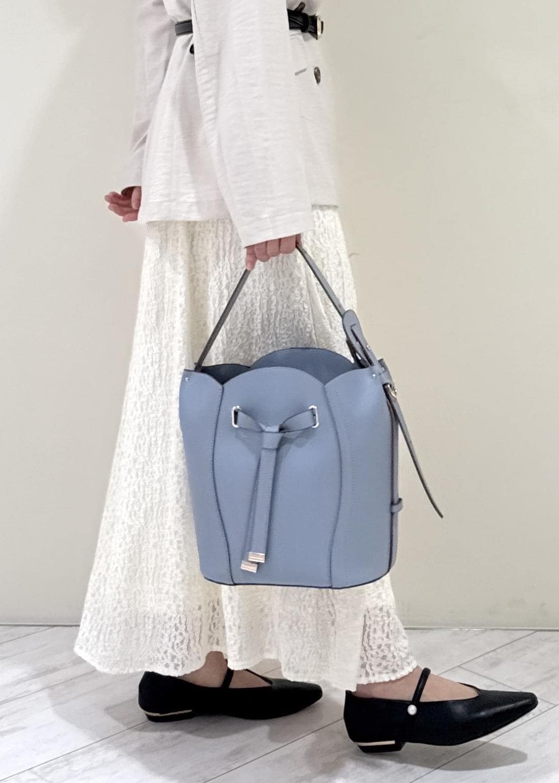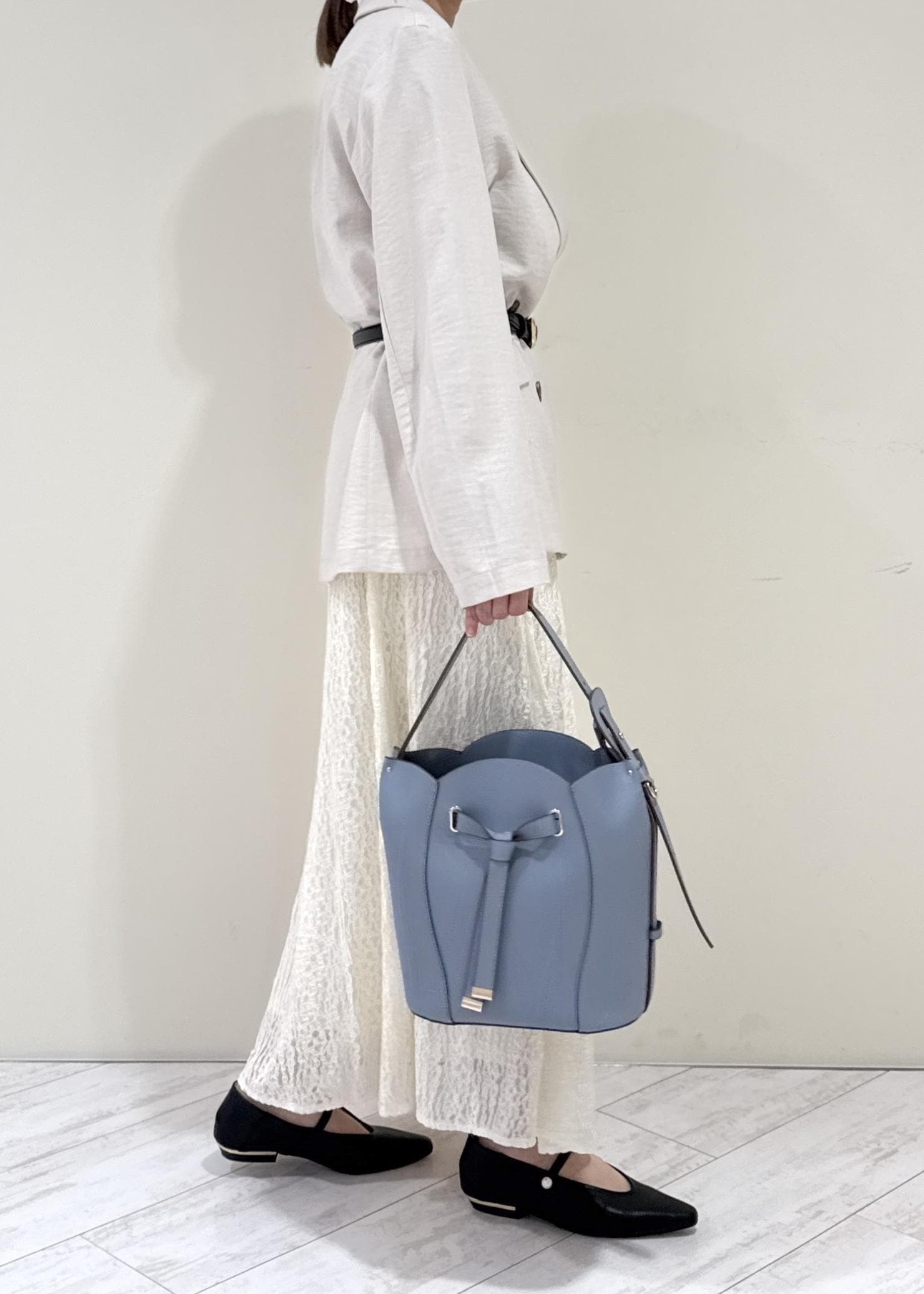 変形したバックルがコーディネートのさりげないポイントになります◎ -