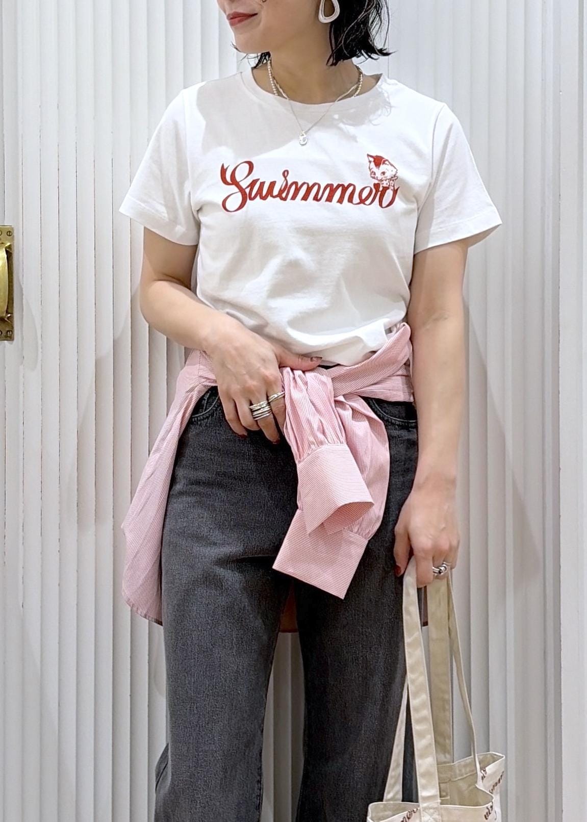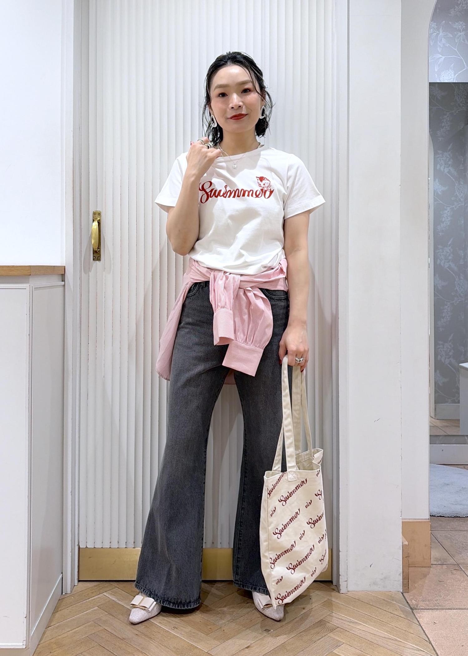 SWIMMERTシャツを使ったさりげない甘さ、こなれた大人カジュアル