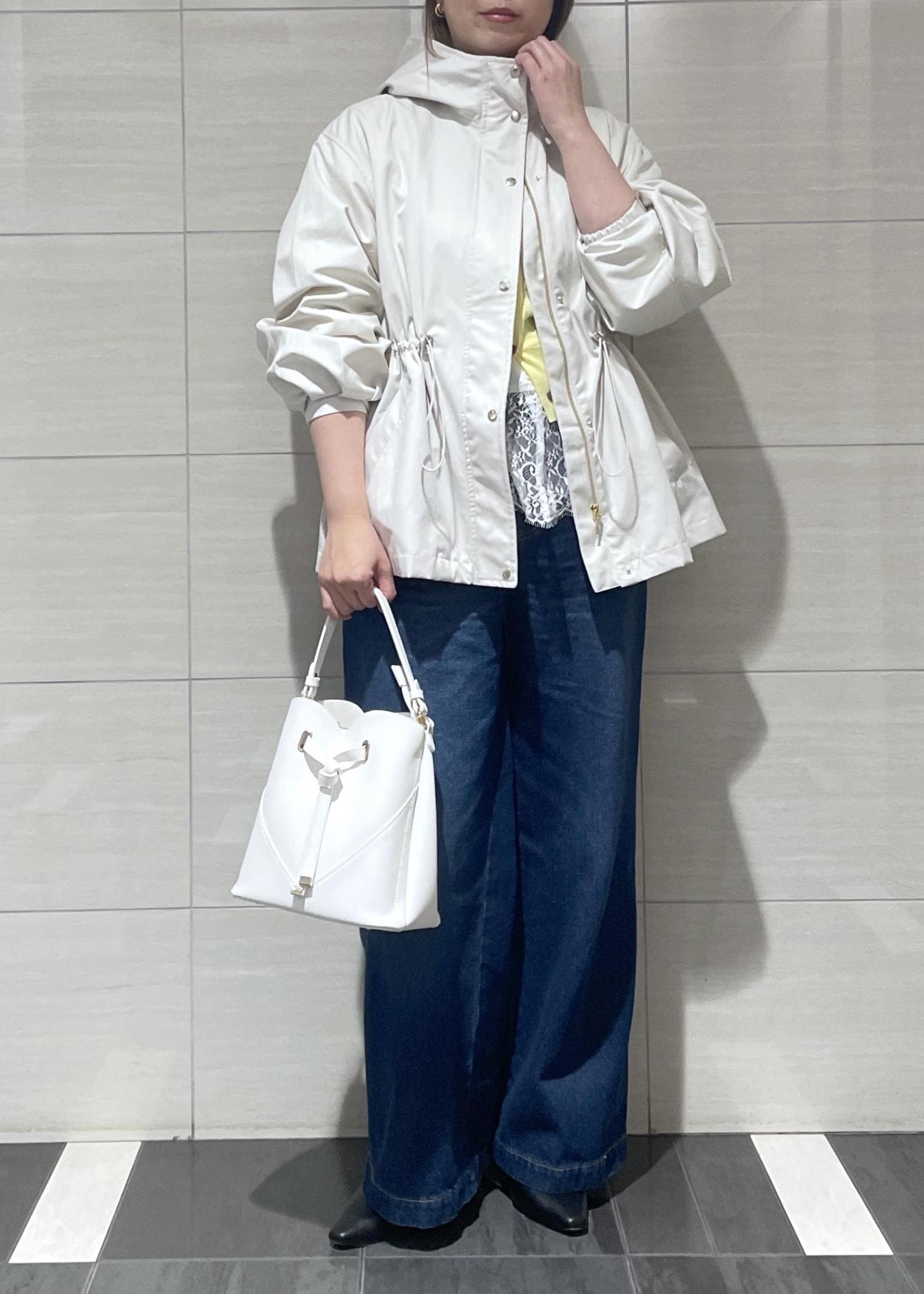 少しハリ感と光沢感がある素材なのでカジュアルすぎず女性らしい印象にしてくれます。