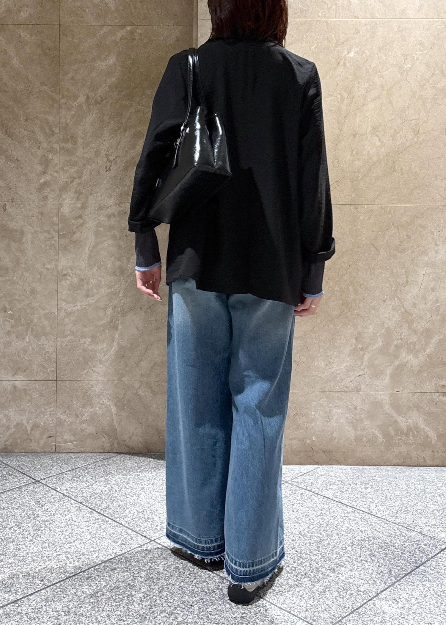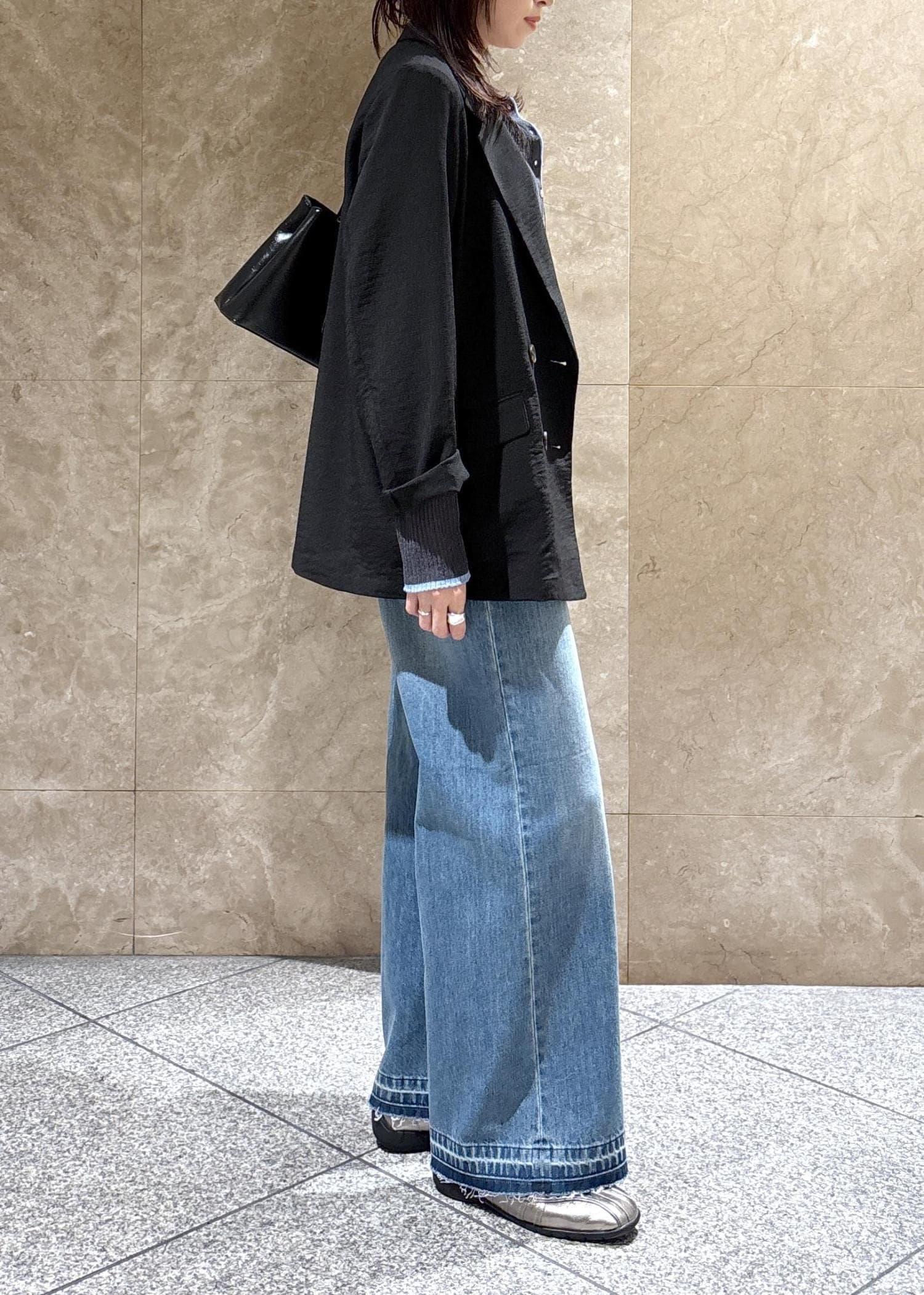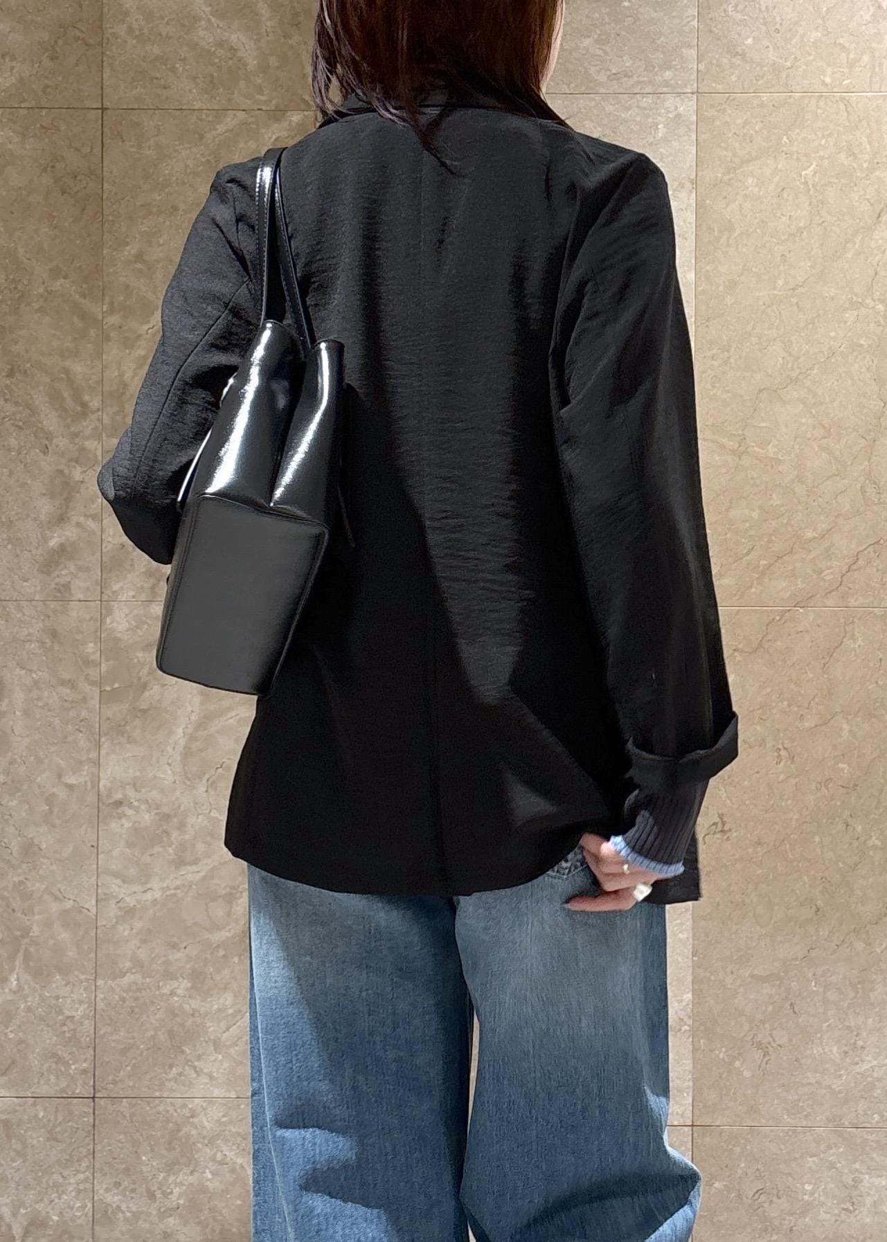 オーバーサイズですが、裏地もなくテロっとした落ち感で、袖をまくるとこなれ感もあり、スッキリかっこよく着られます。