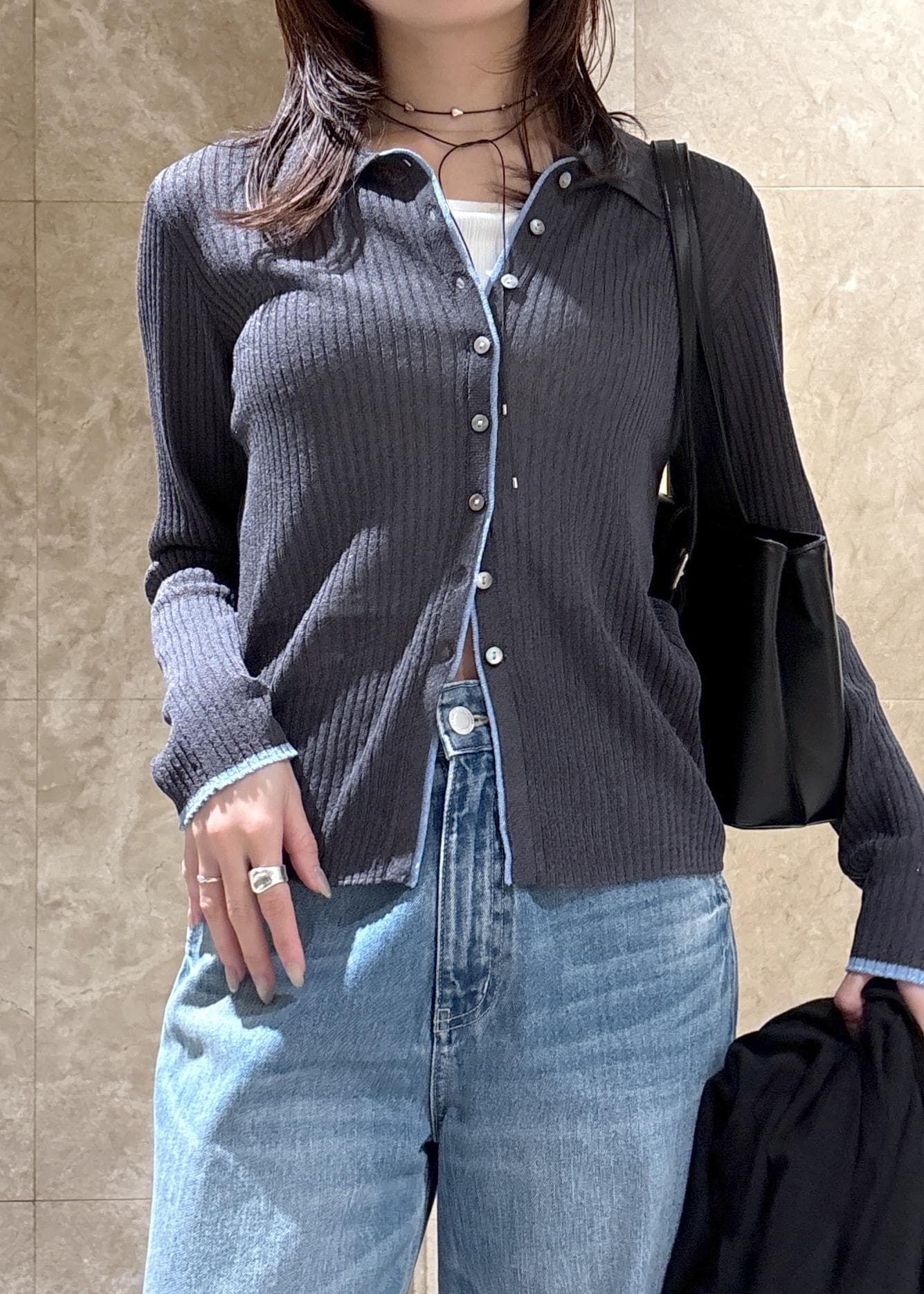 ポロ襟配色シアーリブカーディガン/イージーケア
