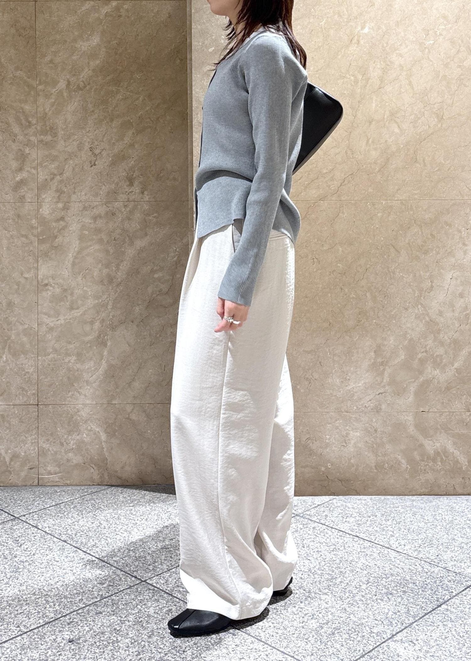 着丈はしっかりハイウエストで履くと踵が隠れる長さでフラットシューズでも下につかないくらいの長さです。 -