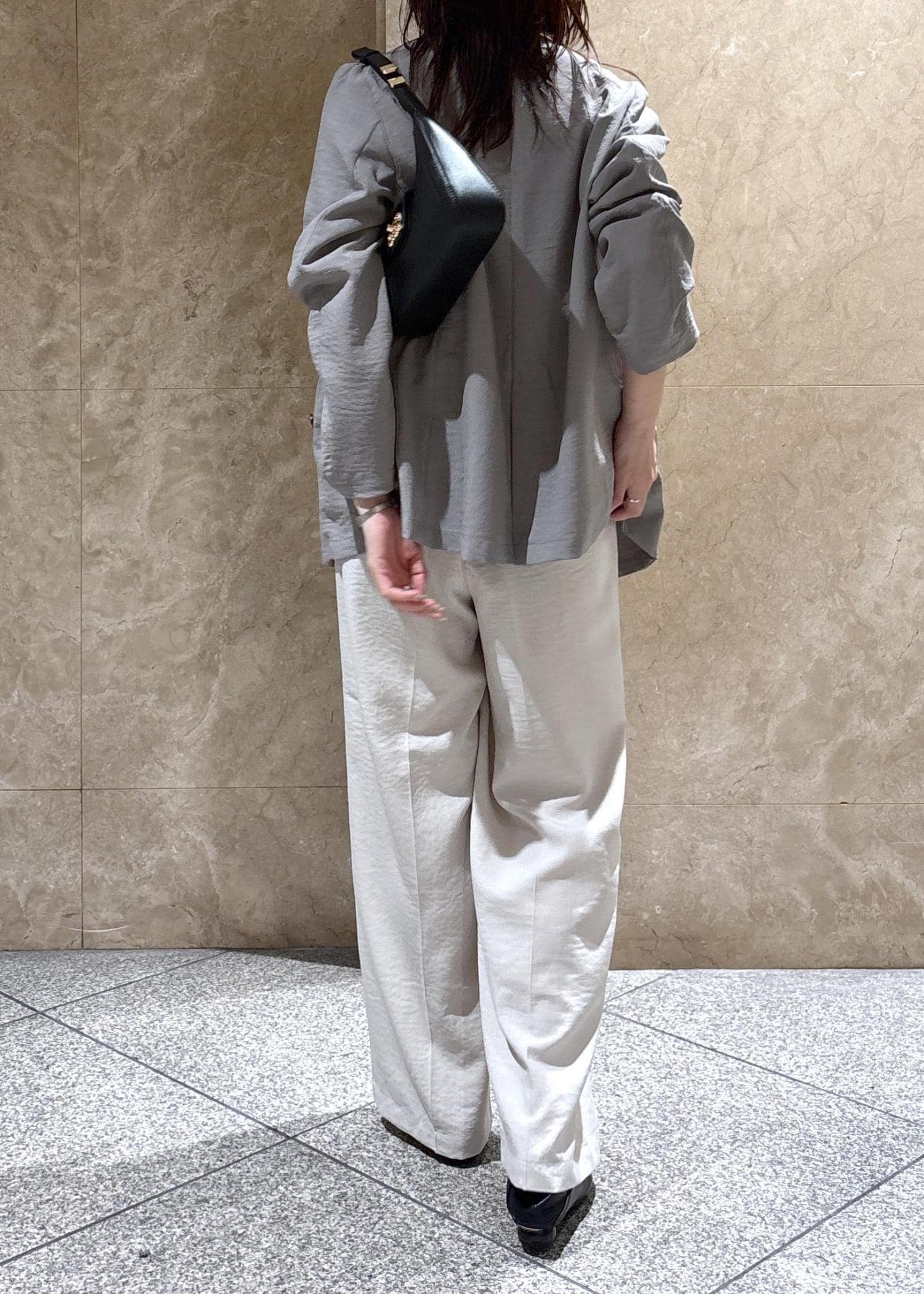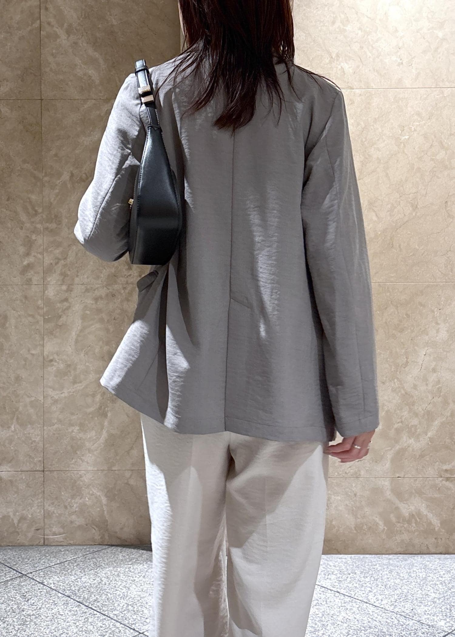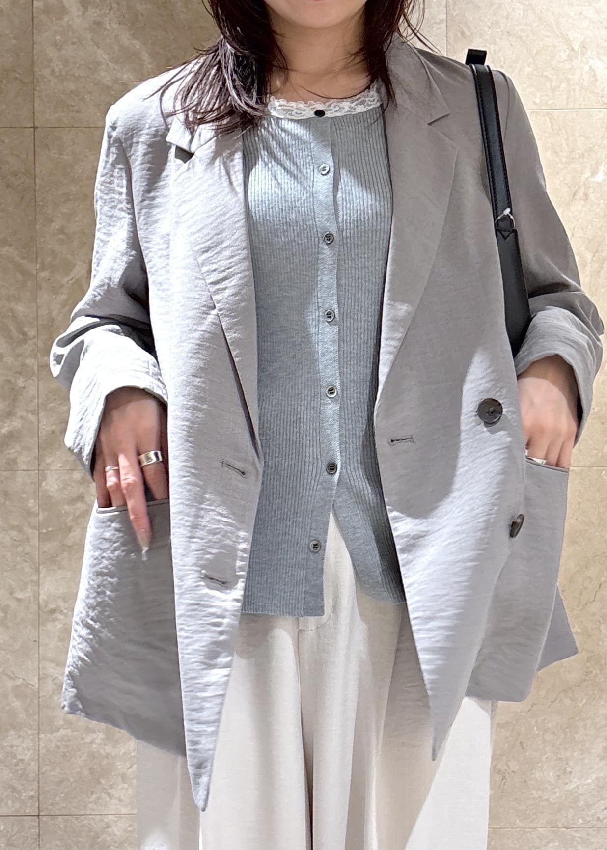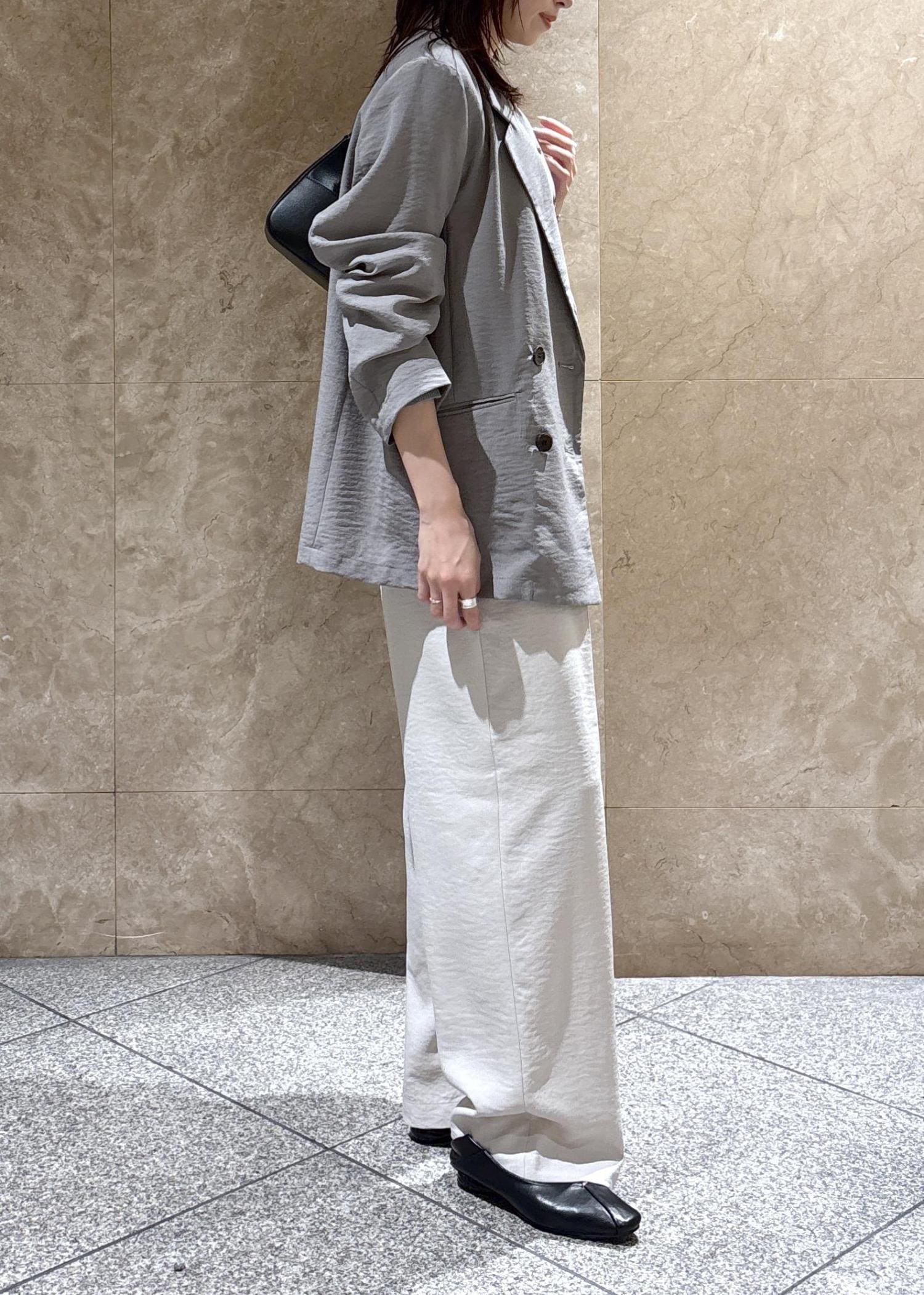 オーバーサイズですが、裏地もなくテロっとした落ち感で、袖をまくるとこなれ感もあり、スッキリかっこよく着られます。 -