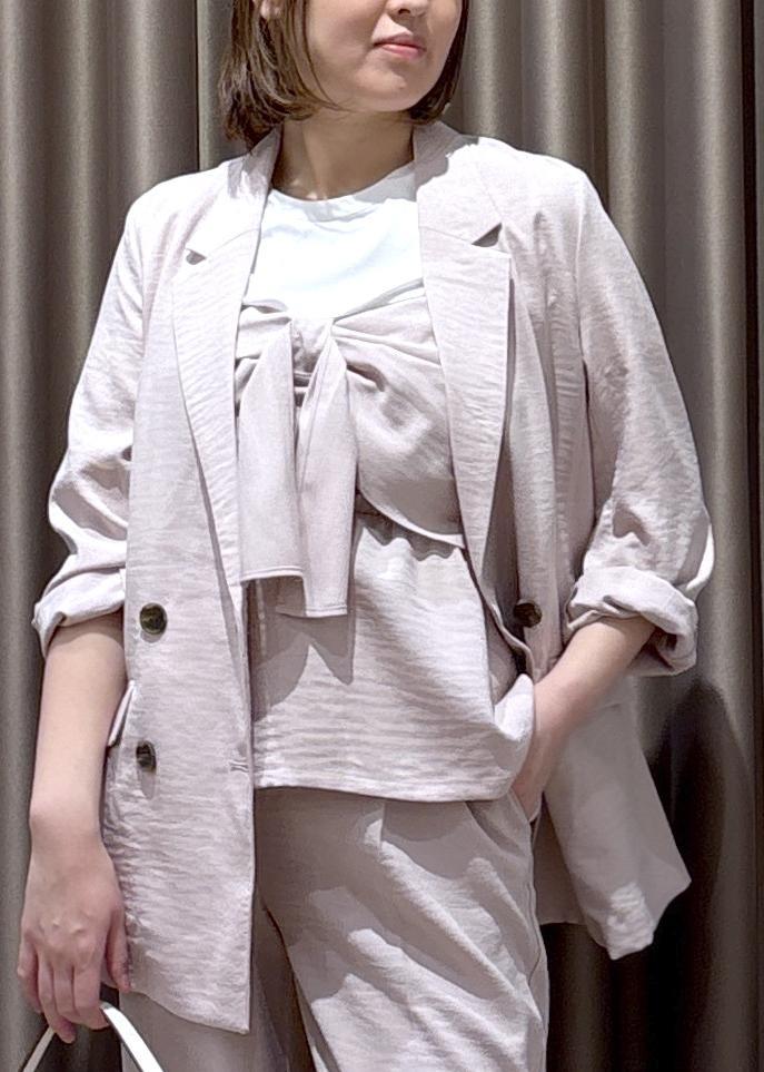美easyシリーズ3点セットで着てみました!春カラーのピンクは目を惹くVISおすすめカラーです!ボトムスはデニムに変えていただくとカジュアルにも着ていただけます!