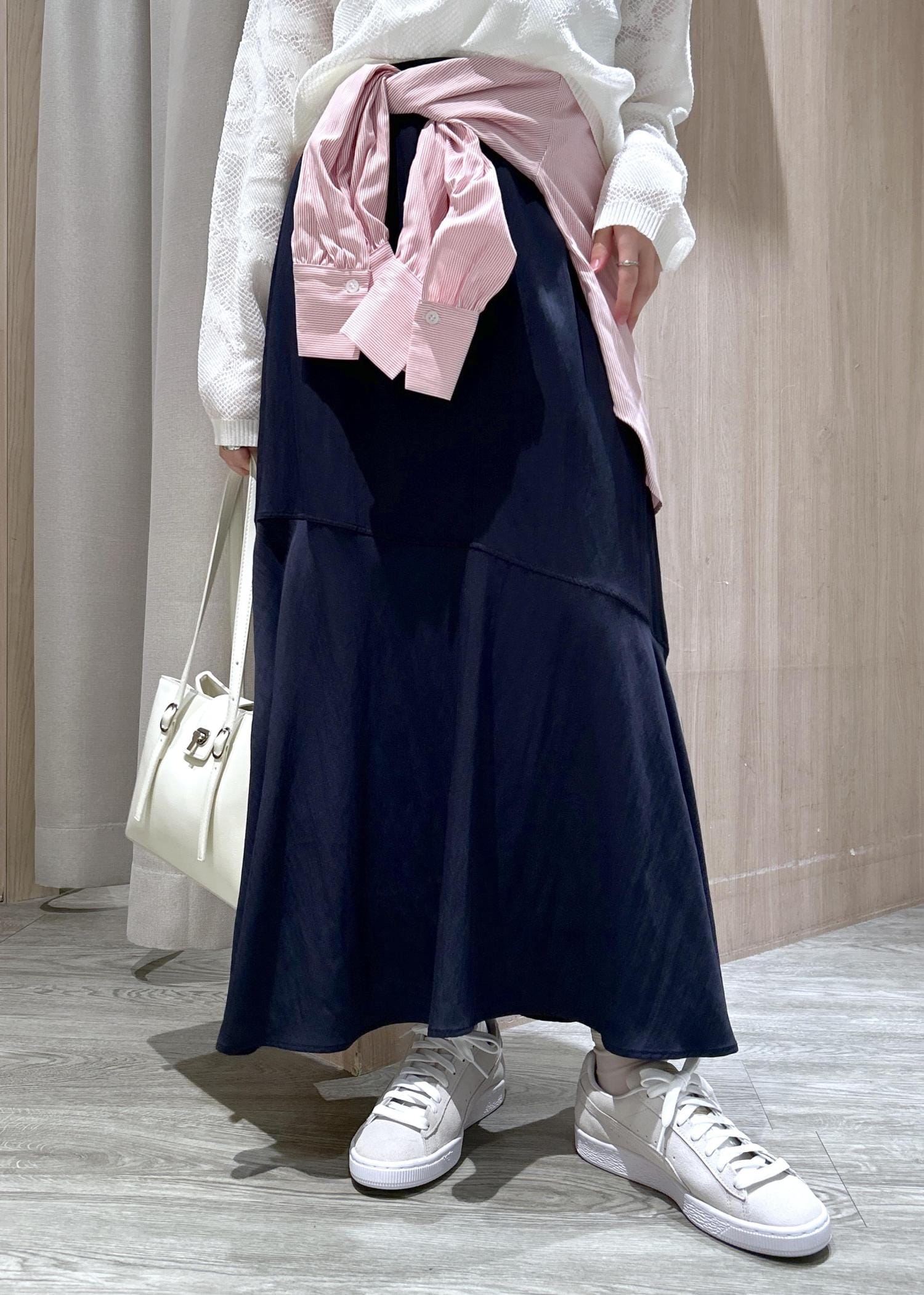 VISサテンツイルマーメイドスカートネイビー / F¥5,929レビュー身長155cm、スニーカーを履いて足首が隠れる長さです。