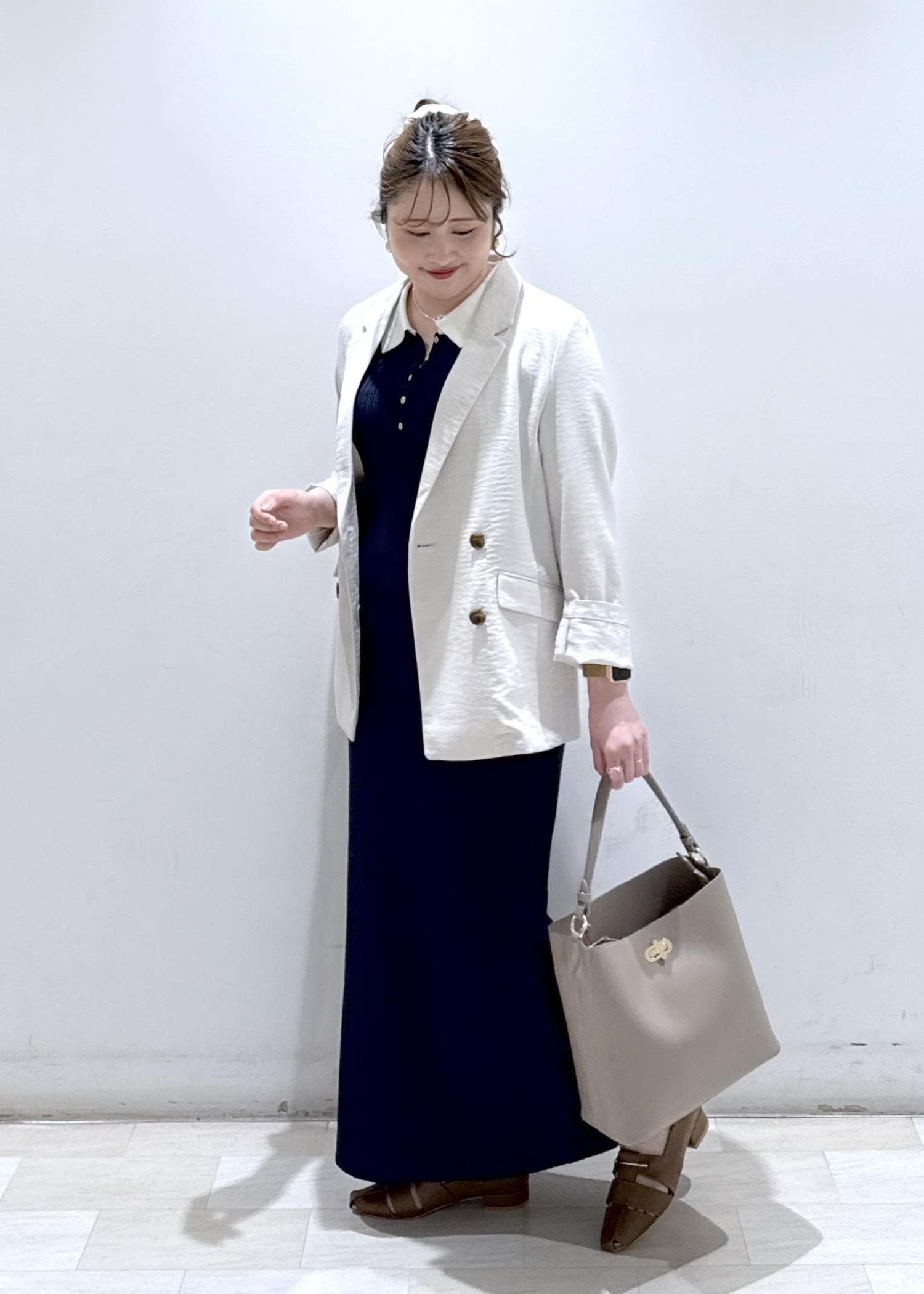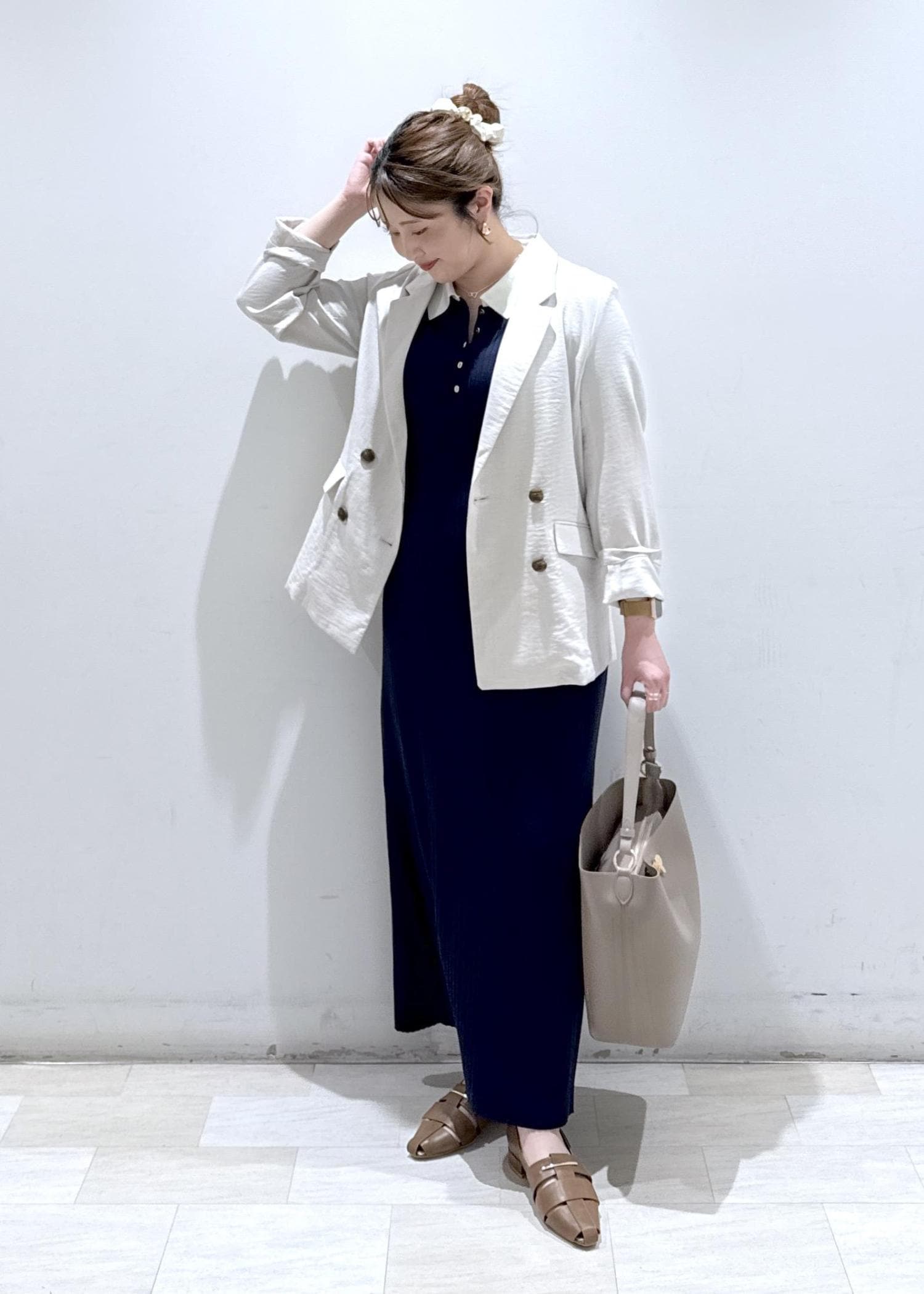 今回は新作で入荷しました、襟付きのポロロングワンピースにシンプルにジャケットと合わせて綺麗めカジュアルコーデにしてみました。襟付きではありますが、ボタンを第二ボタンほど外すとVネックにもなりますので骨格ストレートさんでも身体が大きくなることなく着れますよ♪
