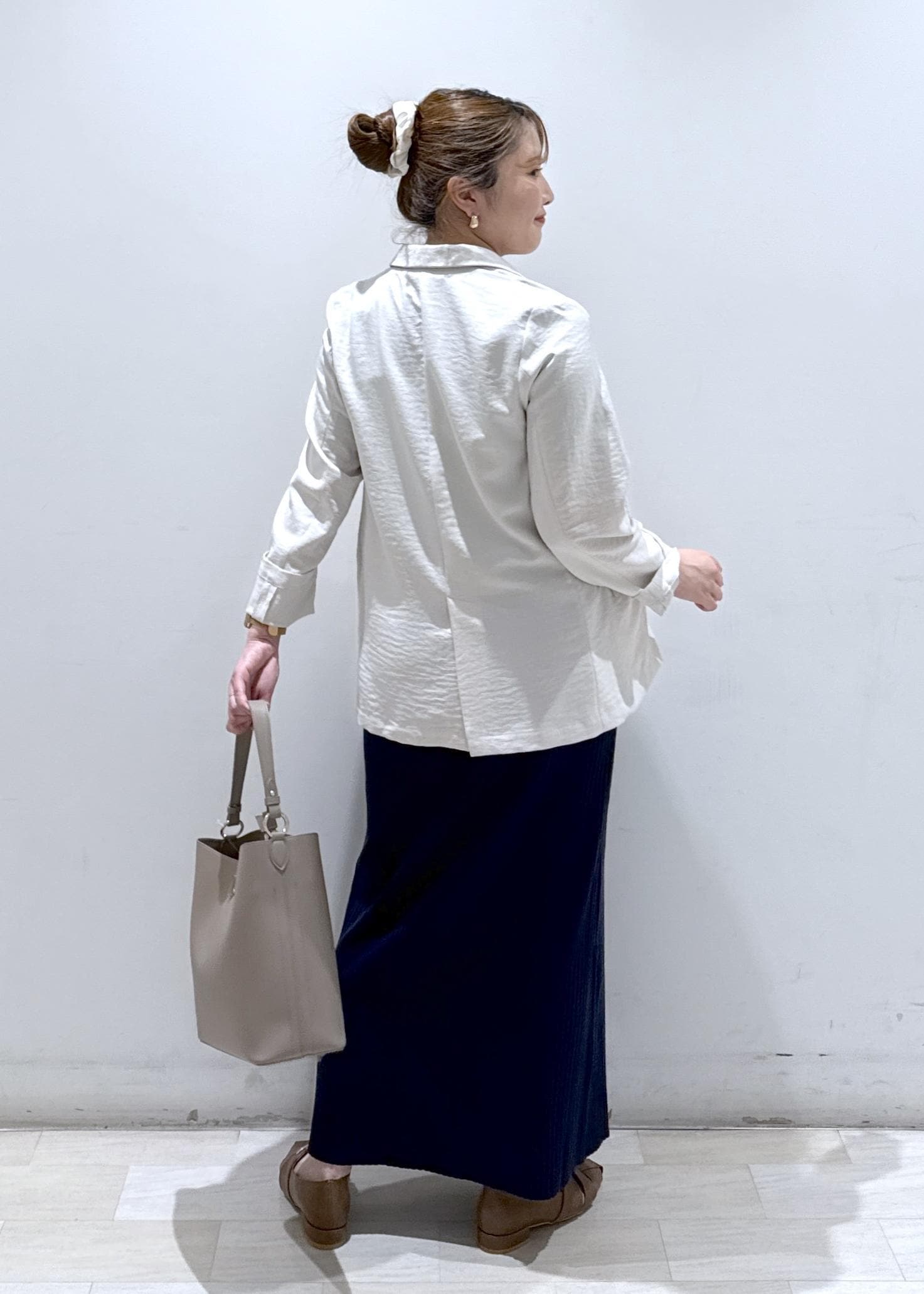 一枚でだと体型が不安!な方はジャケットで隠すと、お尻周りもカバーできちゃいます◎また美easyのリネンライクジャケットはシワにもなりにくく、接触冷感付きでもあるのでオススメです。