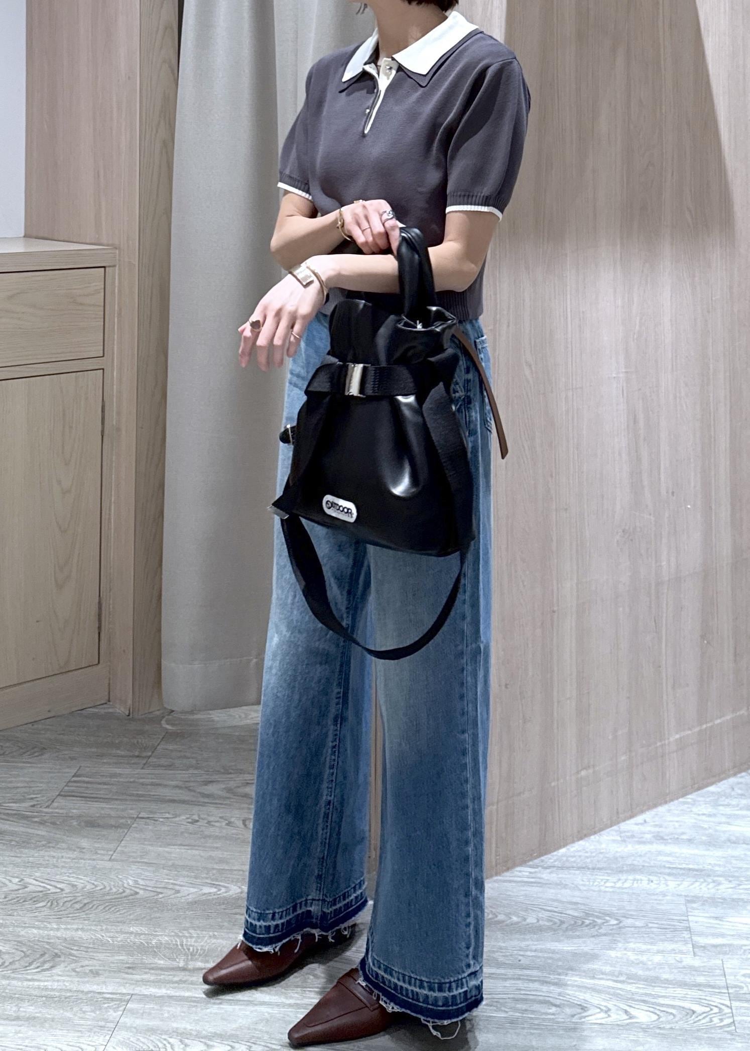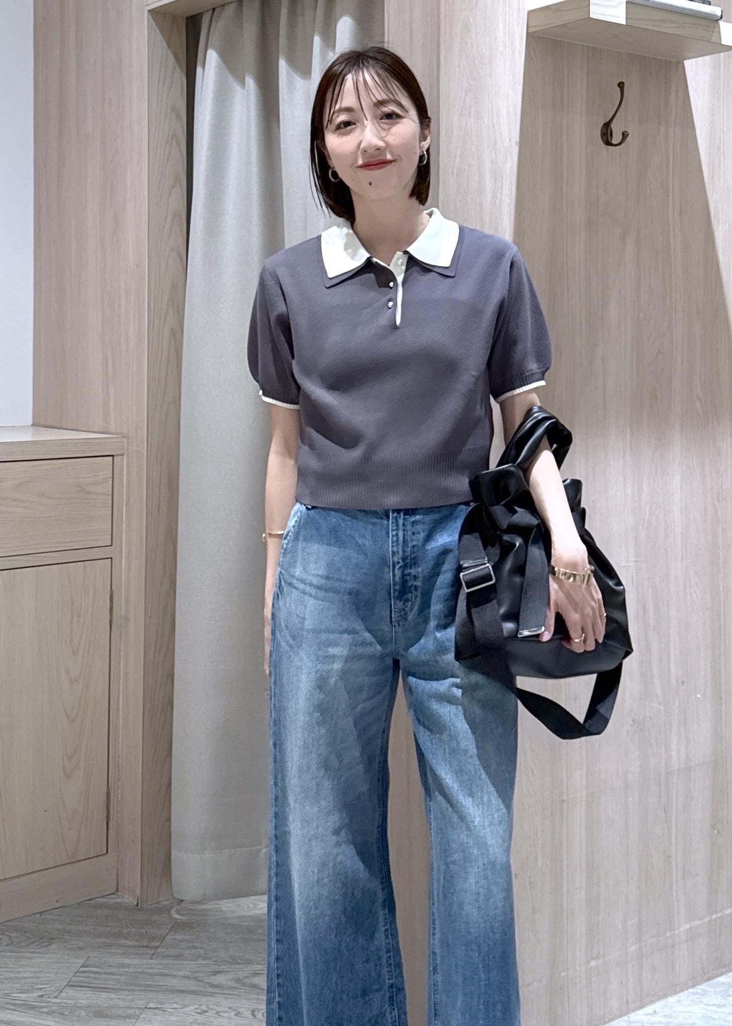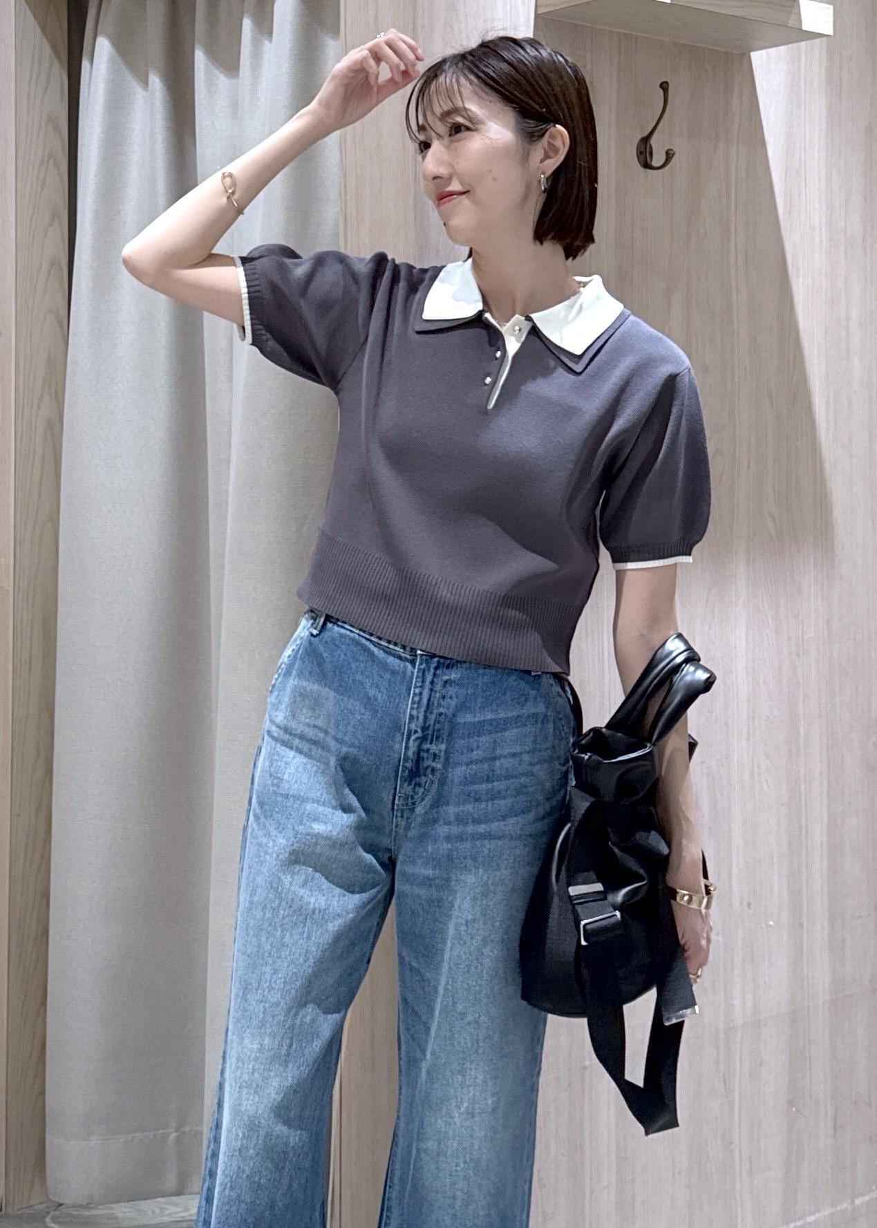 バイカラーが可愛いポロニットにデニムを合わせた大人のシンプルカジュアルコーデです♪