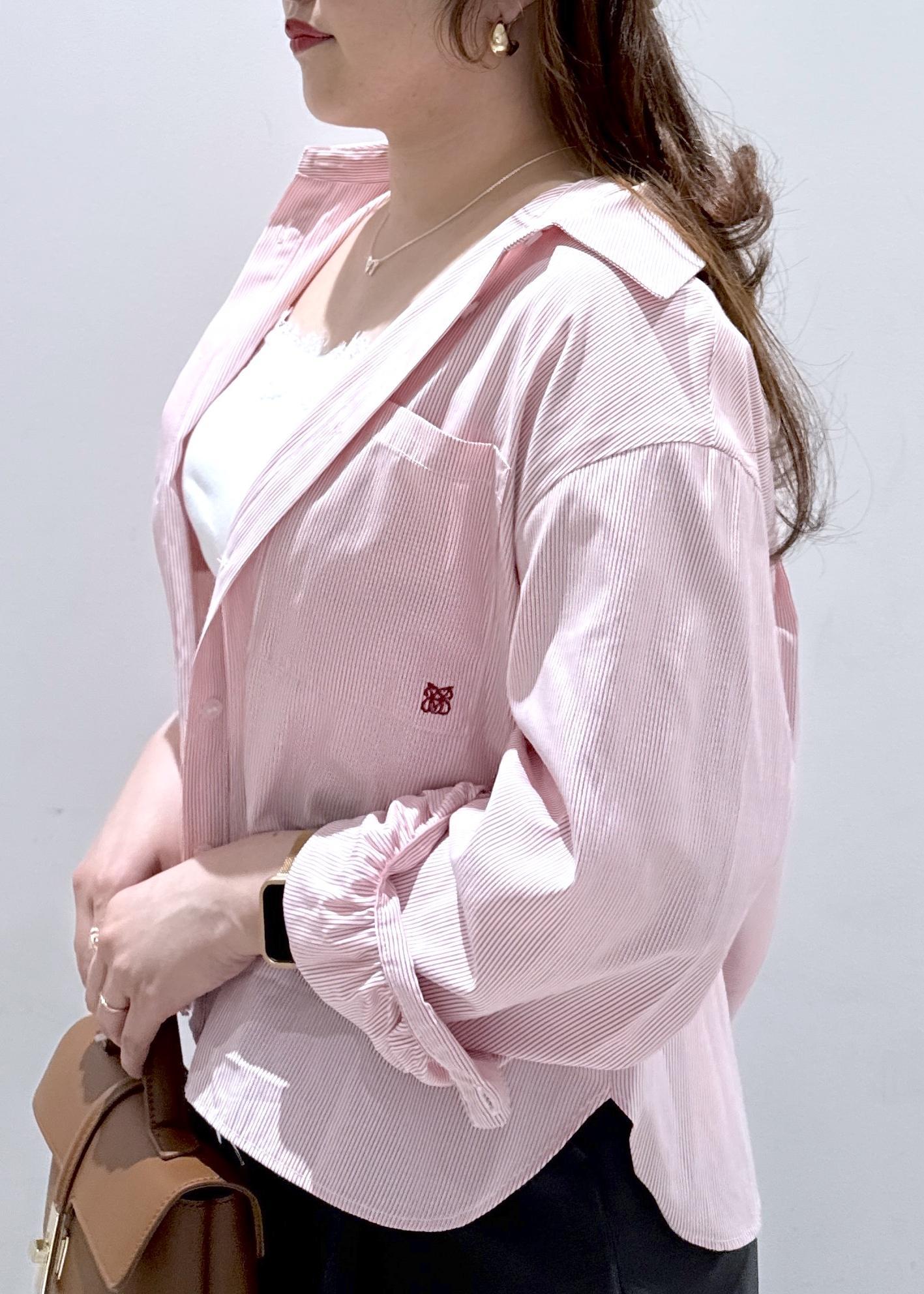 VIS【SWIMMER×VIS】ポイント刺しゅうストライプシャツレッド系 / F¥6,589レビューVIS×スイマーとのコラボアイテム⭐︎サッと羽織れる柔らかいシャツで、襟の後ろにはロゴマーク入り!カラーも豊富でストライプ柄なので腰に巻いたりカジュアルに使えます。身長157cmで腰辺りぐらいのショート丈になるので、ハイウエストのボトムスか羽織りに使うとアレンジしやすいです。