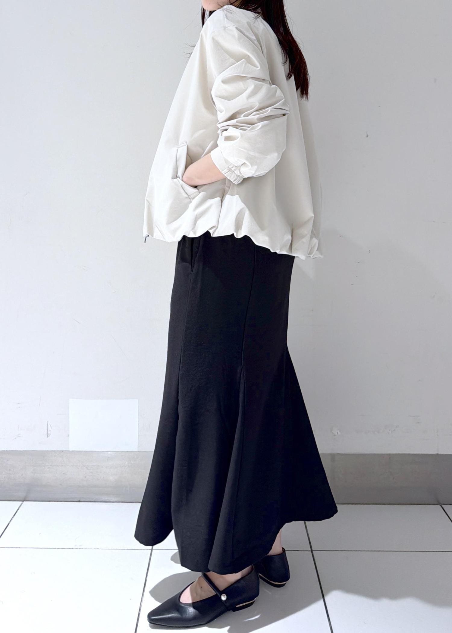 同じシリーズの『美easyリネンライクワイドパンツ』(BVS36100)はSS〜Sサイズを着用しているのですが、私は骨格ウェーブで腰周りの張りが気になるのでマーメイドスカートはSサイズにしました!