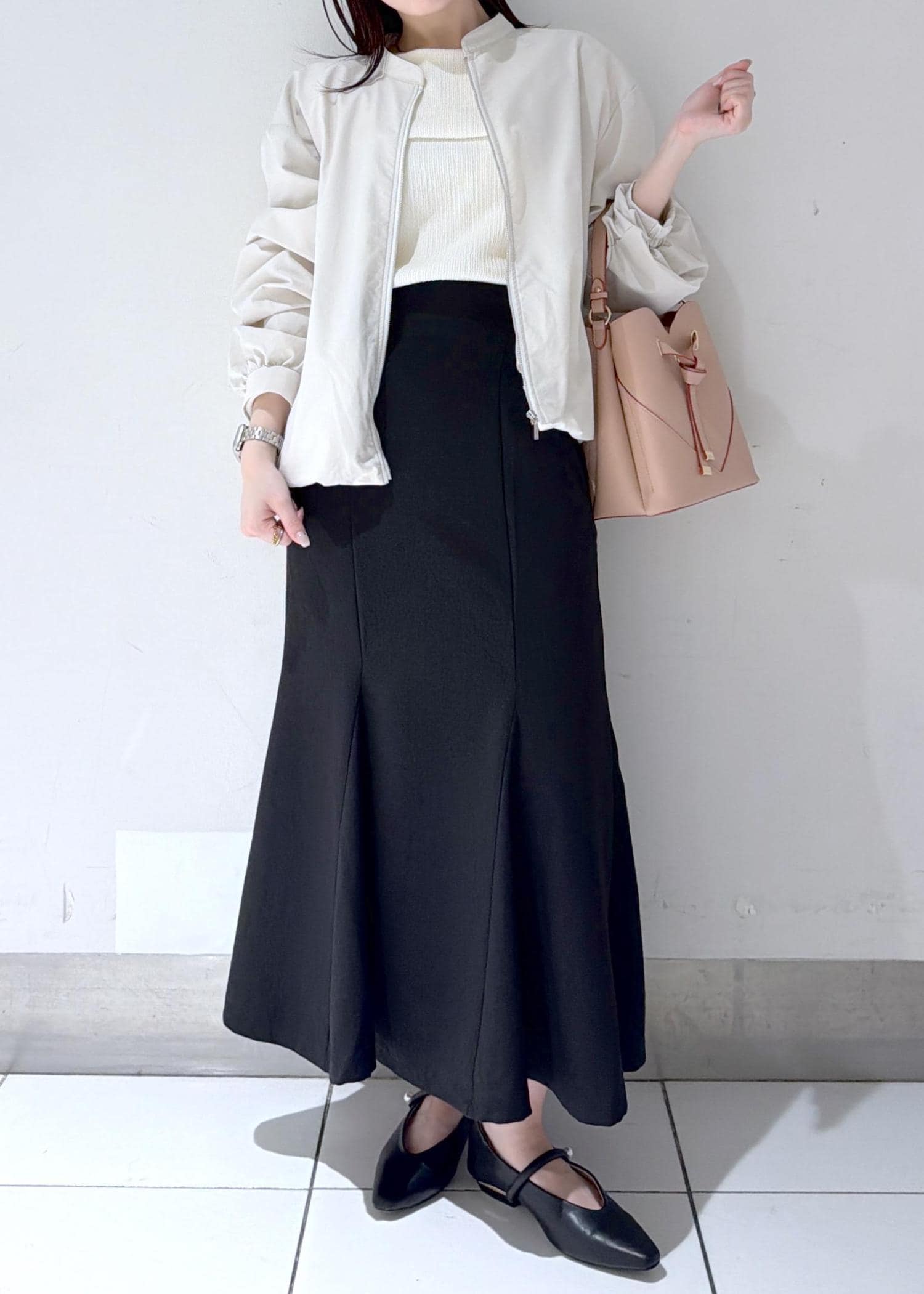 軽やかな淡色ブルゾンを羽織った、春らしいフェミニンコーデ