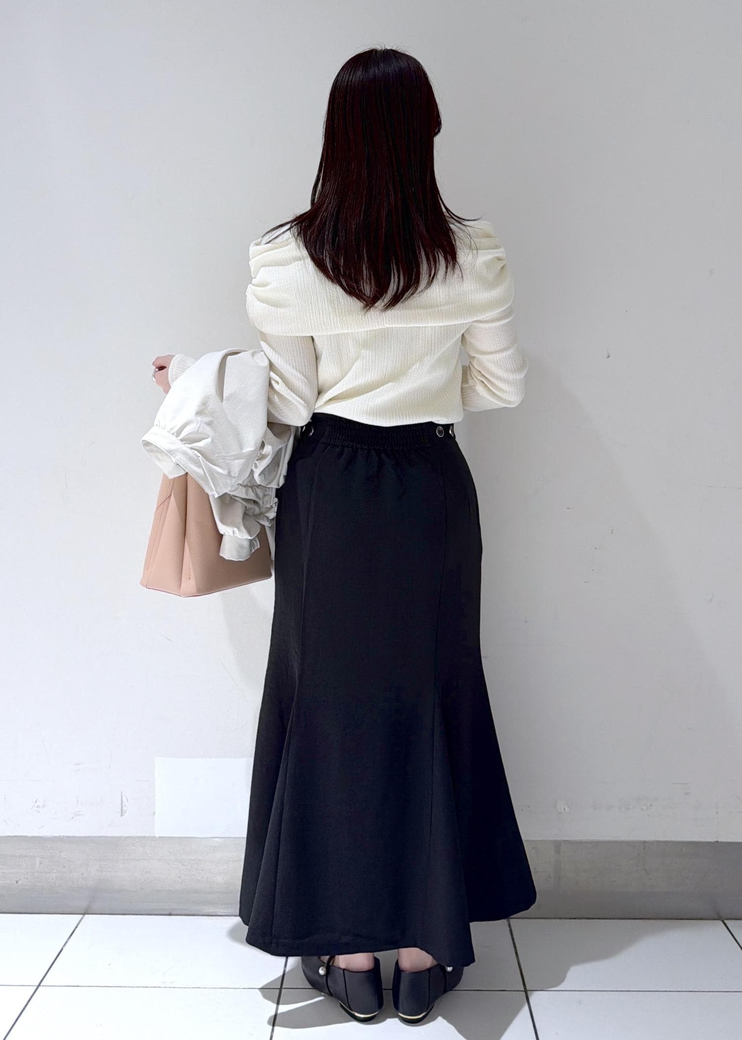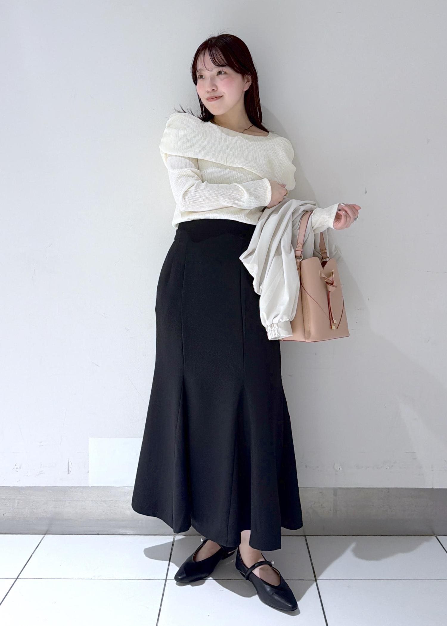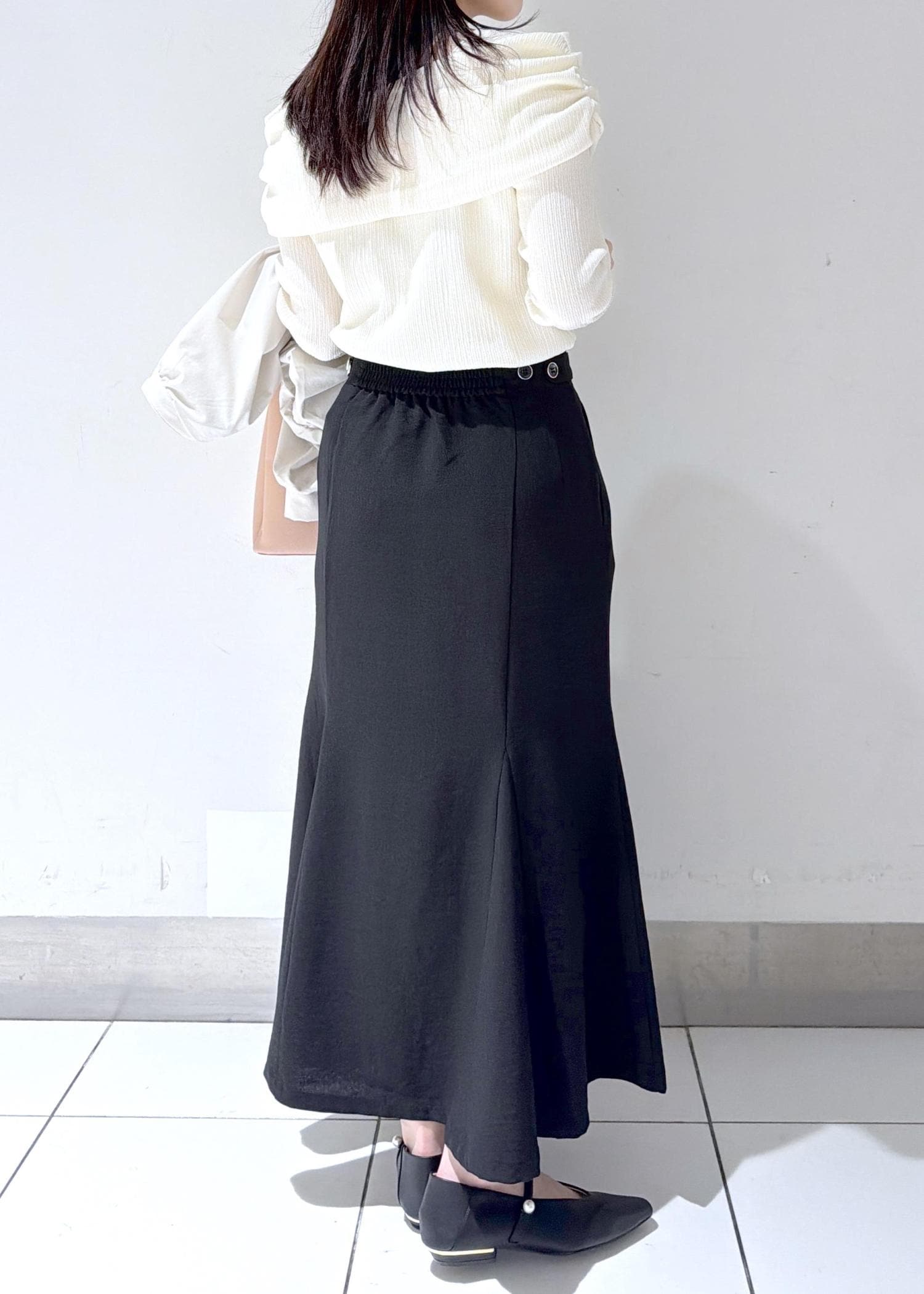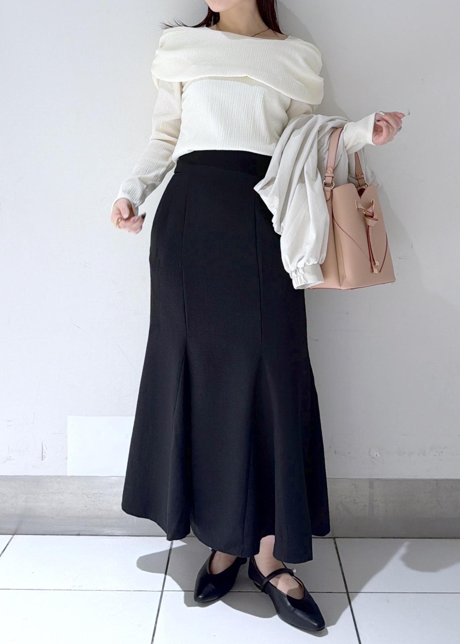 ブラックのマーメイドスカートで全体を引き締め、大人っぽく上品な印象に仕上げました✨