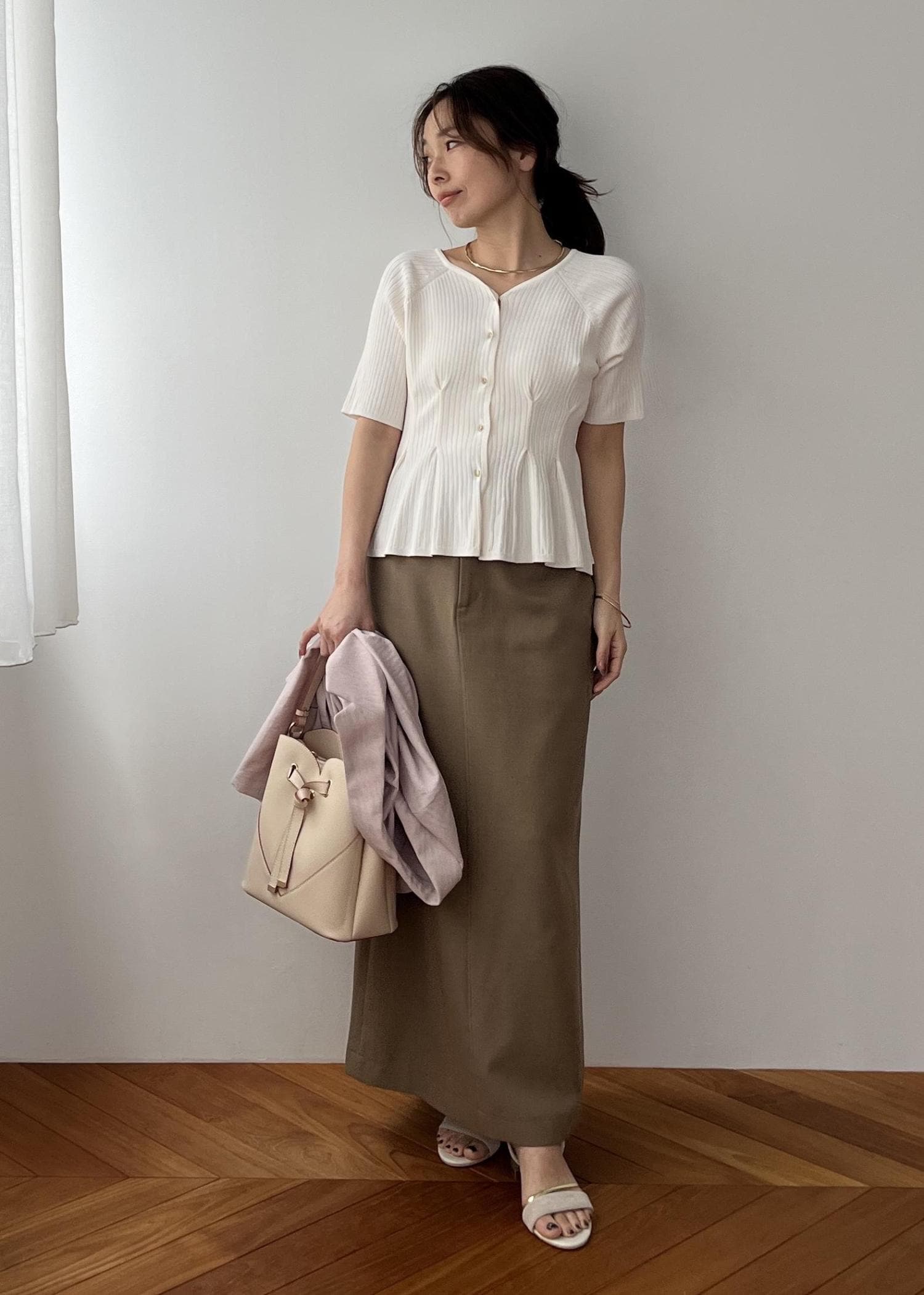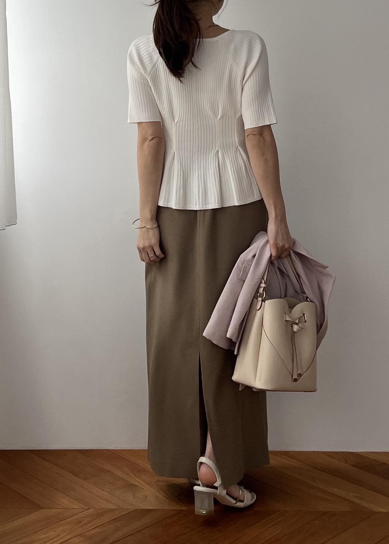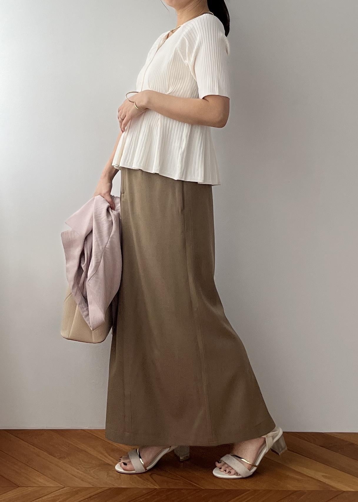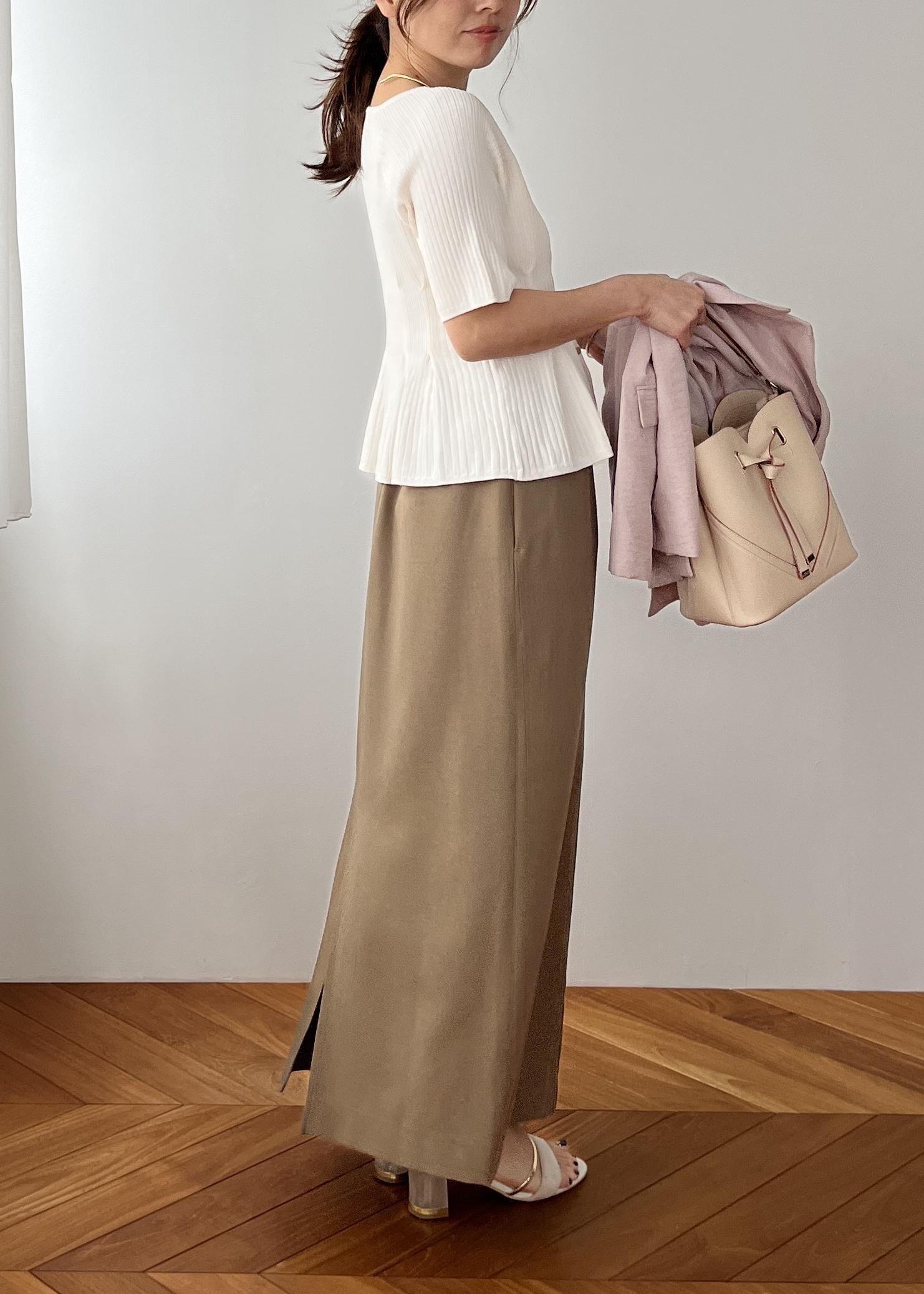 コンパクトなペプラムニットに、すっきりIラインのスカート合わせでバランス◎