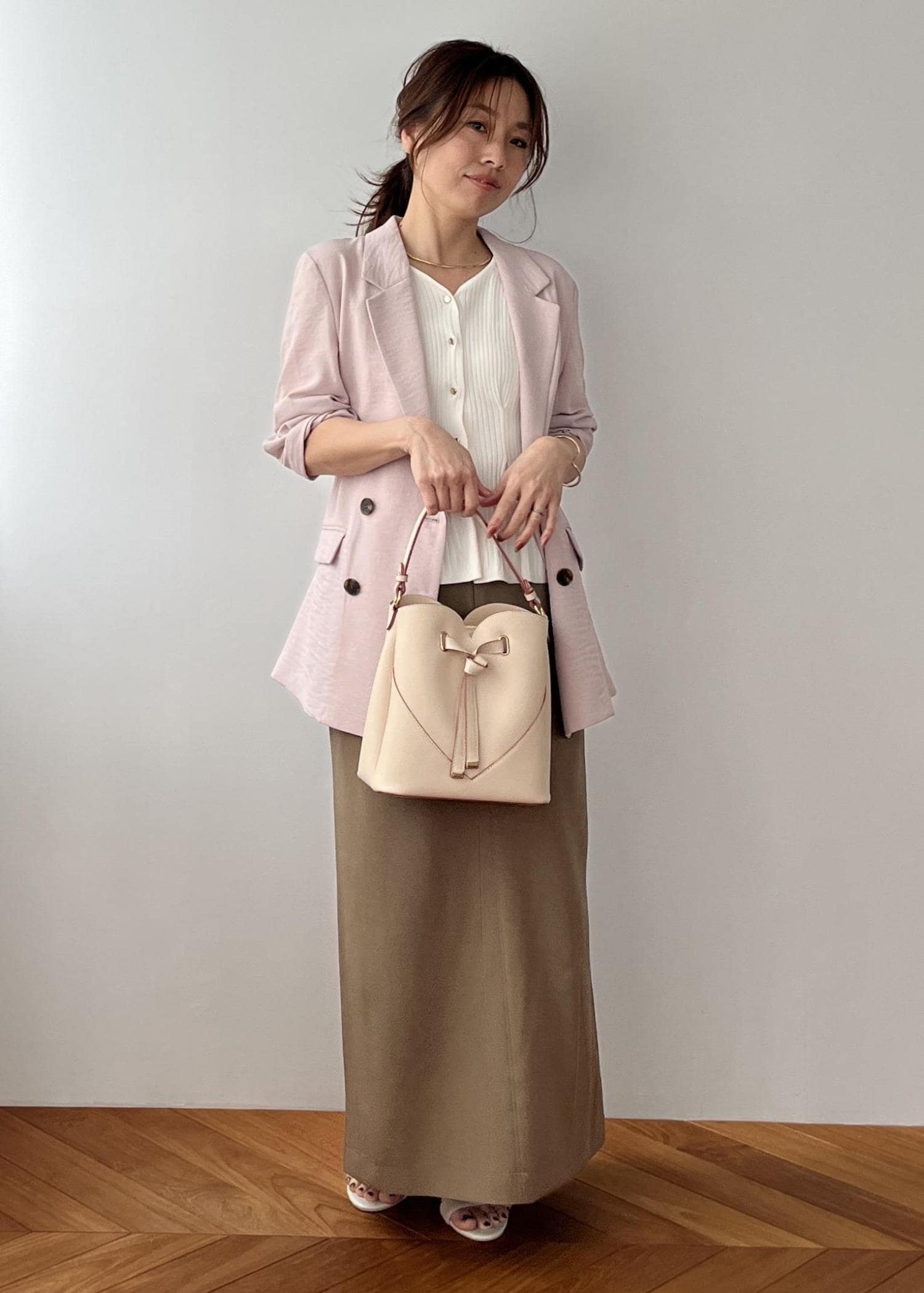 甘さはありつつも、カラーを落ち着かせることで大人っぽく仕上げたスタイリング。