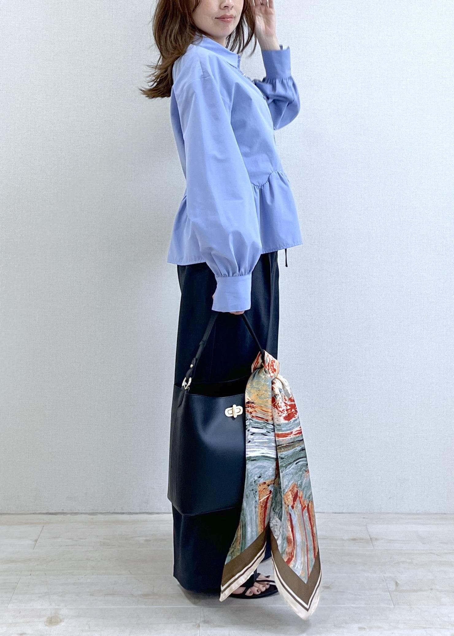 バッグに巻いたスカーフで、さりげなくこなれ感もプラス。