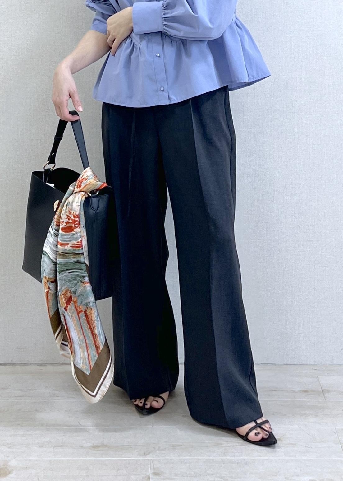 落ち感のあるワイドパンツ合わせで、全体はすっきりとした印象に◎