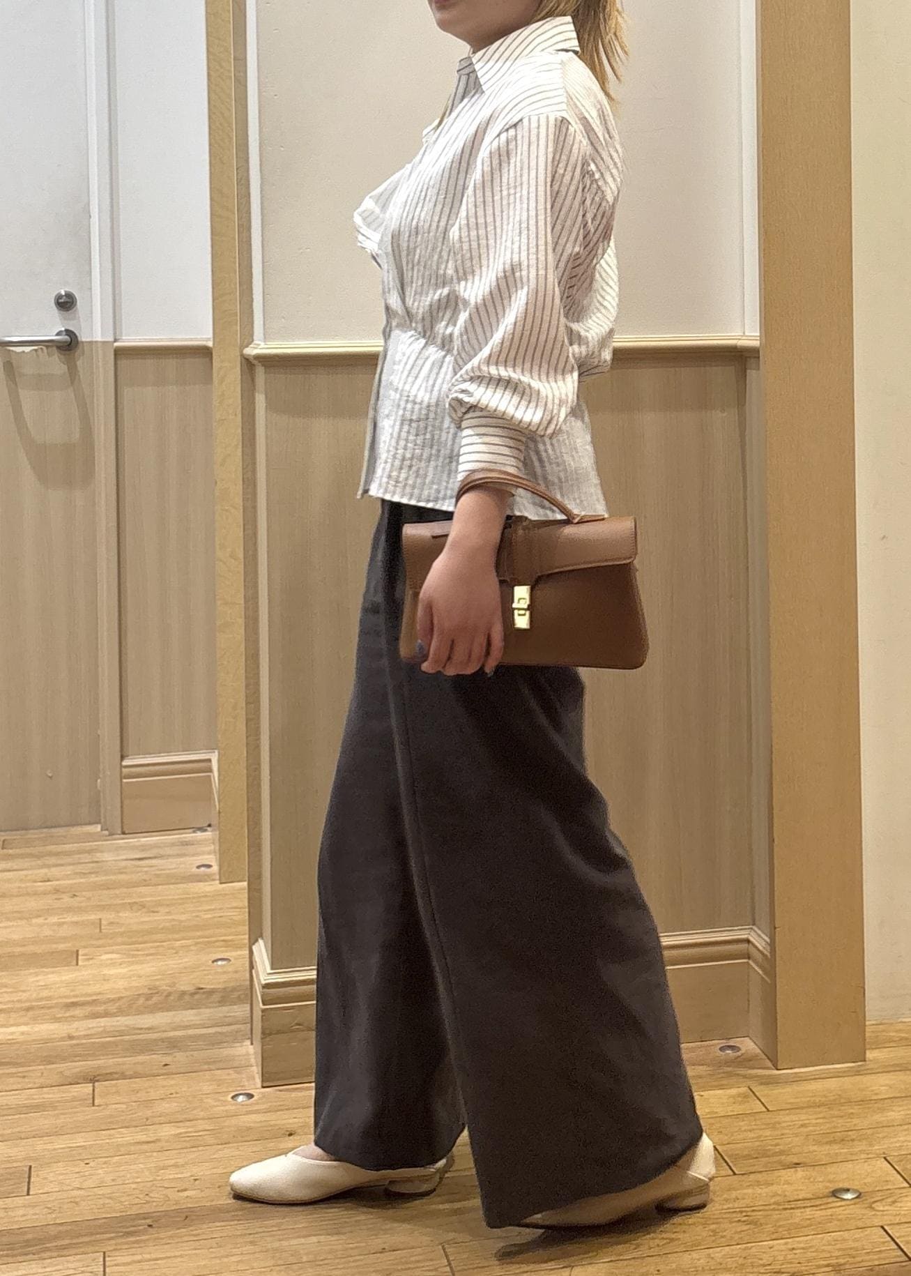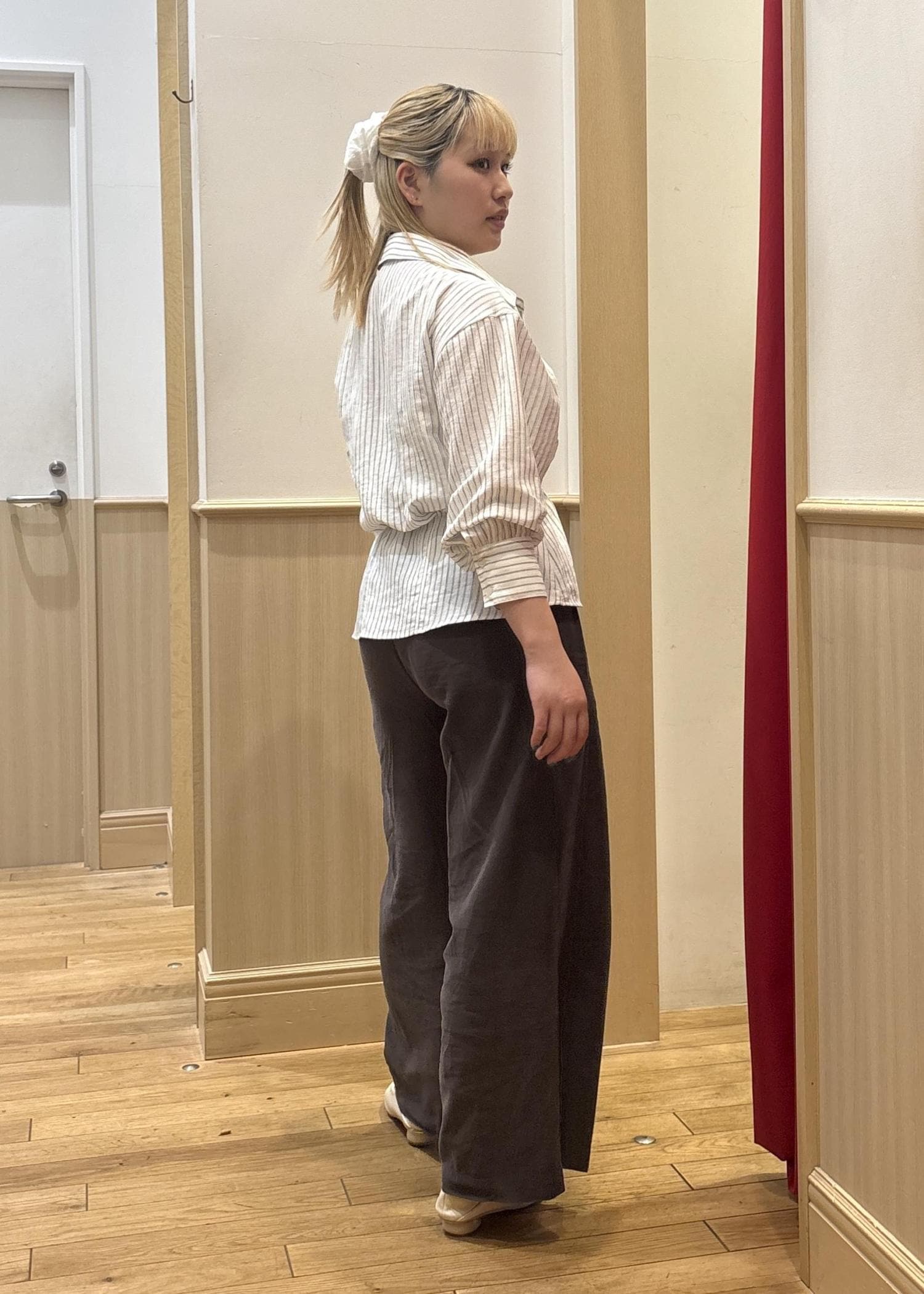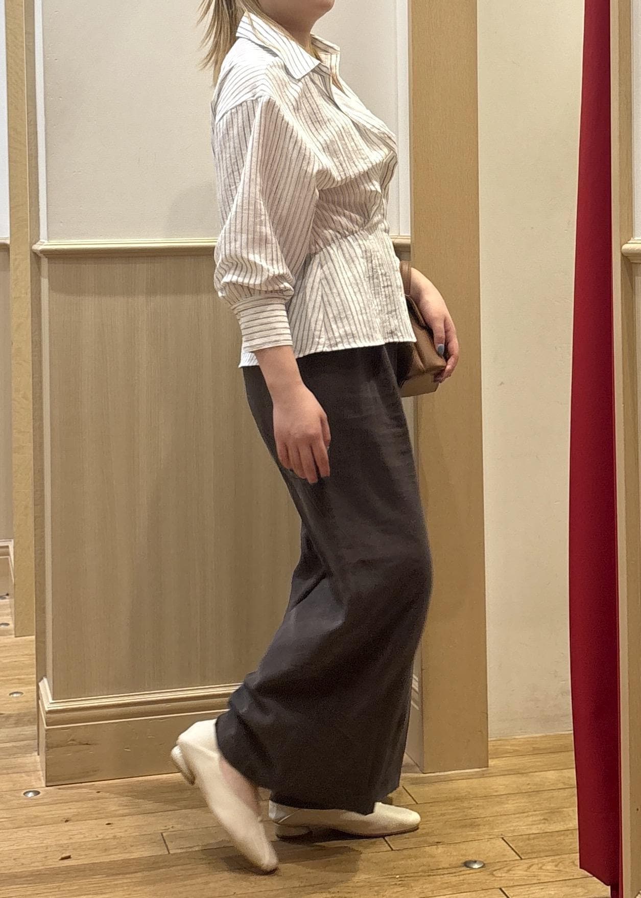 パンツが少し生地感の薄いものでカジュアル寄りなアイテムなので、シャツも少し生地感を合わせて、カチッとしすぎないようなコーデにしました!