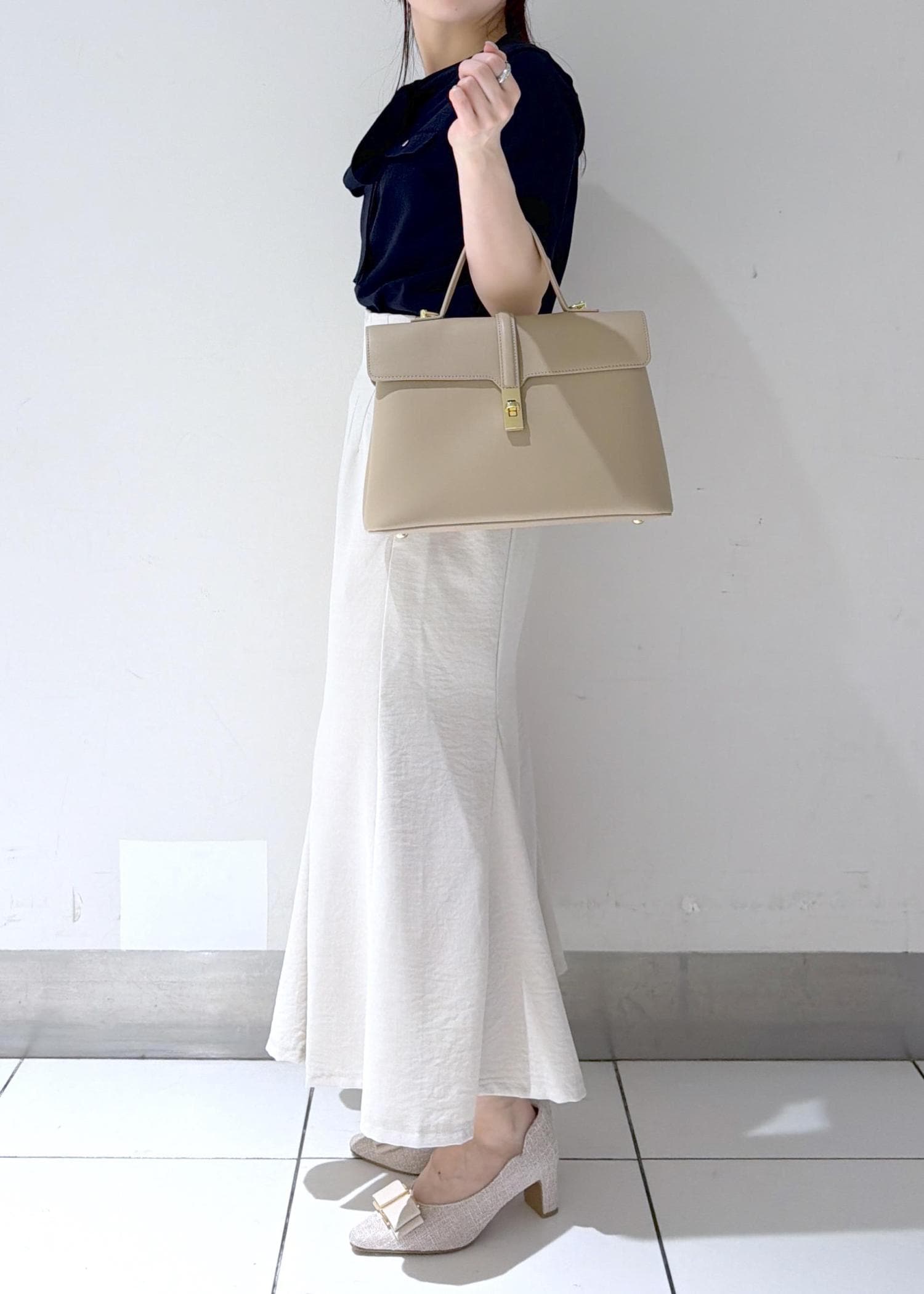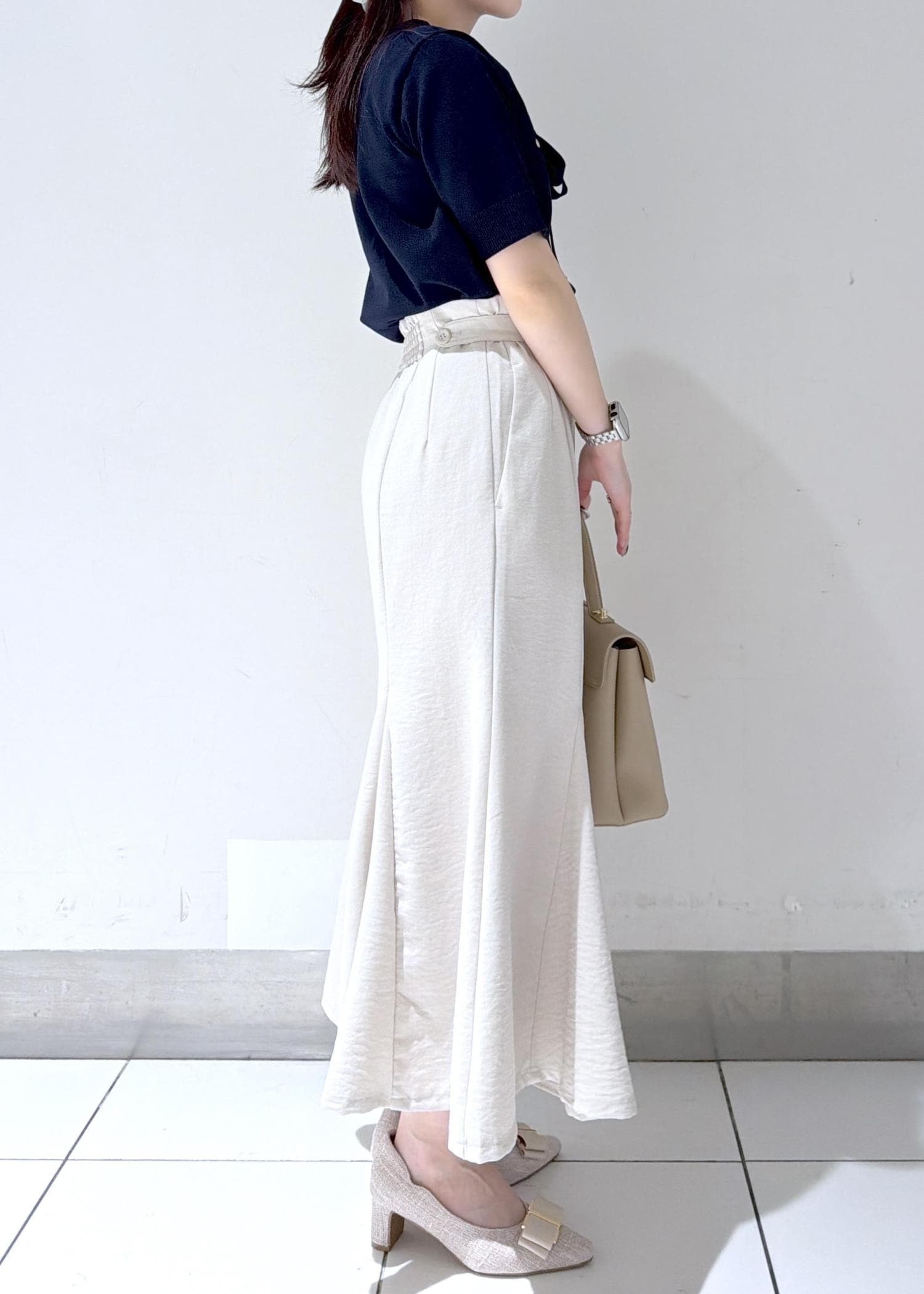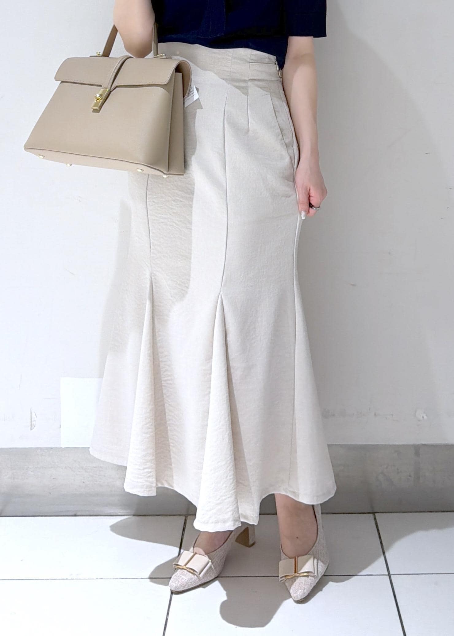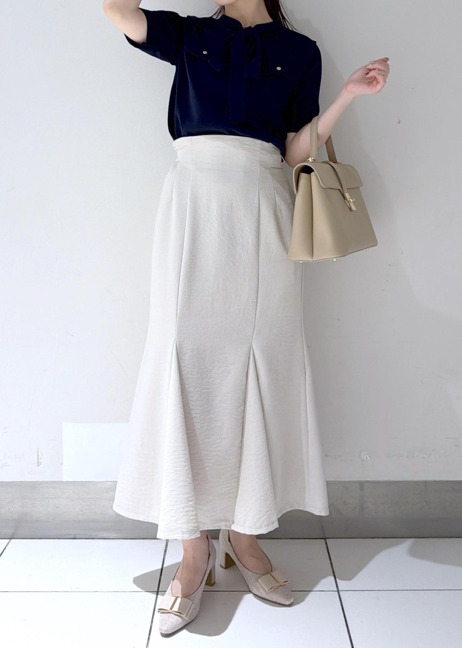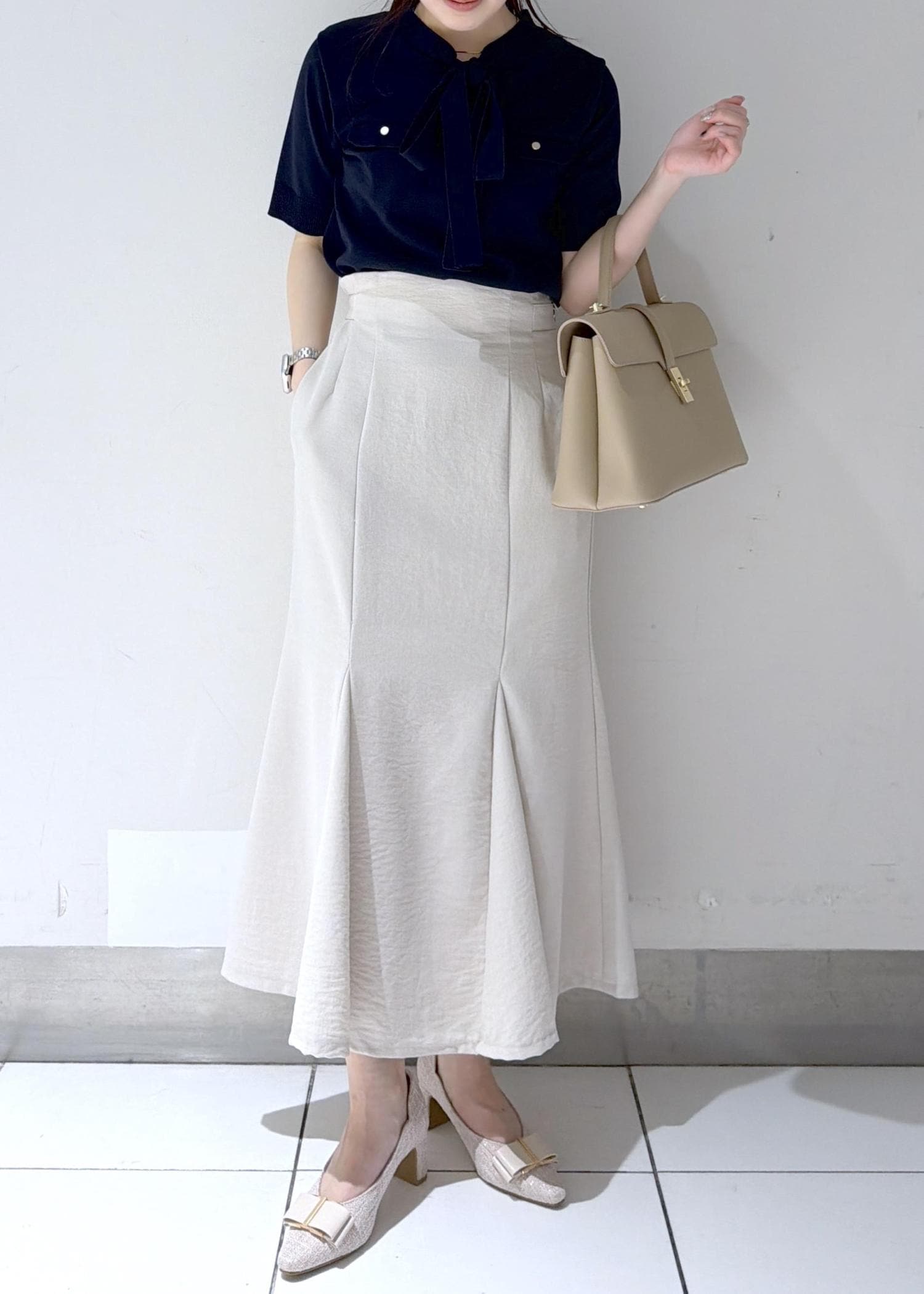 ネイビーブラウスとアイボリーのマーメイドスカートを合わせた、上品なきれいめコーデ✨