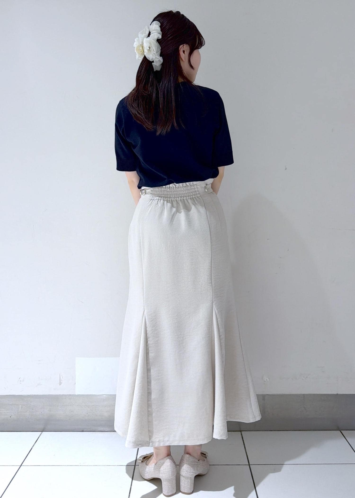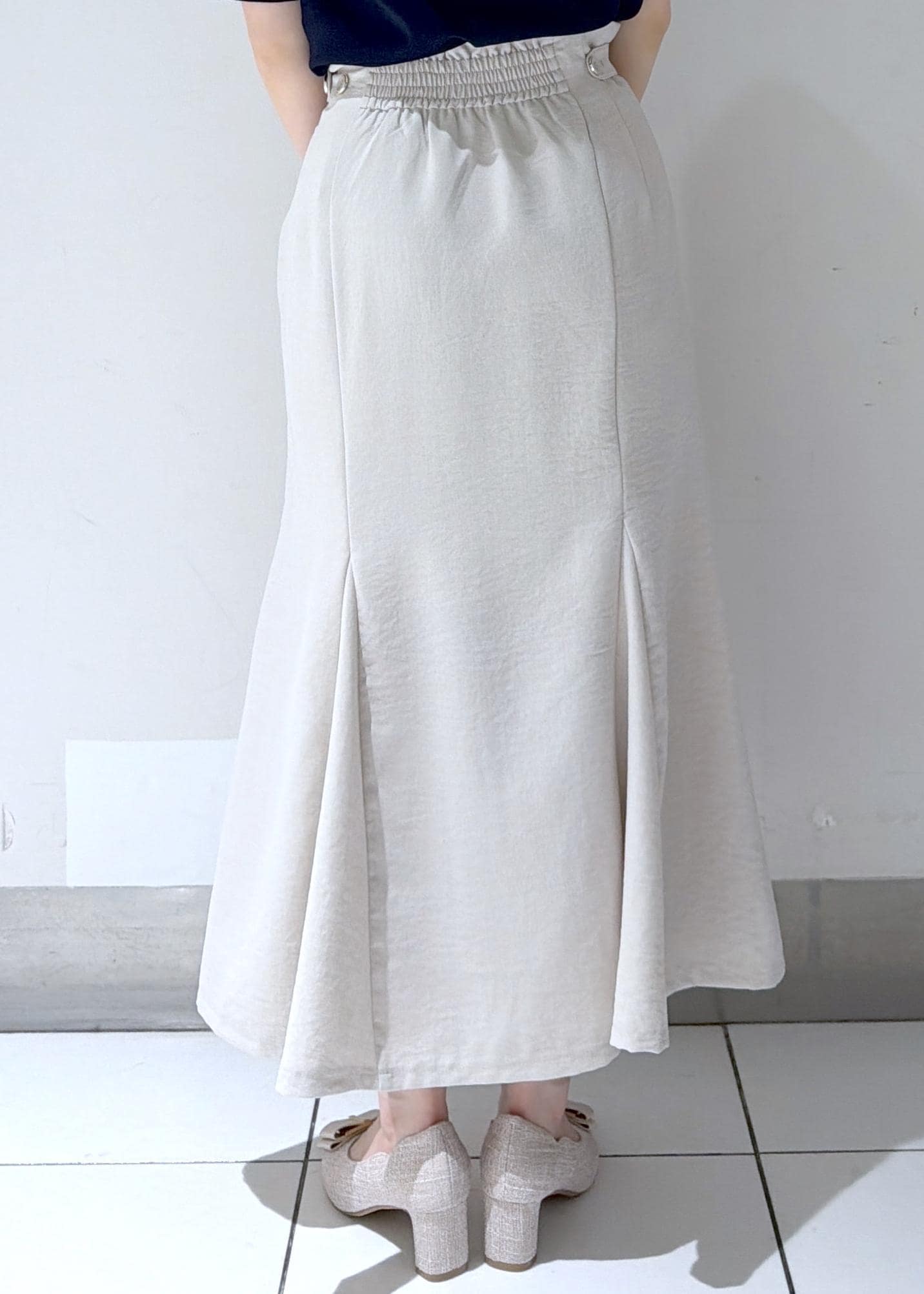 同じシリーズの『美easyリネンライクワイドパンツ』(BVS36100)はSS〜Sサイズを着用しているのですが、私は骨格ウェーブで腰周りの張りが気になるのでマーメイドスカートはSサイズにしました! -