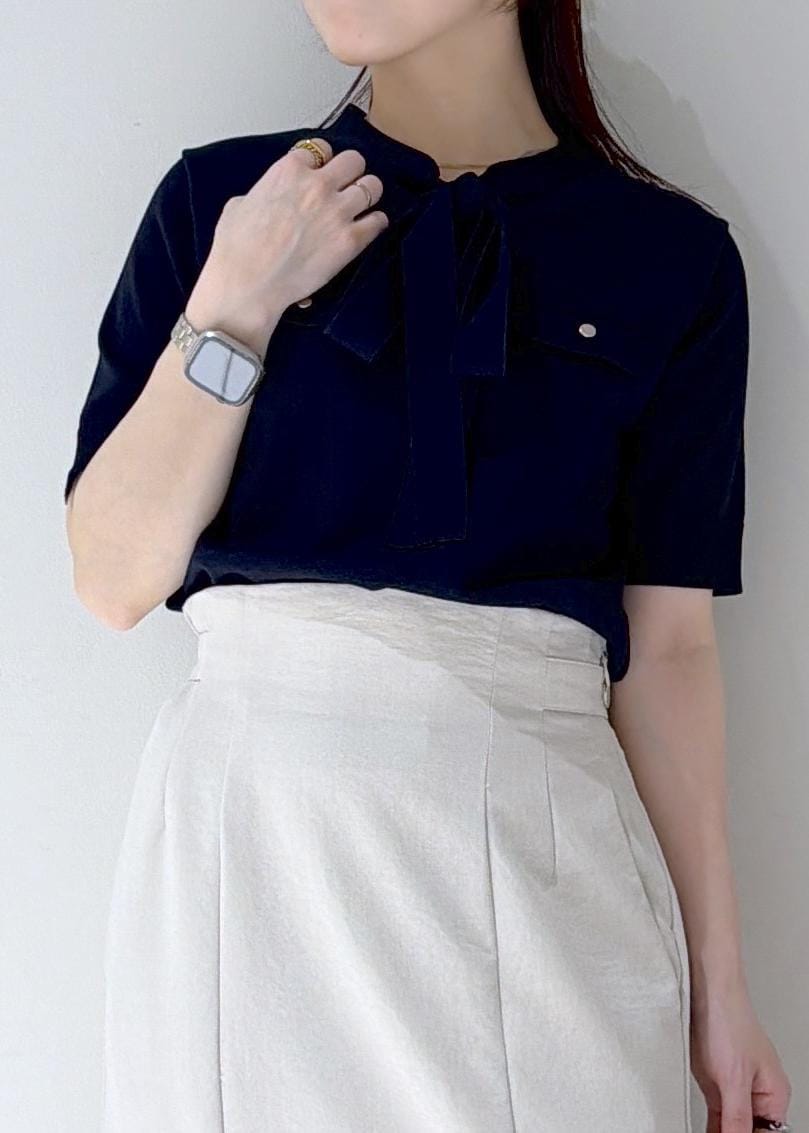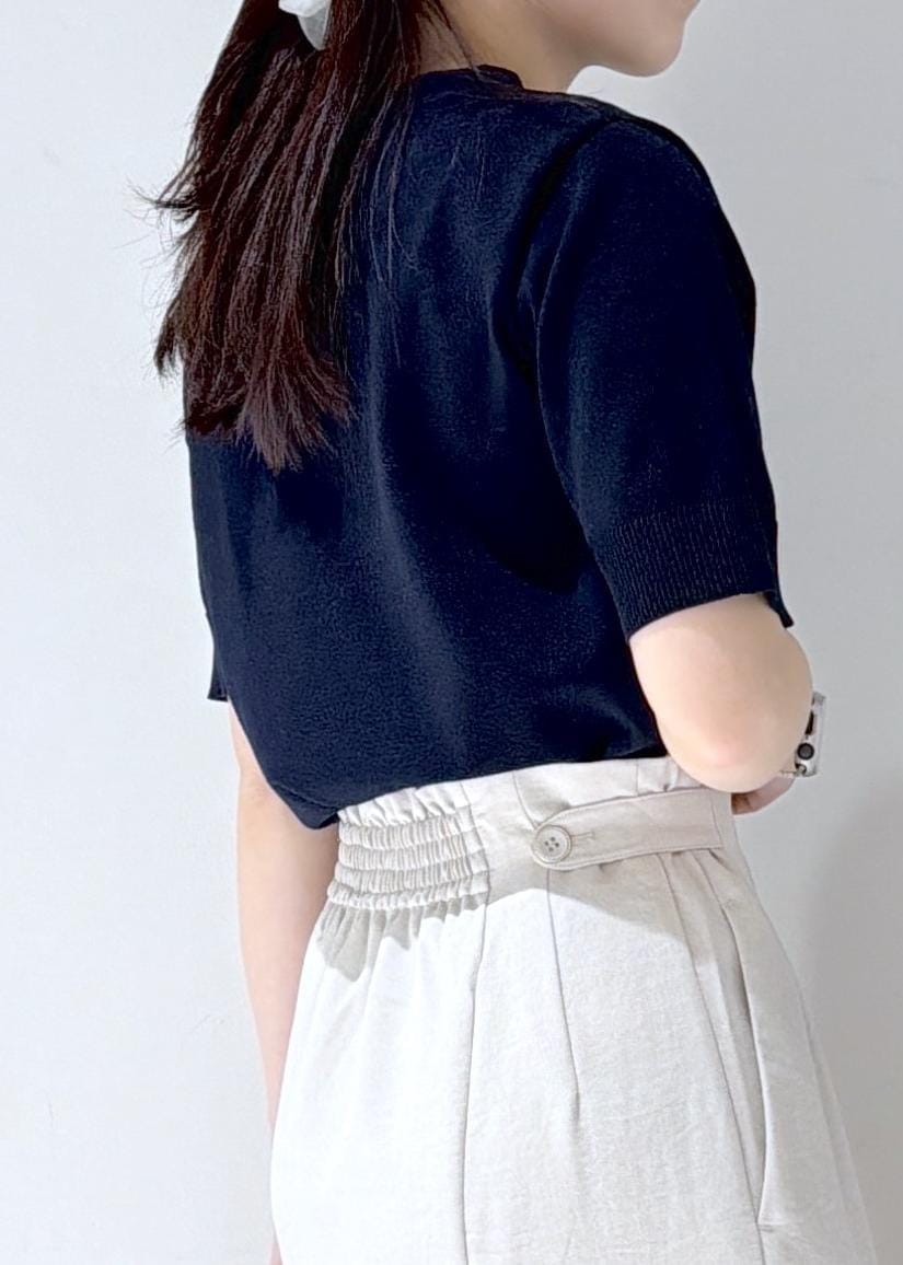 VISリボン付き半袖ニットプルオーバー/イージーケアネイビー / F¥5,489レビュー肌あたりの柔らかいニットで、コンパクト感のあるデザインなのでキレイ見えするシルエットでした!