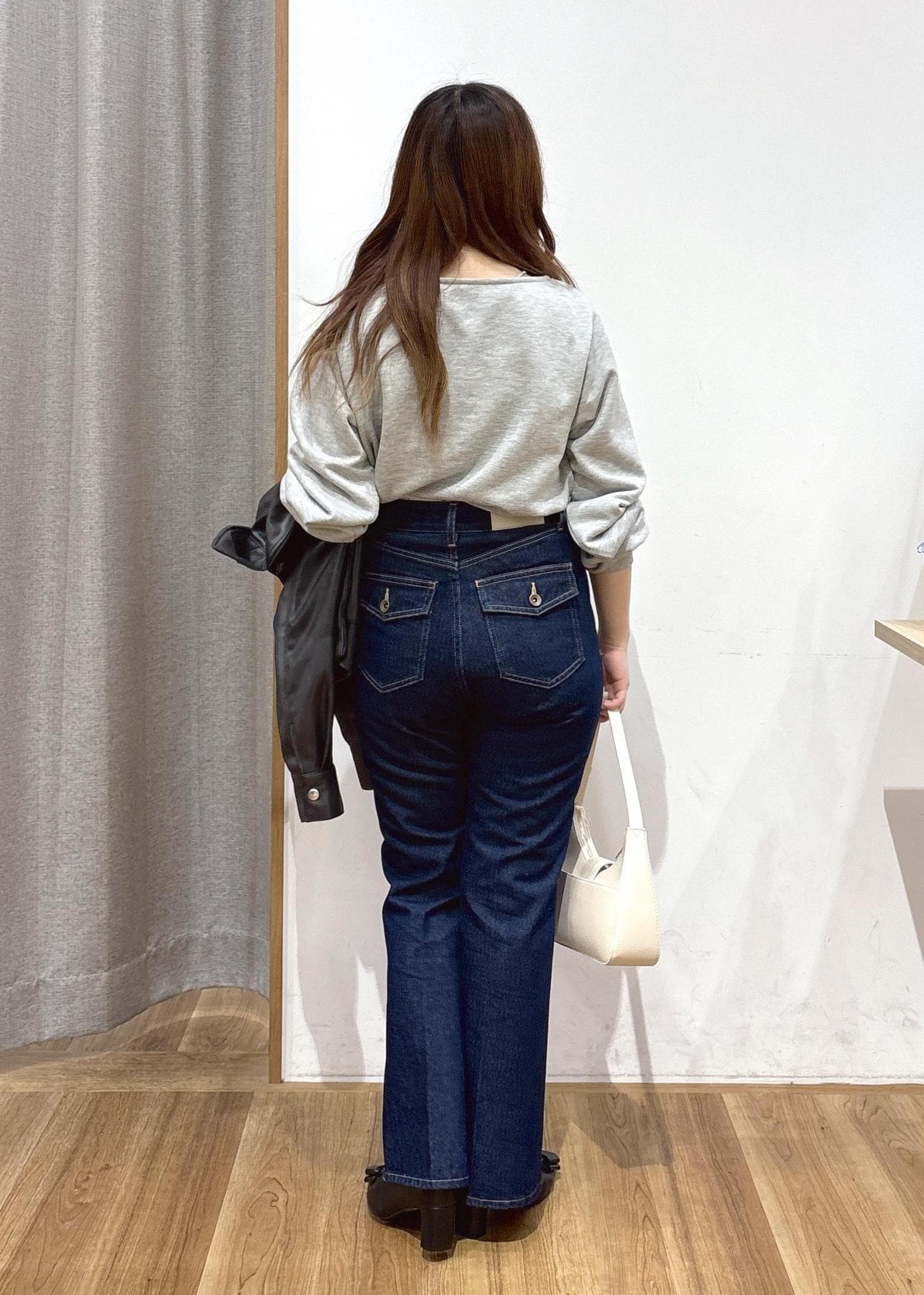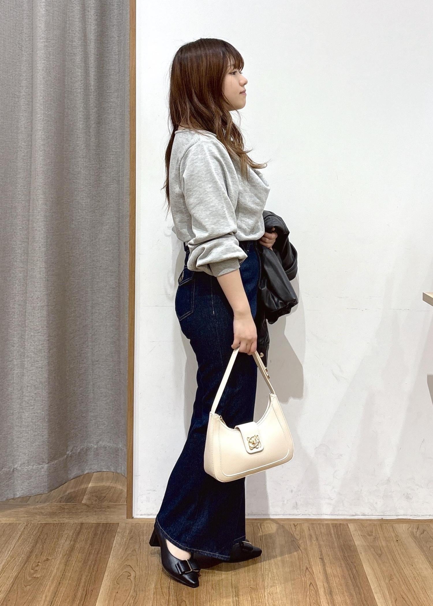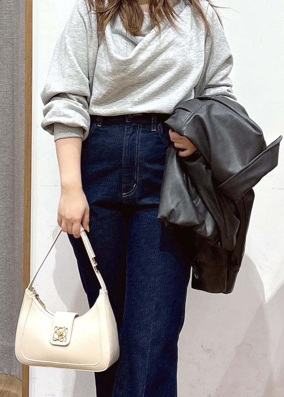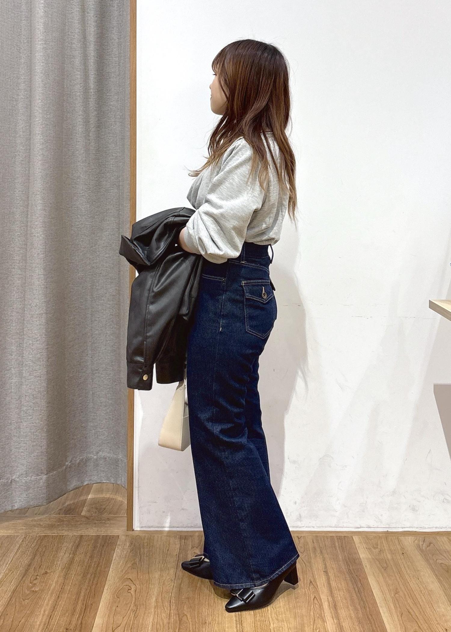 細見えしつつお腹周りや肩周りをすっきりと見せてくれるように、細身のパンツ+ゆるっとしたサイズ感のトップスでコーディネートを組んでみました。